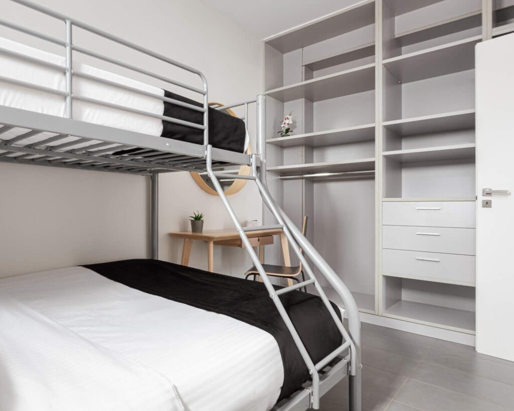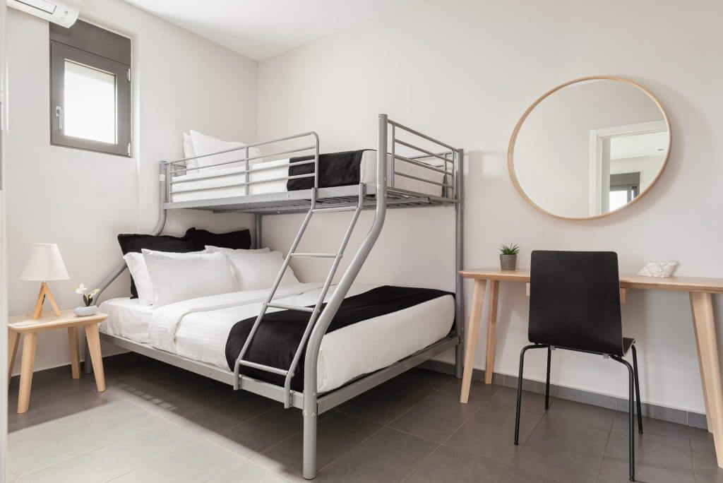This thoughtfully designed residence features two bedrooms to cater to various accommodation needs. The first bedroom offers a sumptuous queen-size bed, ensuring a restful night’s sleep, while the second bedroom is arranged with bunk beds, making it ideal for families or groups of friends.