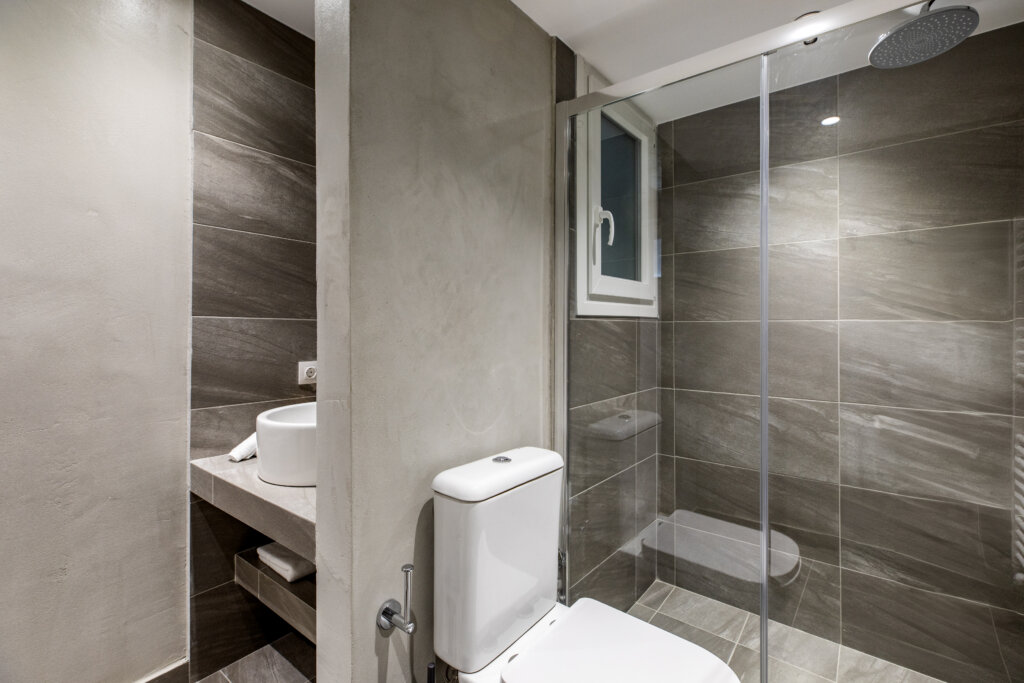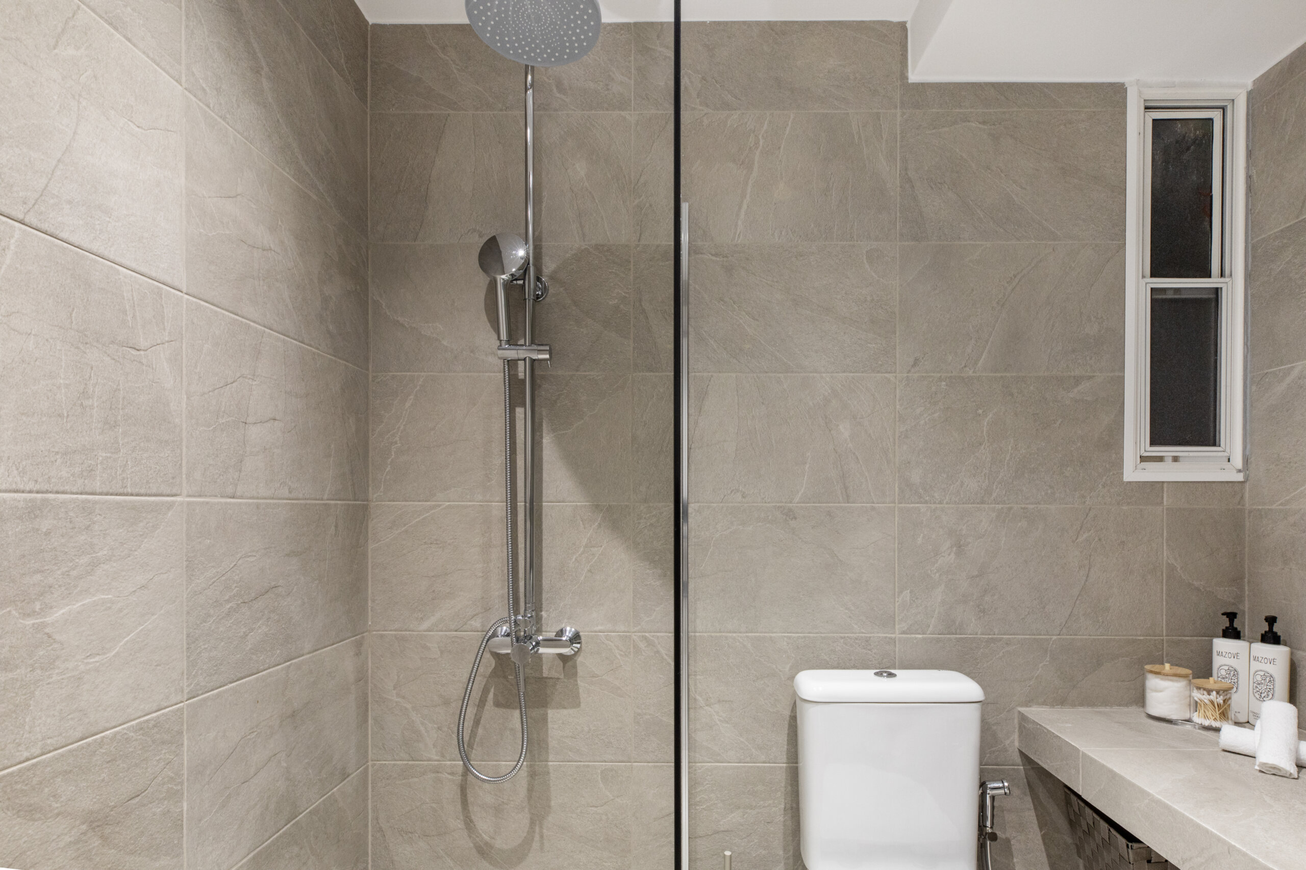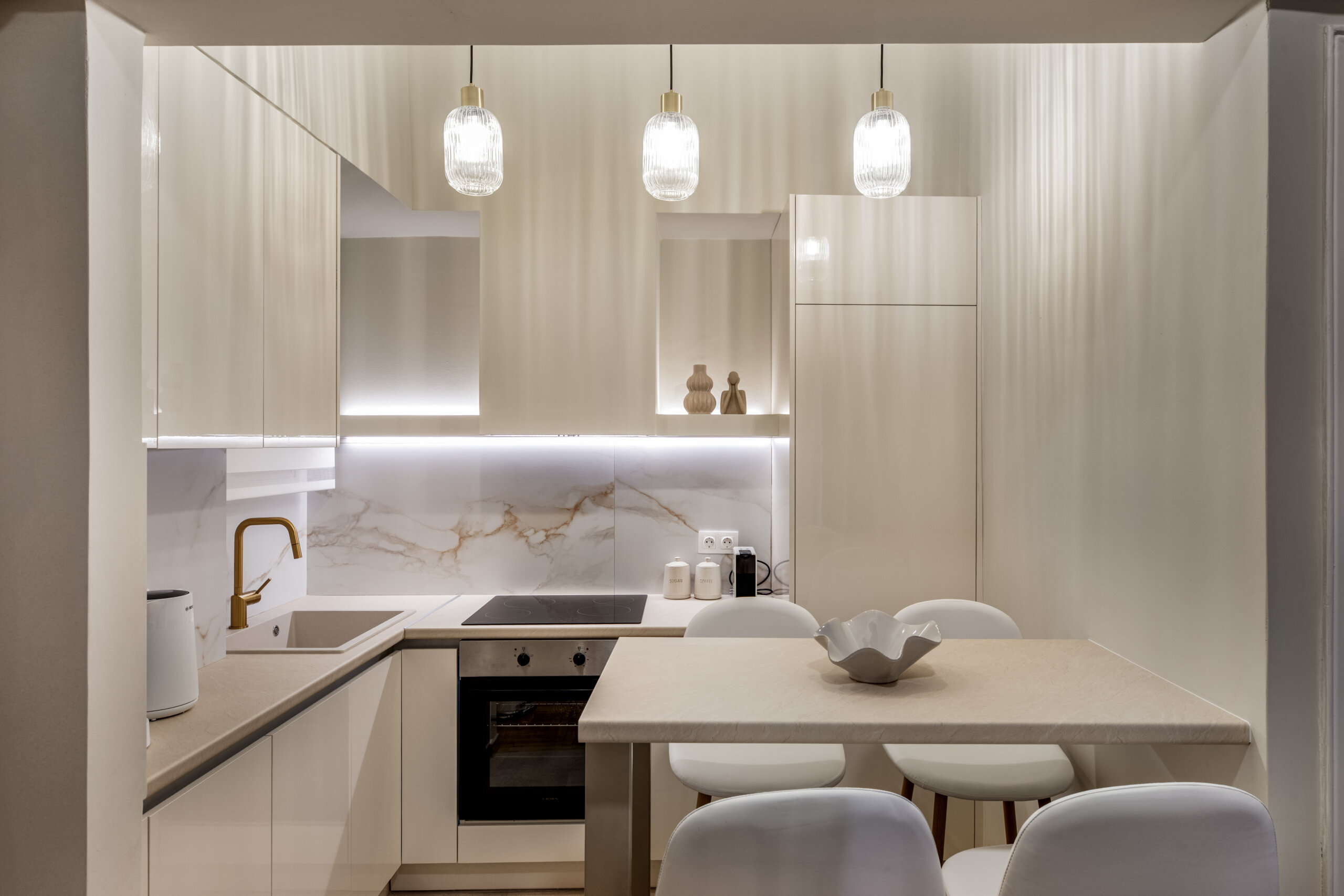 The apartment includes two calm bedrooms with comfortable queen-size beds. It also offers two full bathrooms with showers and one additional WC. This layout makes it ideal for families, couples, or small groups. The living room features a double sofa bed and a cozy dining area. The fully equipped kitchen lets you prepare meals with ease.