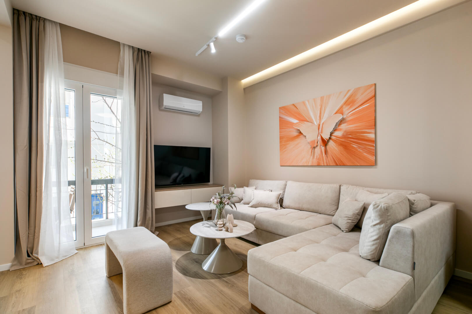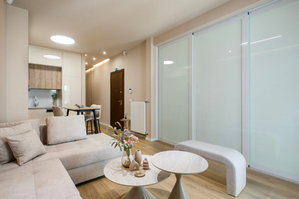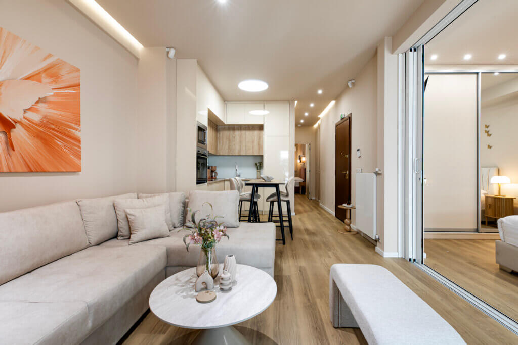 This modern apartment features bright interiors, large windows, and a warm atmosphere. It perfectly blends contemporary design with understated luxury.