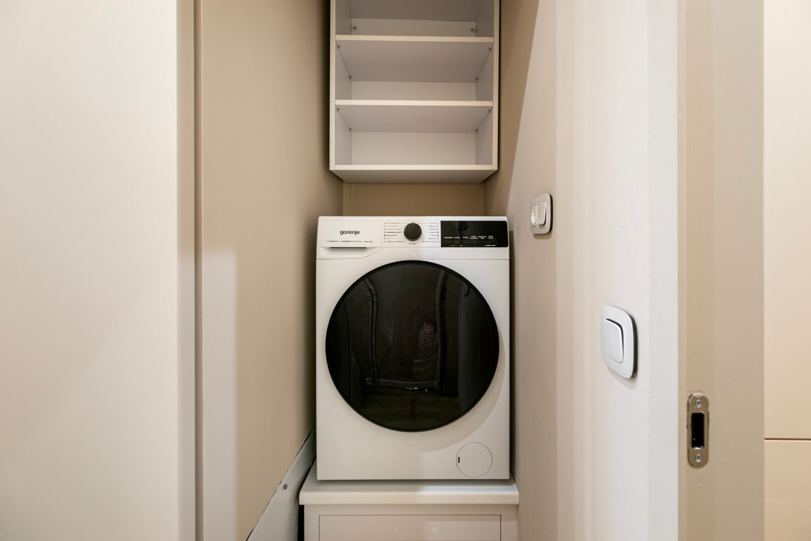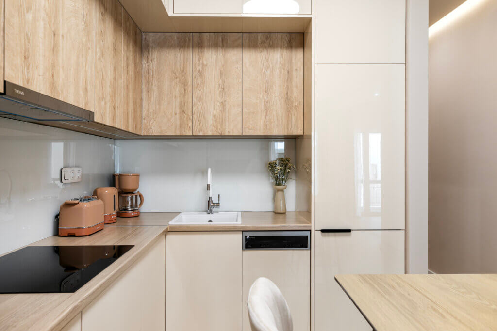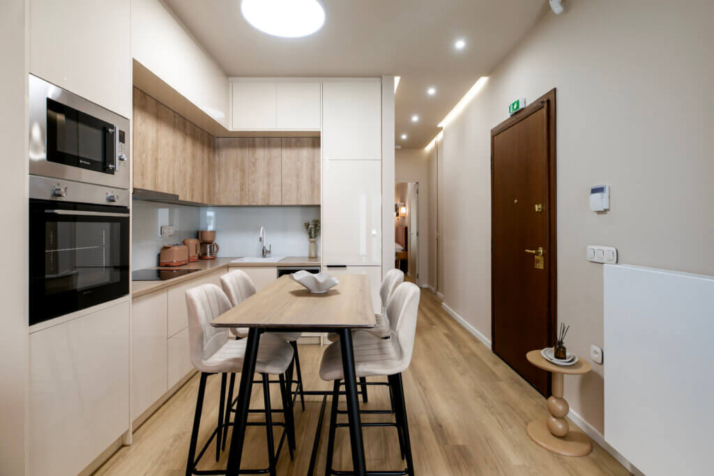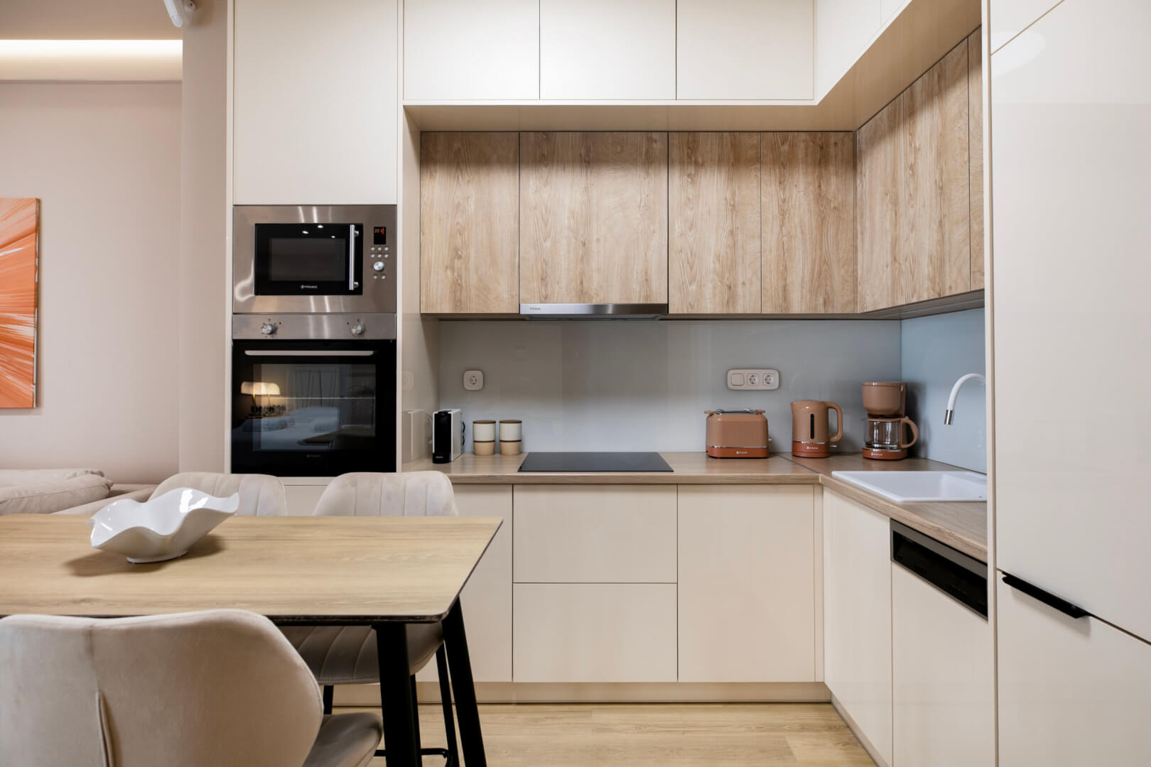 This modern apartment features bright interiors, large windows, and a warm atmosphere. It perfectly blends contemporary design with understated luxury.