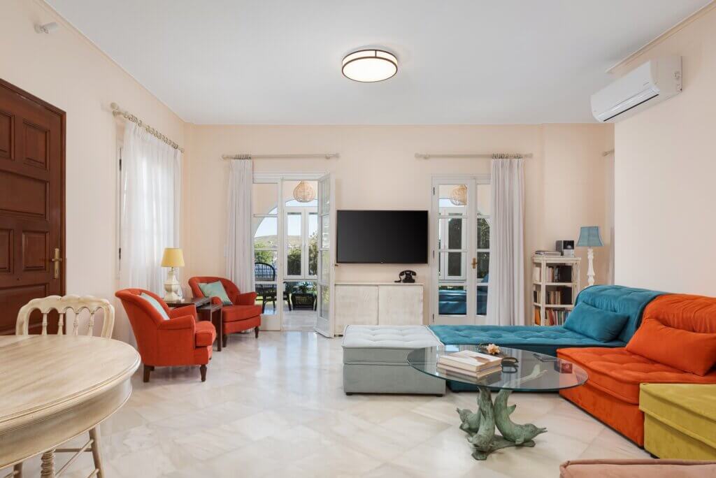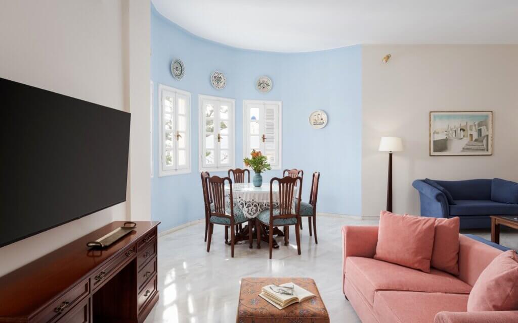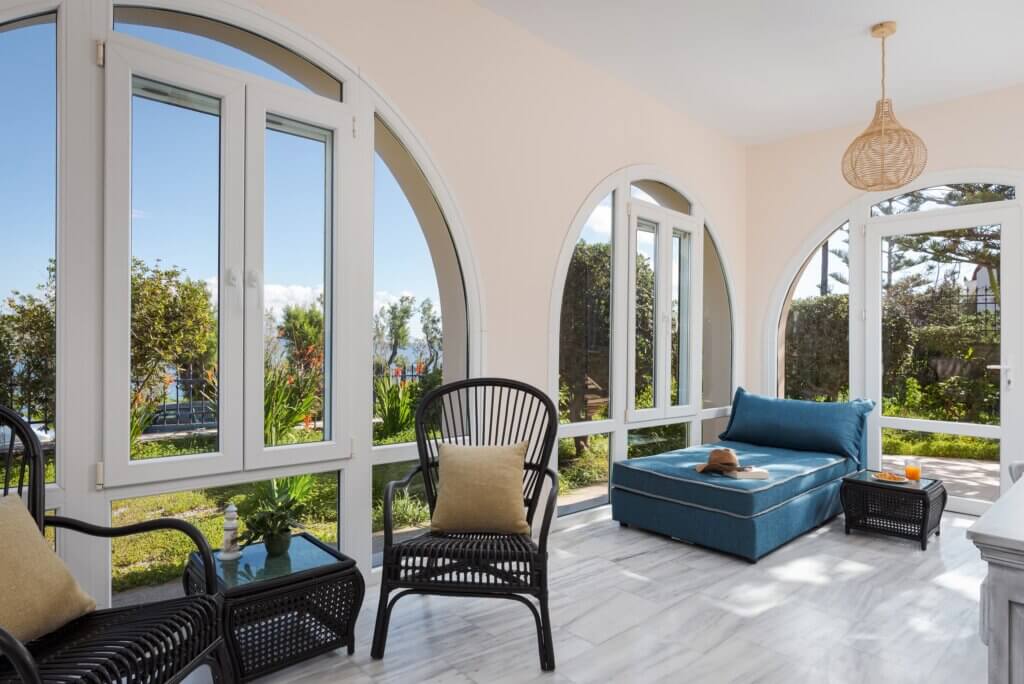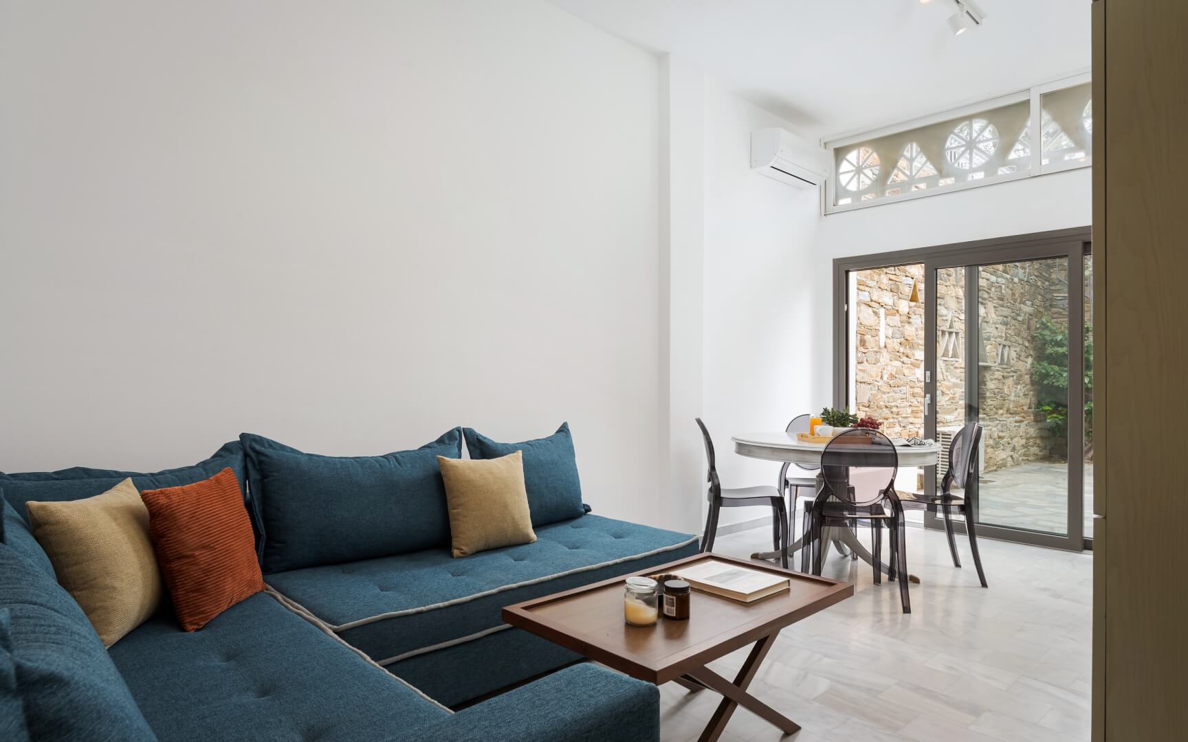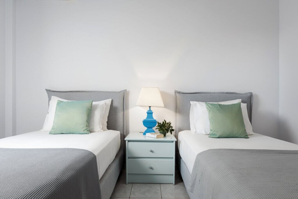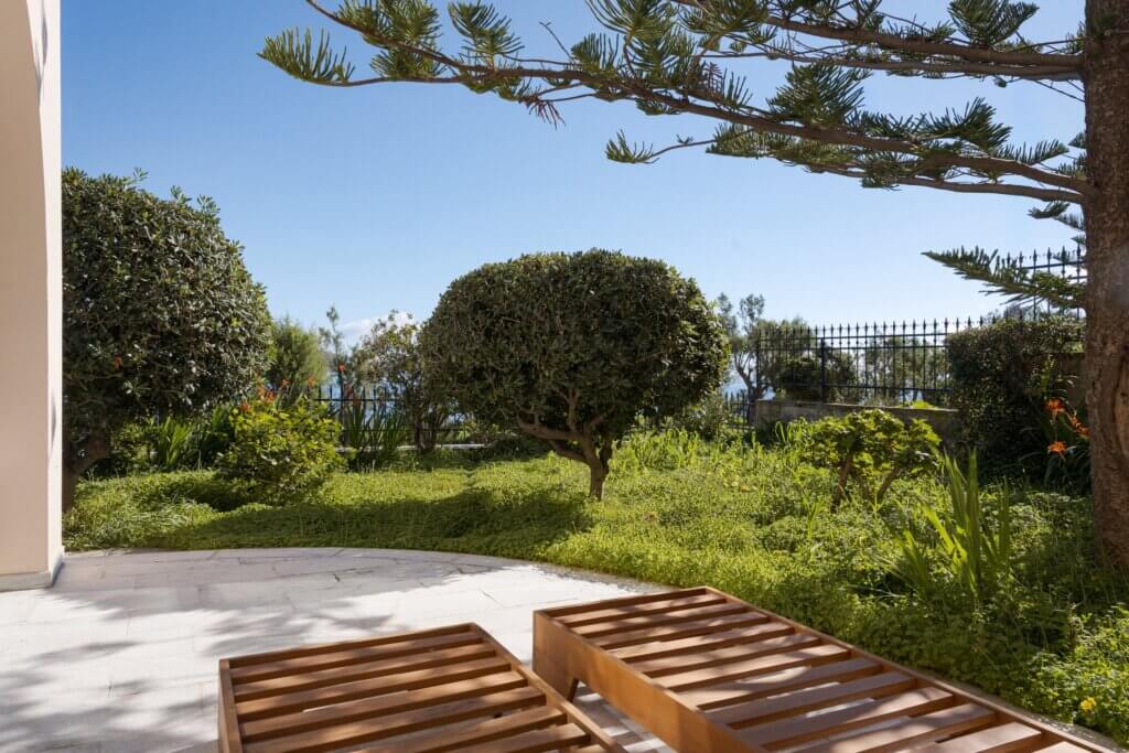 Seashore Villa I is located on the first floor and extends across 173 square meters of bright and airy interiors. It features a spacious living room, a fully equipped kitchen, and three comfortable bedrooms with two queen-size beds and two single beds, as well as an additional single sofa bed. Two bathrooms serve the villa, including one ensuite. A private balcony with sea and garden views, along with an outdoor patio, creates the perfect setting for relaxing mornings and sunset evenings.