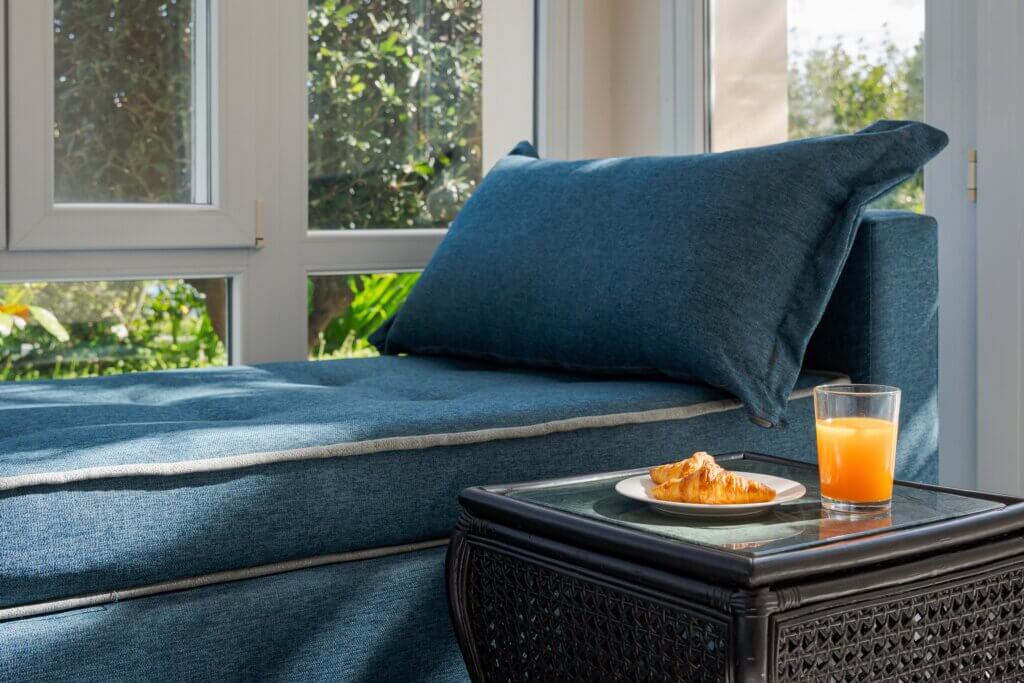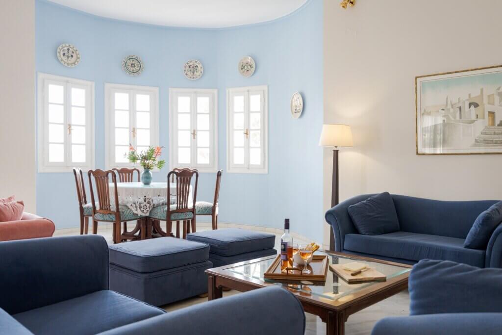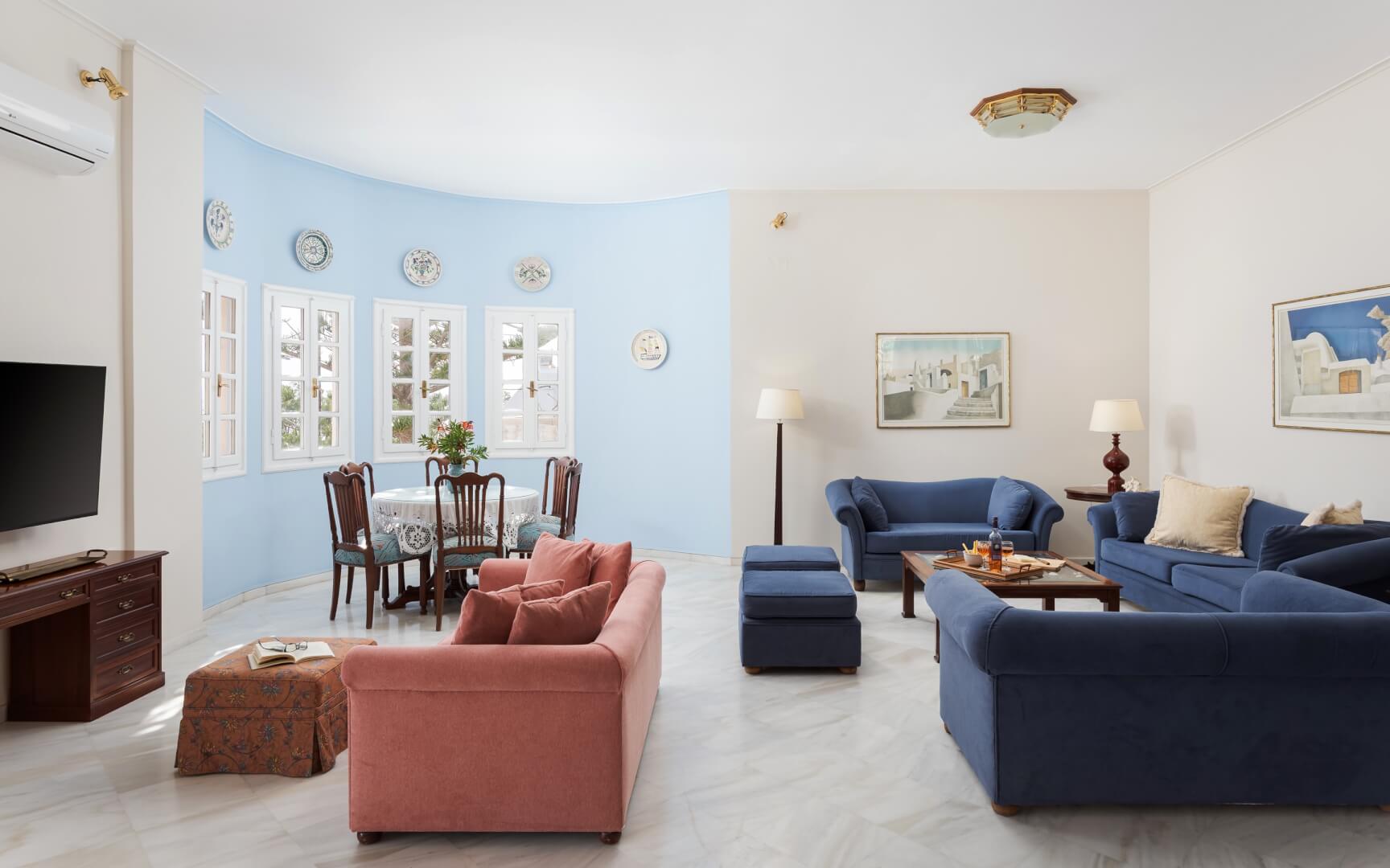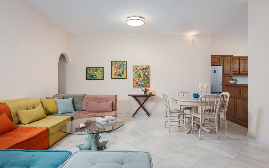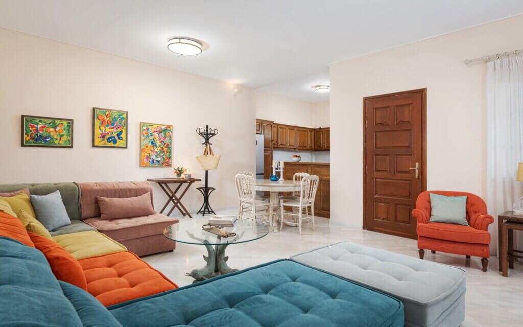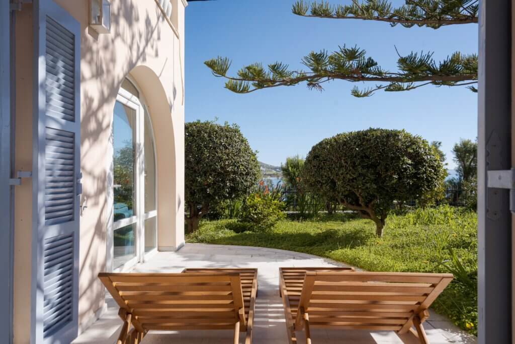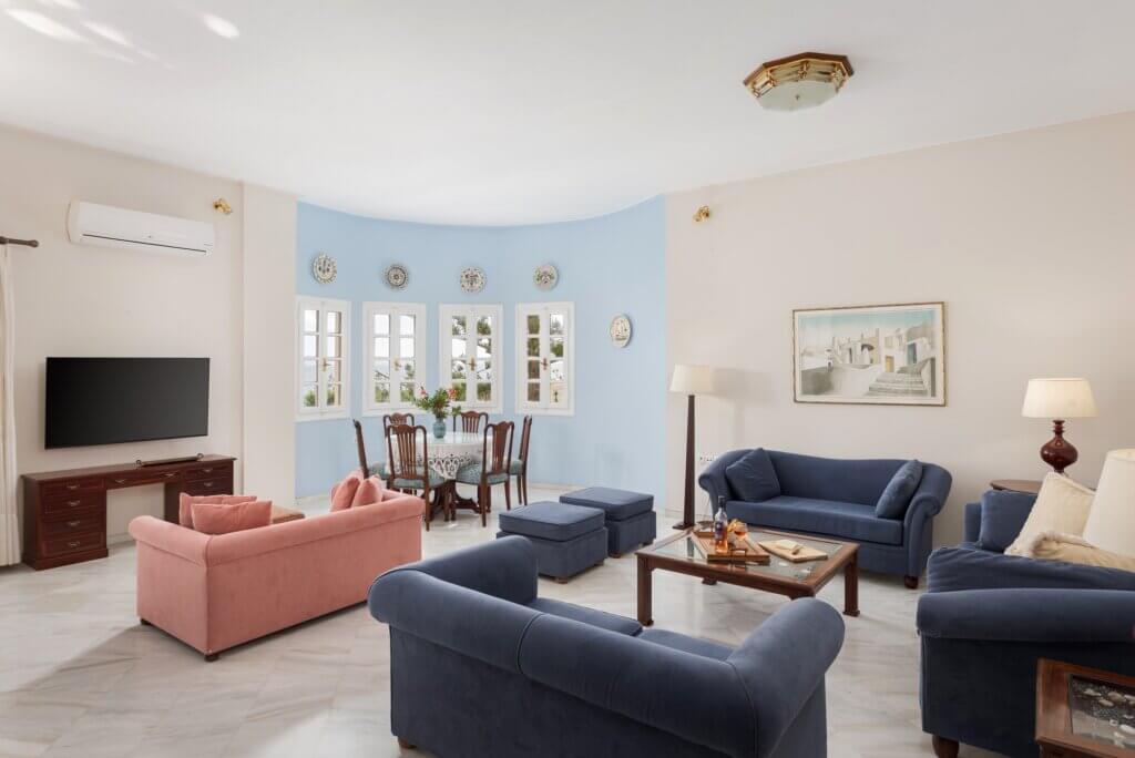 Seashore Villa I is located on the first floor and extends across 173 square meters of bright and airy interiors. It features a spacious living room, a fully equipped kitchen, and three comfortable bedrooms with two queen-size beds and two single beds, as well as an additional single sofa bed. Two bathrooms serve the villa, including one ensuite. A private balcony with sea and garden views, along with an outdoor patio, creates the perfect setting for relaxing mornings and sunset evenings.
