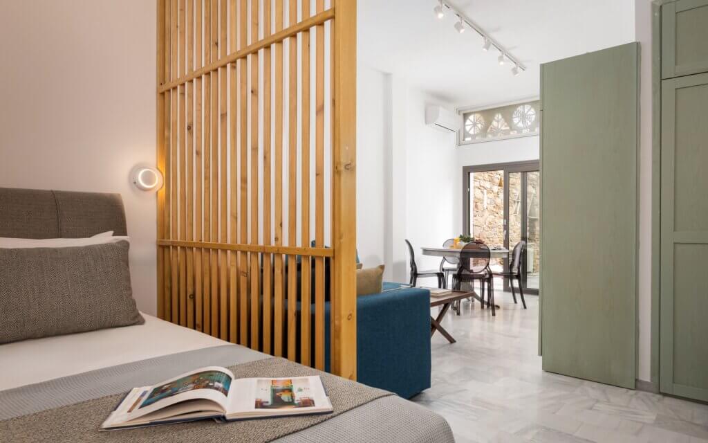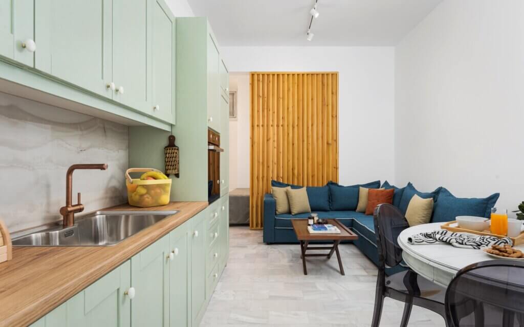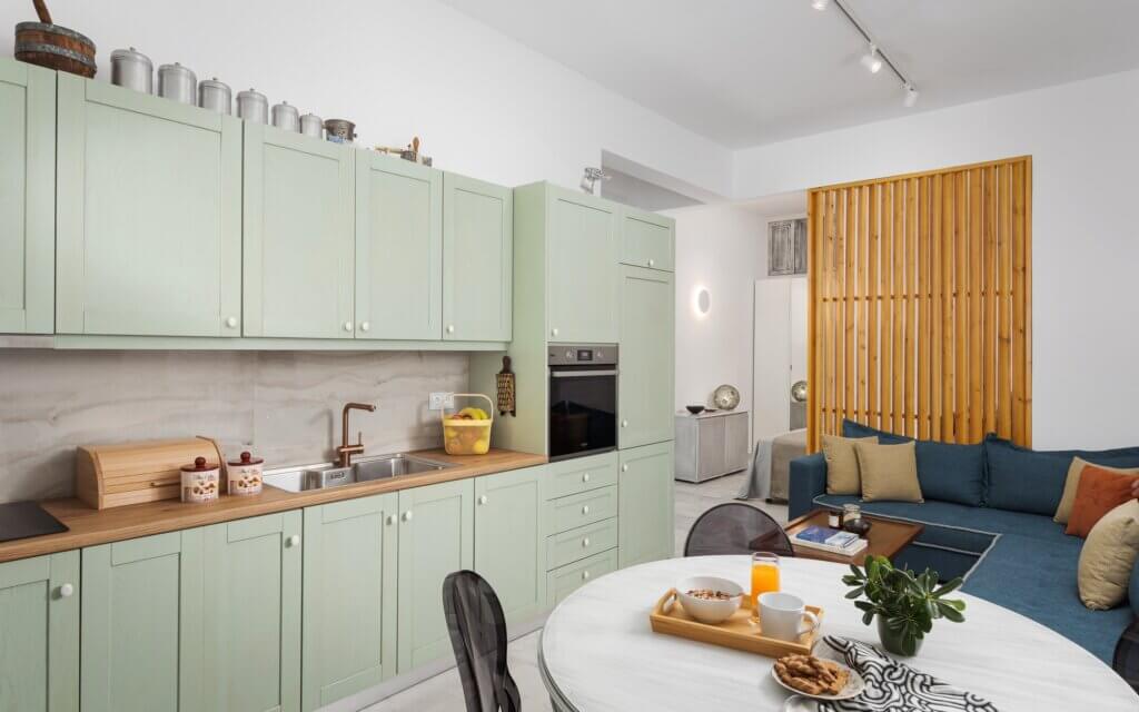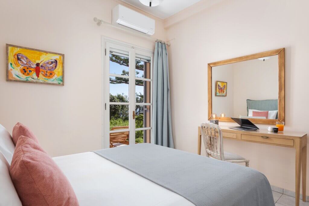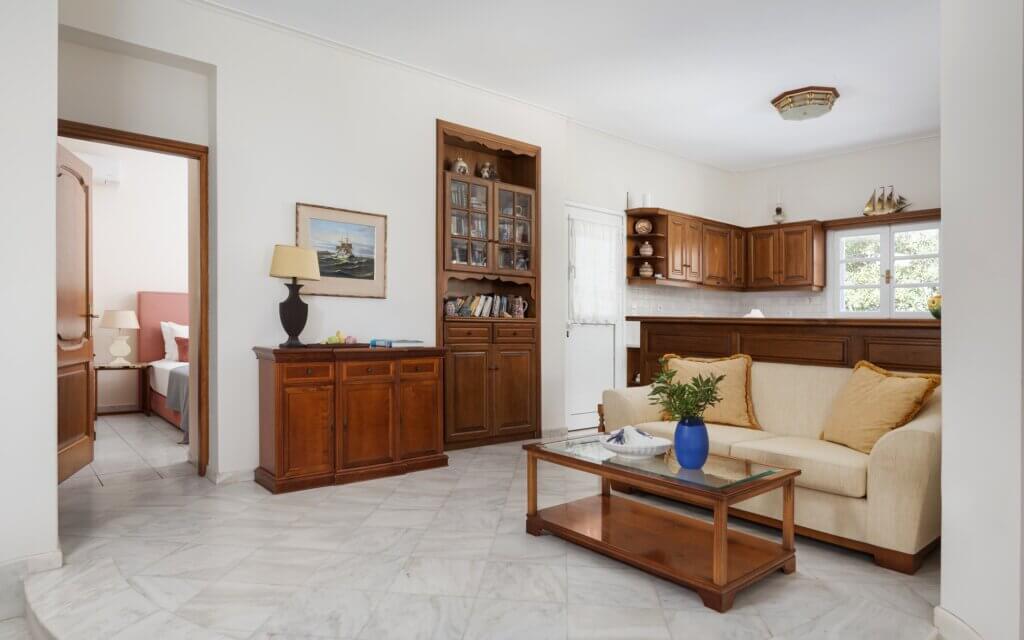 Seashore Studio, also on the ground floor, offers 45 square meters of cozy and functional accommodation. It includes one bedroom with a queen-size bed, one bathroom, a fully equipped kitchen, and a sofa bed for added convenience. Guests can enjoy sea and garden views as well as a private outdoor patio, making it a charming choice for couples or solo travelers.