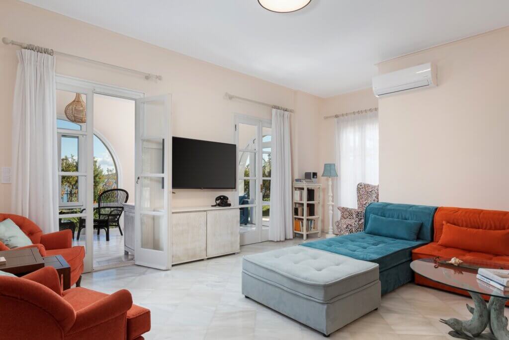 Seashore Villa II is set on the ground floor and offers 141 square meters of well-appointed space. It includes a welcoming living area, a fully equipped kitchen, and three bedrooms furnished with two queen-size beds and two single beds, plus a single sofa bed for extra flexibility. The villa also features two bathrooms, one of which is ensuite. Outdoor areas open to sea and garden views and include a private patio ideal for dining or unwinding outdoors.