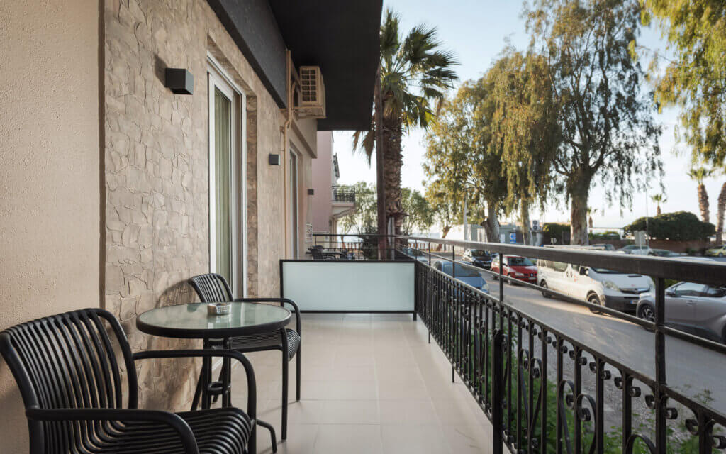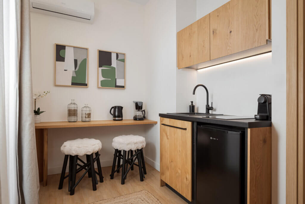 The hotel features eight different suite types, each tailored to accommodate specific guest needs—from spacious suites ideal for families to compact yet refined sea-view retreats. All suites are equipped with private furnished balconies , full bathrooms with walk-in showers, and fully equipped kitchenettes for those who appreciate the option of light cooking during their stay.