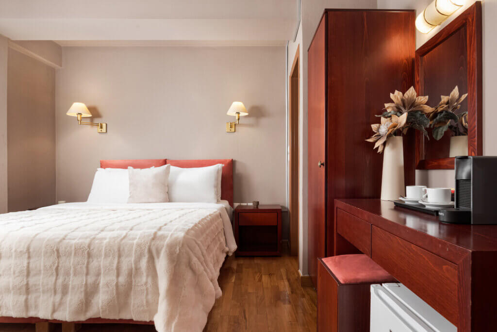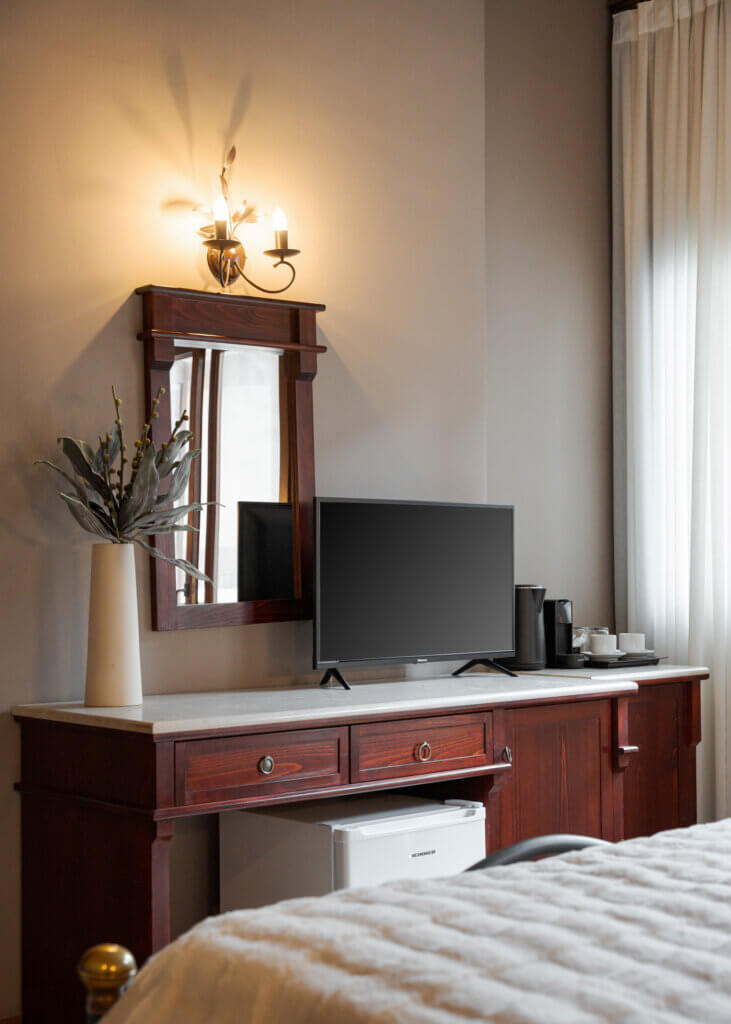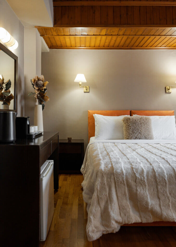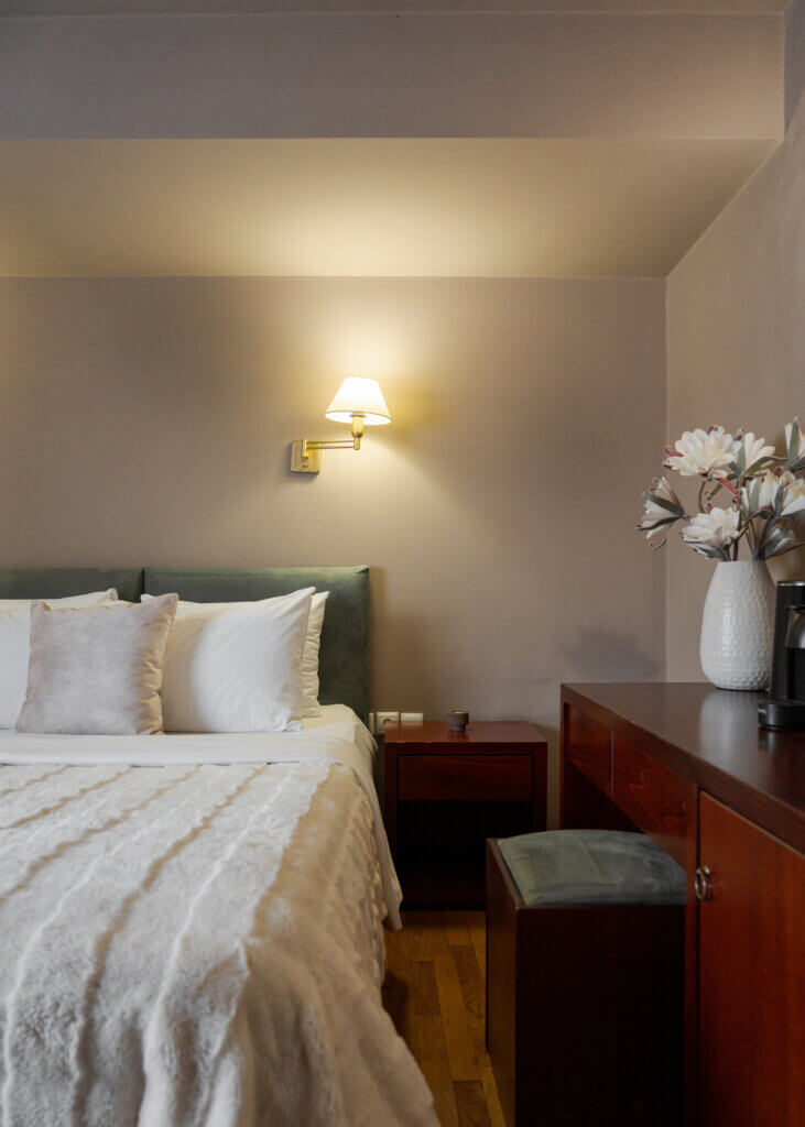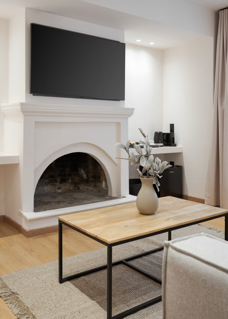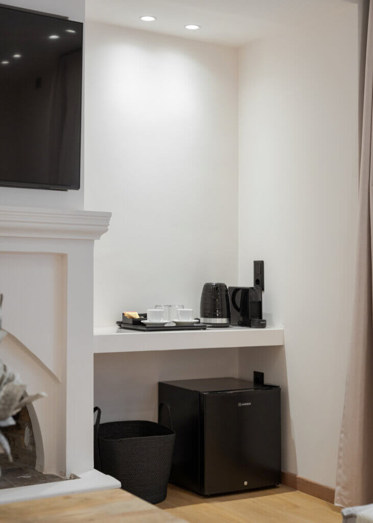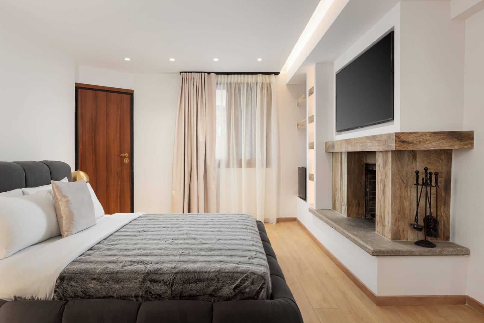 For a touch of added luxury, the Deluxe Double Room offers 22 square meters of space, with a cozy queen-size bed, a modern bathroom with a full shower, and the warm allure of an in-room fireplace – perfect for creating a romantic atmosphere for two.