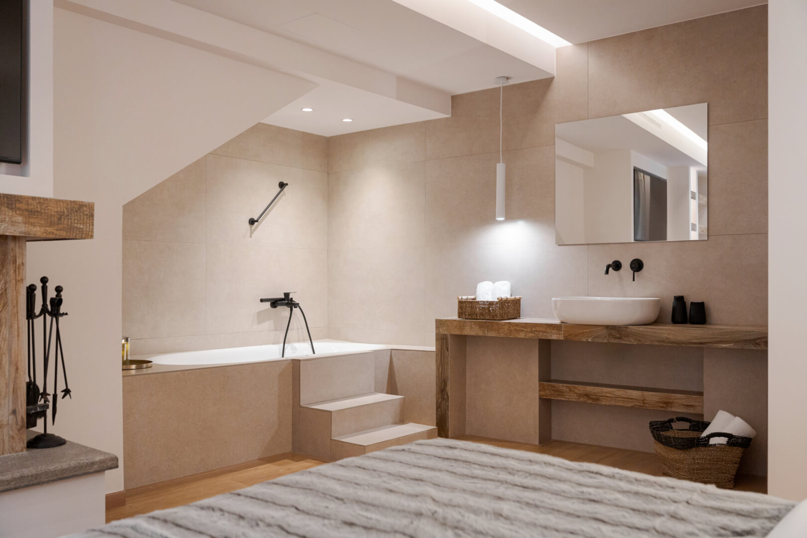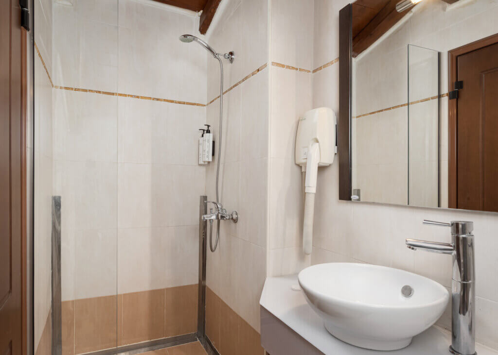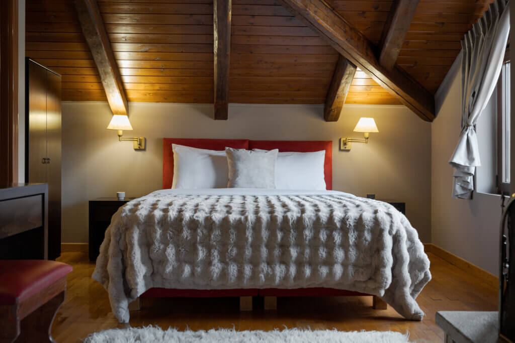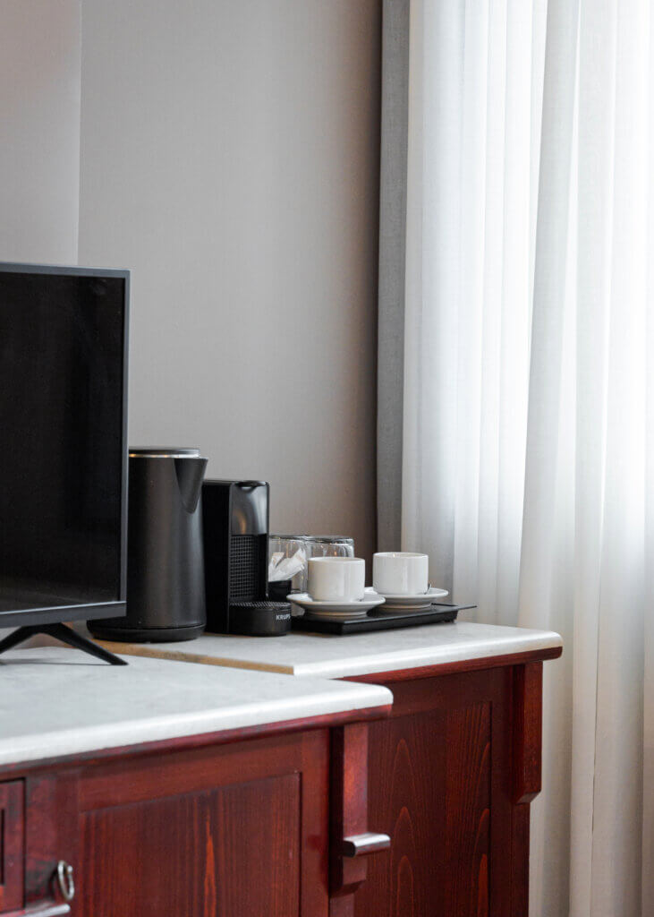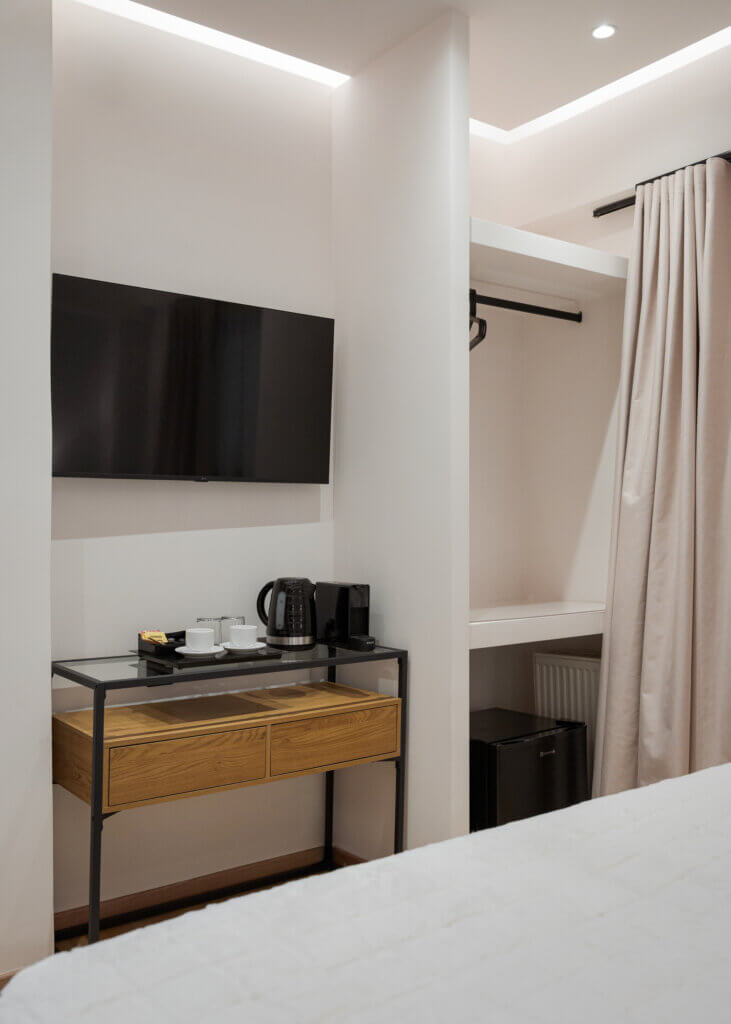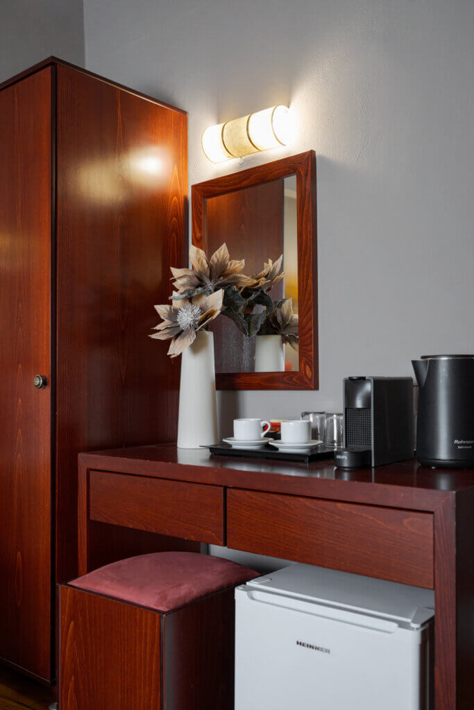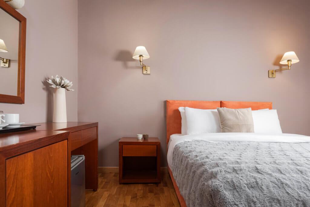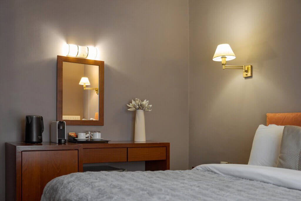 For a touch of added luxury, the Deluxe Double Room offers 22 square meters of space, with a cozy queen-size bed, a modern bathroom with a full shower, and the warm allure of an in-room fireplace – perfect for creating a romantic atmosphere for two.