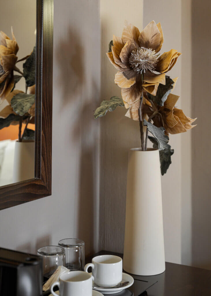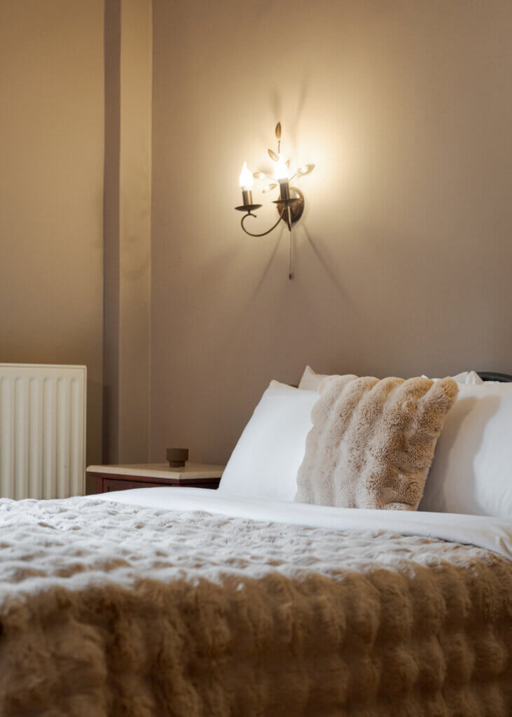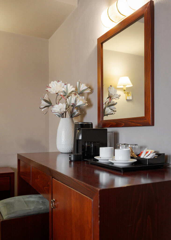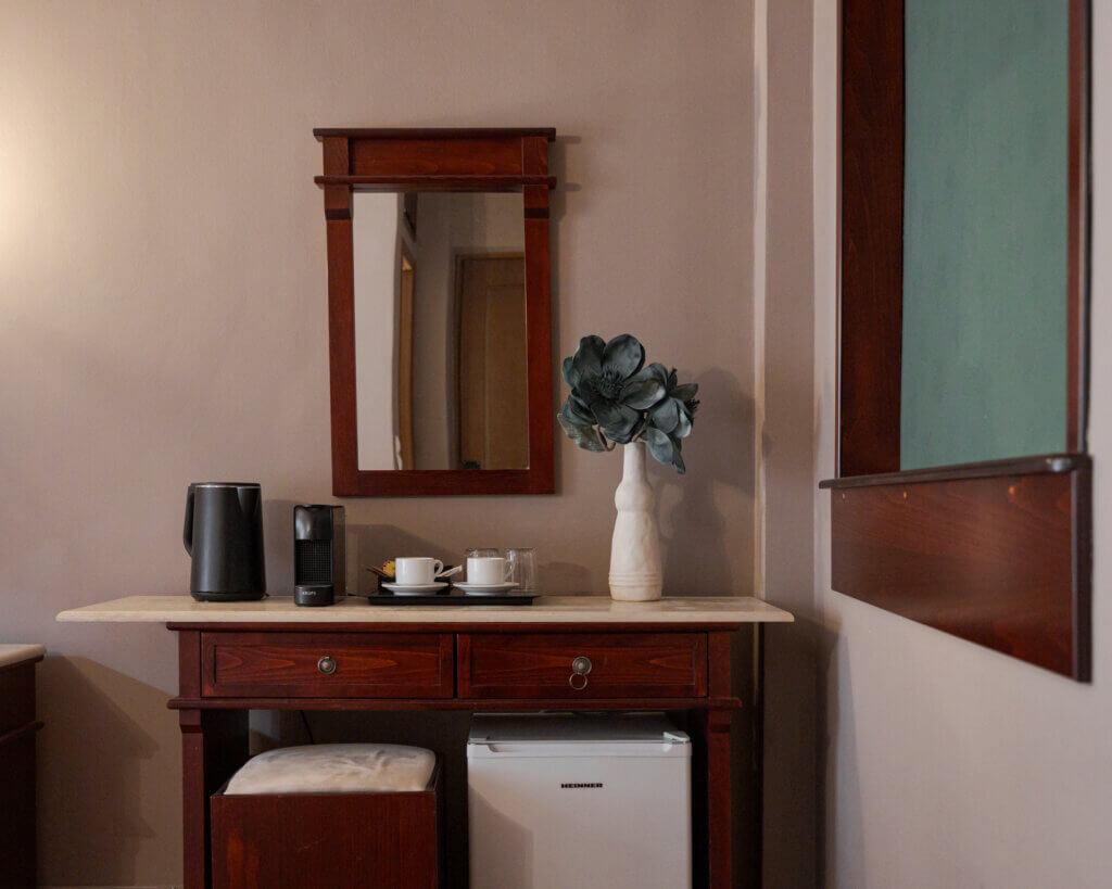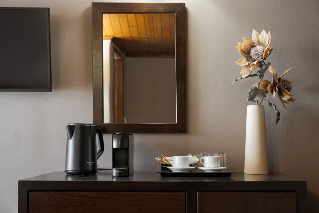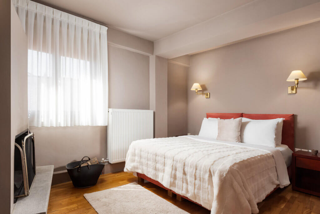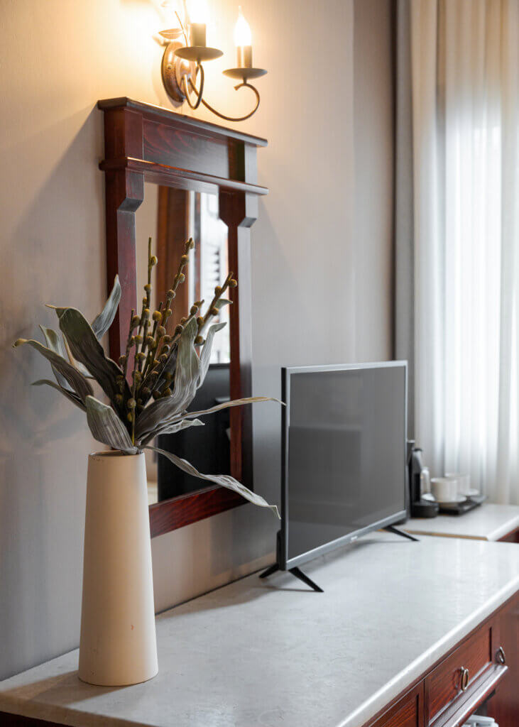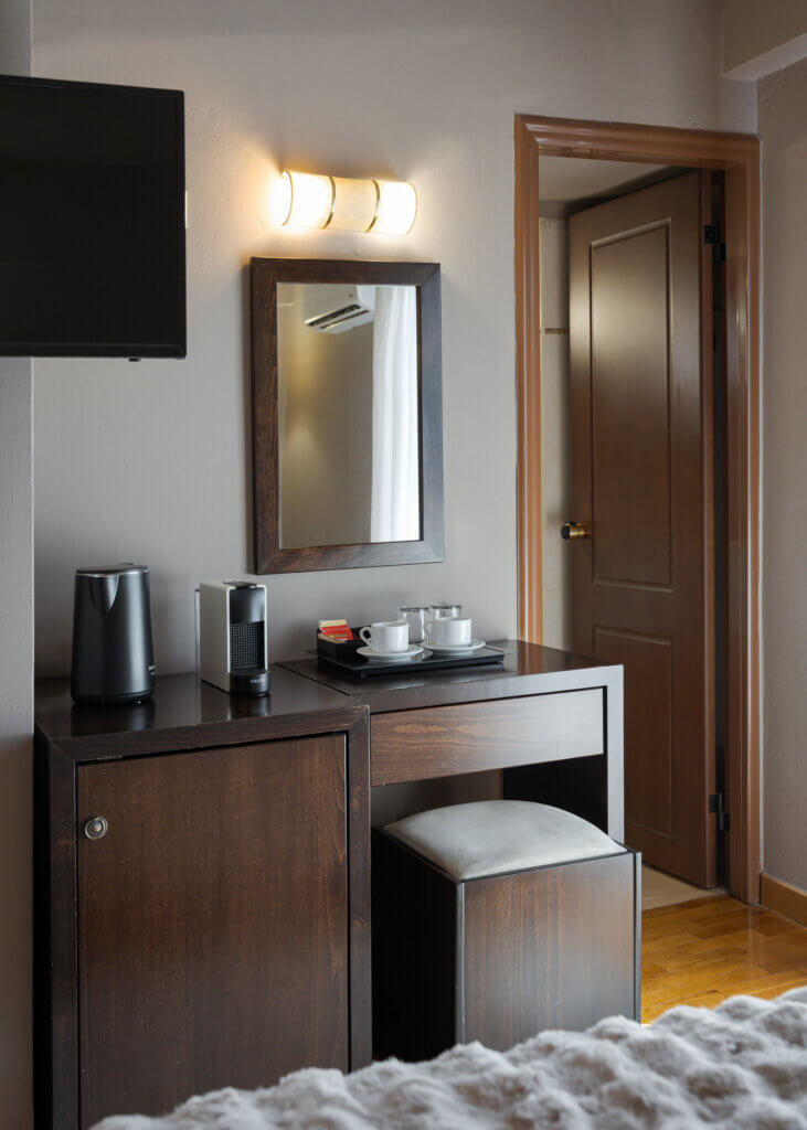 For a touch of added luxury, the Deluxe Double Room offers 22 square meters of space, with a cozy queen-size bed, a modern bathroom with a full shower, and the warm allure of an in-room fireplace – perfect for creating a romantic atmosphere for two.