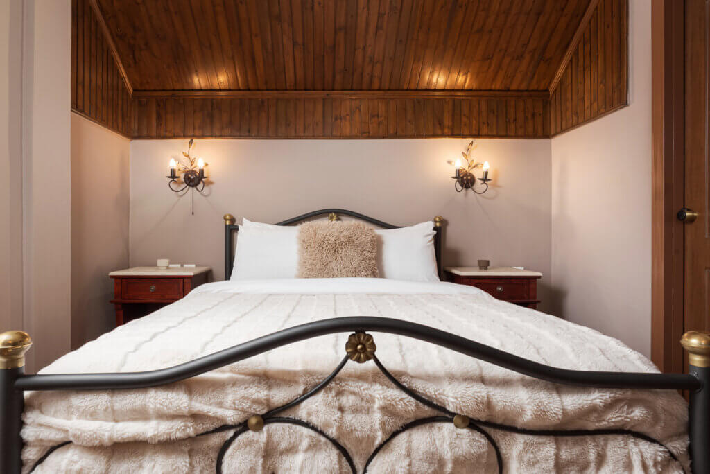 The Honeymoon Suite offers 25 square meters of romantic charm, featuring a plush queen-size bed, premium furnishings, and a cozy fireplace that creates a warm ambiance. The spacious bathroom includes both a separate shower and bathtub, perfect for relaxation and indulgence.
