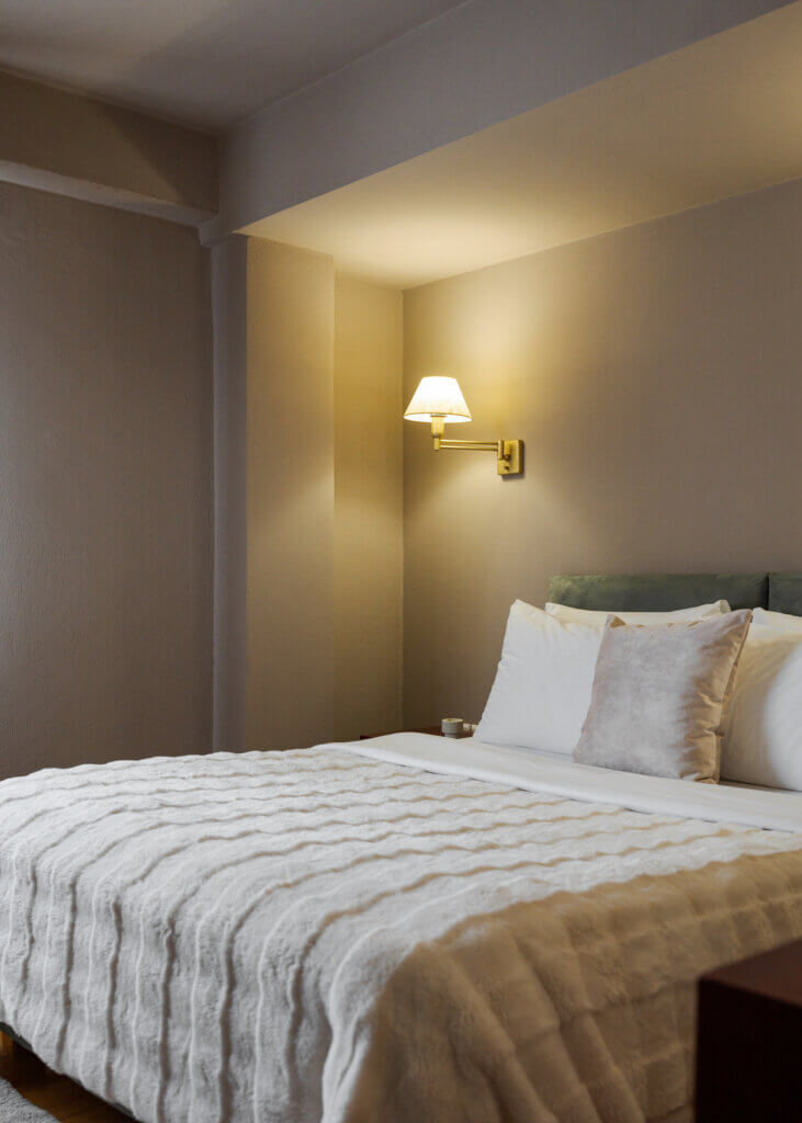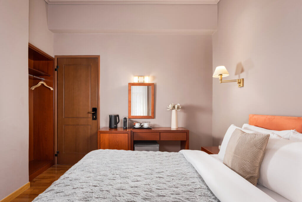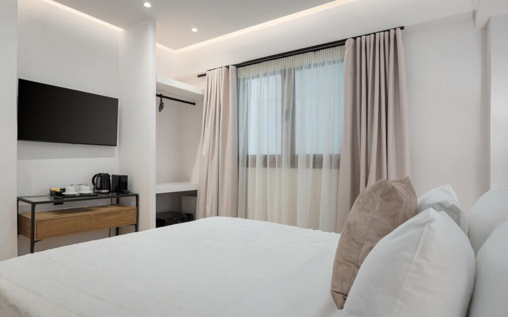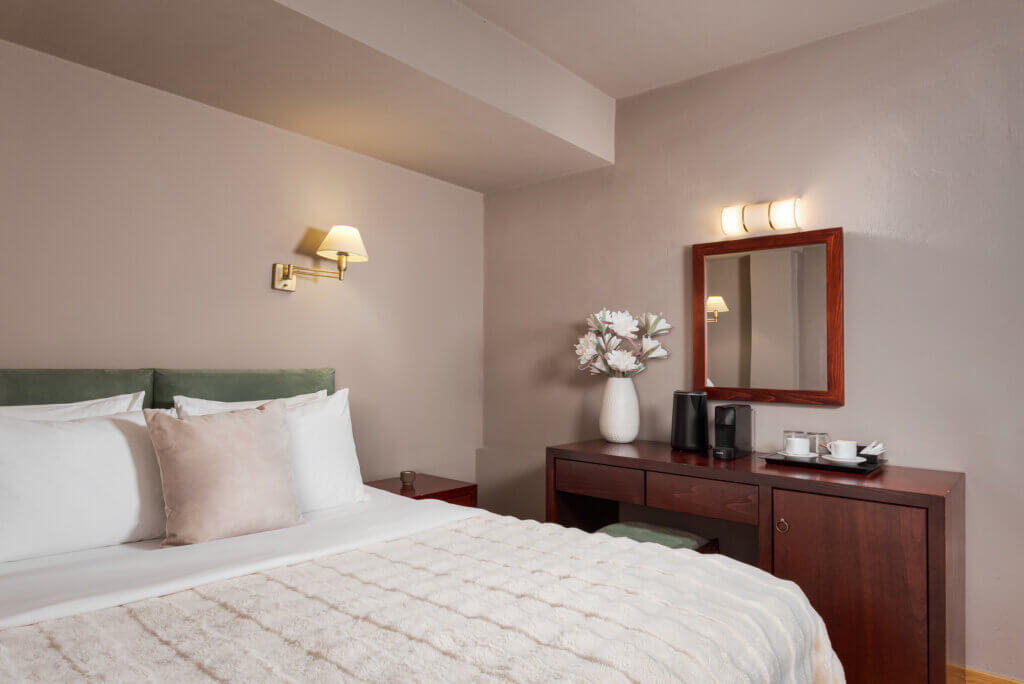 Discover refined comfort in the Junior Suite, a stylish 18 square-meter retreat featuring a queen-size bed, premium linens, and elegant modern décor. The suite includes a contemporary bathroom with a walk-in shower and luxury toiletries, making it ideal for couples or solo travelers.