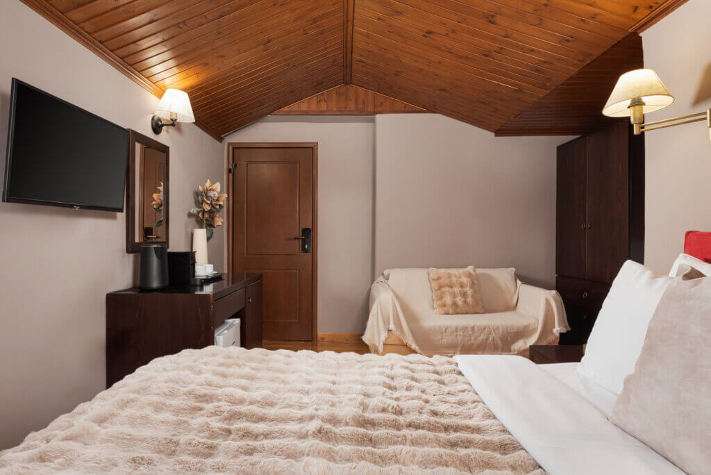 The Superior Room, at 32 square meters, is designed for both couples and small families, featuring a queen-size bed, a comfortable double sofa bed, a modern bathroom with a full shower, and a welcoming fireplace. It can accommodate up to four guests, with a maximum of three adults.
