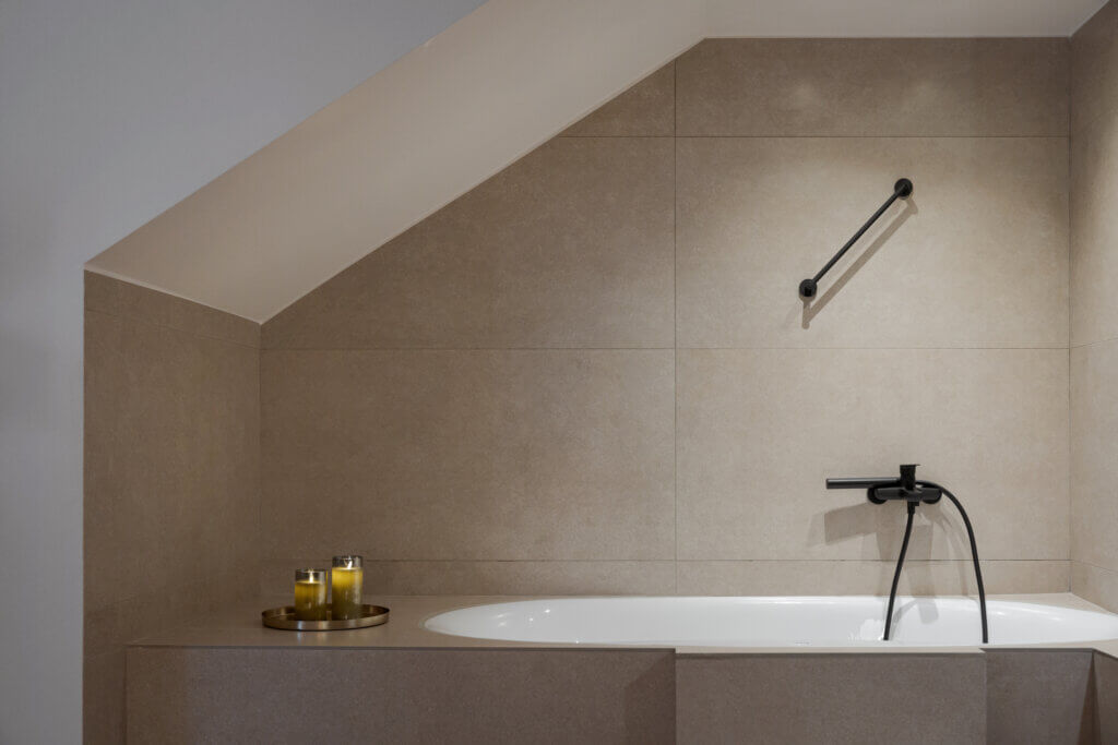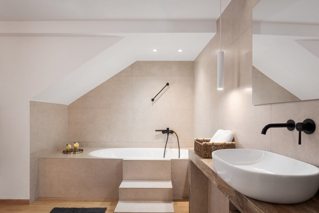 The Promenade Suite, at 35 square meters, offers a blend of comfort and style with a separate living area and fireplace for cozy evenings. The bedroom features a queen-size bed with premium linens, while the modern bathroom includes a sleek walk-in shower, ideal for a relaxing stay.