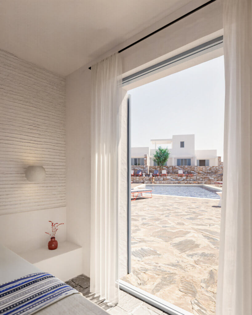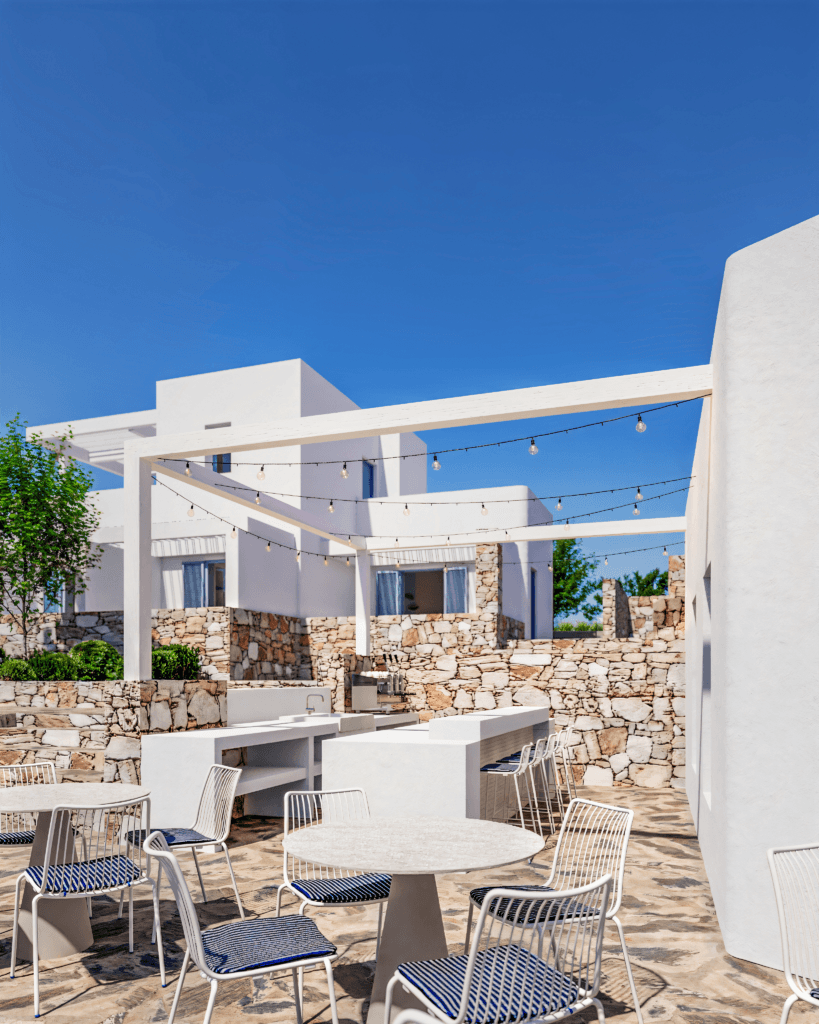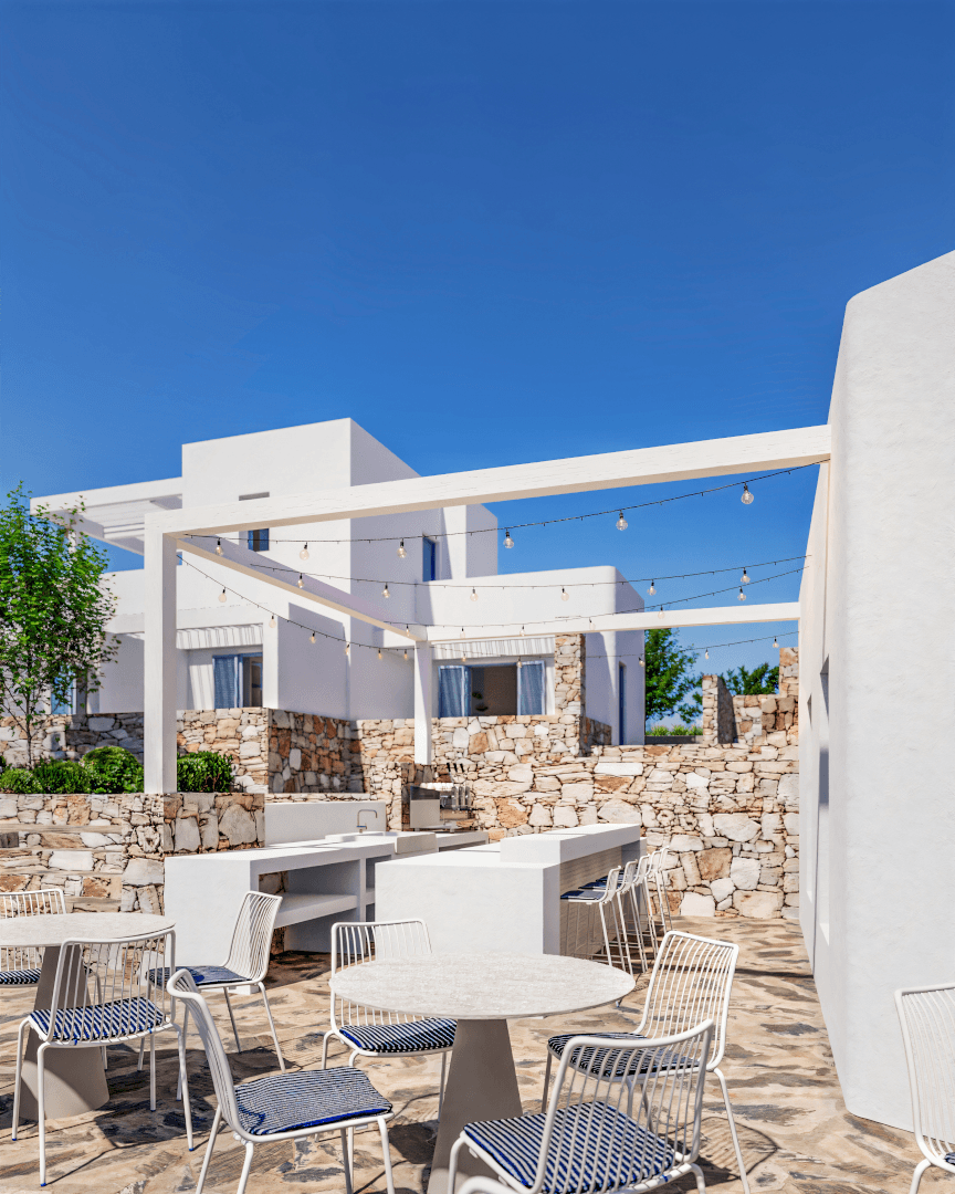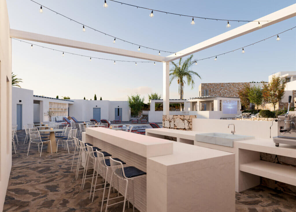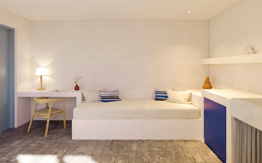 Each room is carefully designed with simplicity and functionality in mind, featuring bright, airy interiors, comfortable queen-size beds dressed in a premium linen collection by Laura Ashley, and modern bathrooms with showers. Guests can choose from a variety of options, including rooms with private balconies overlooking the pool, rooms with beautiful sea views, and spacious suites ideal for longer stays or additional comfort. Select suites also feature kitchenettes for added flexibility, while others offer a private indoor jacuzzi, perfect for moments of relaxation and indulgence.