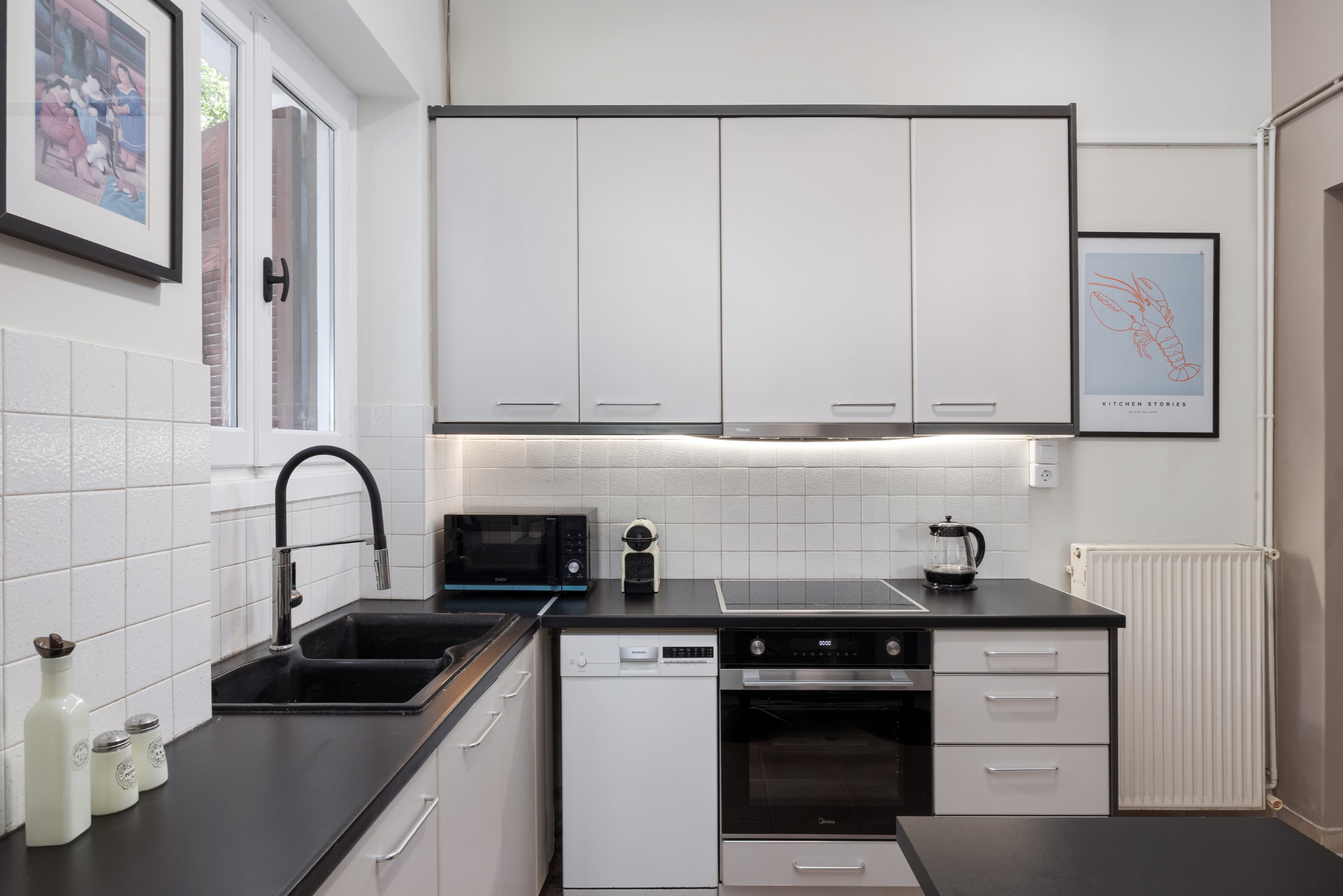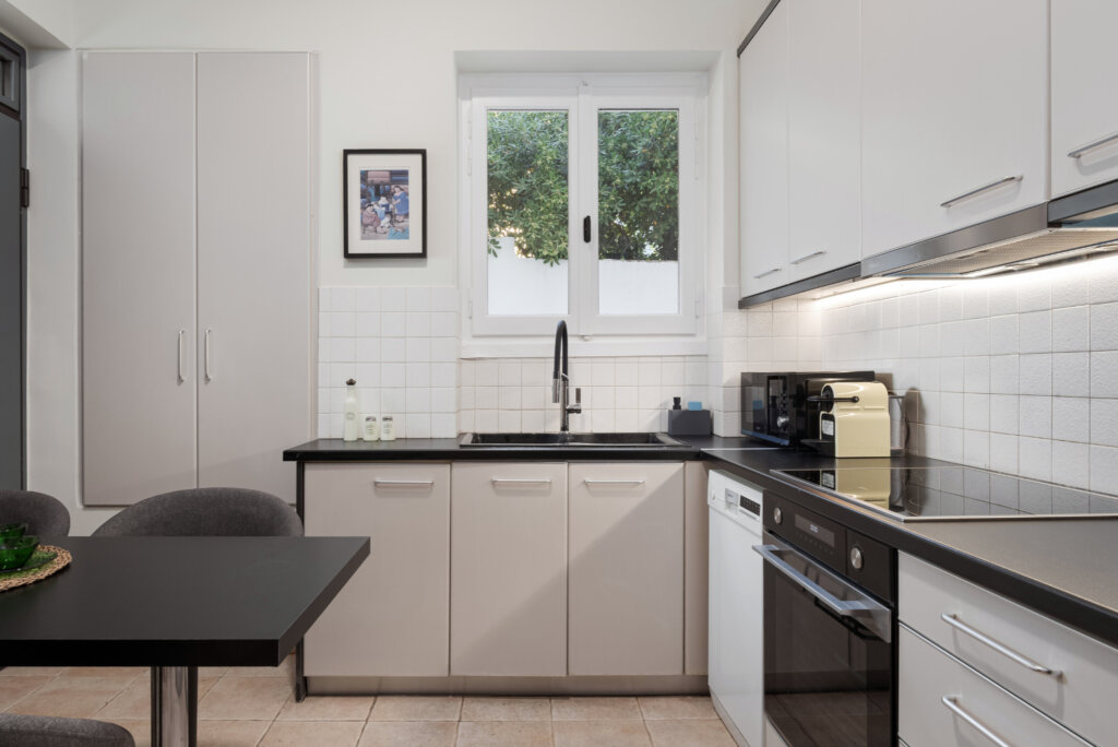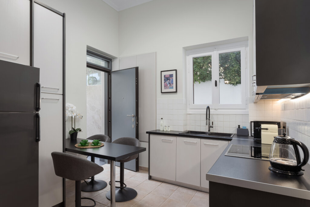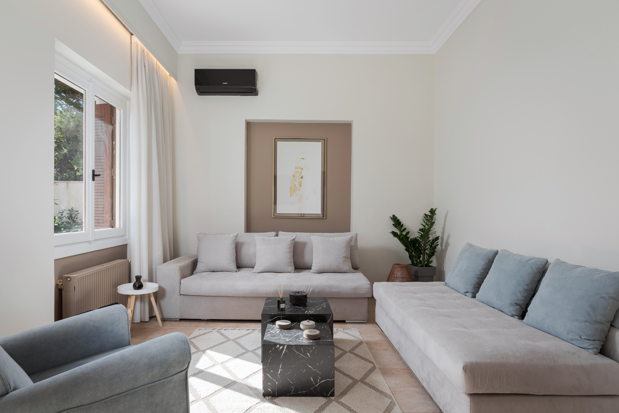 The spacious and cozy living room is perfect for relaxing after a day of exploring Athens, equipped with all modern amenities to make you feel right at home. The fully equipped kitchen includes everything you need to prepare your favorite meals, from modern appliances to dining essentials.