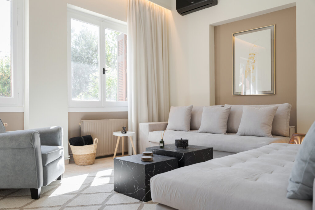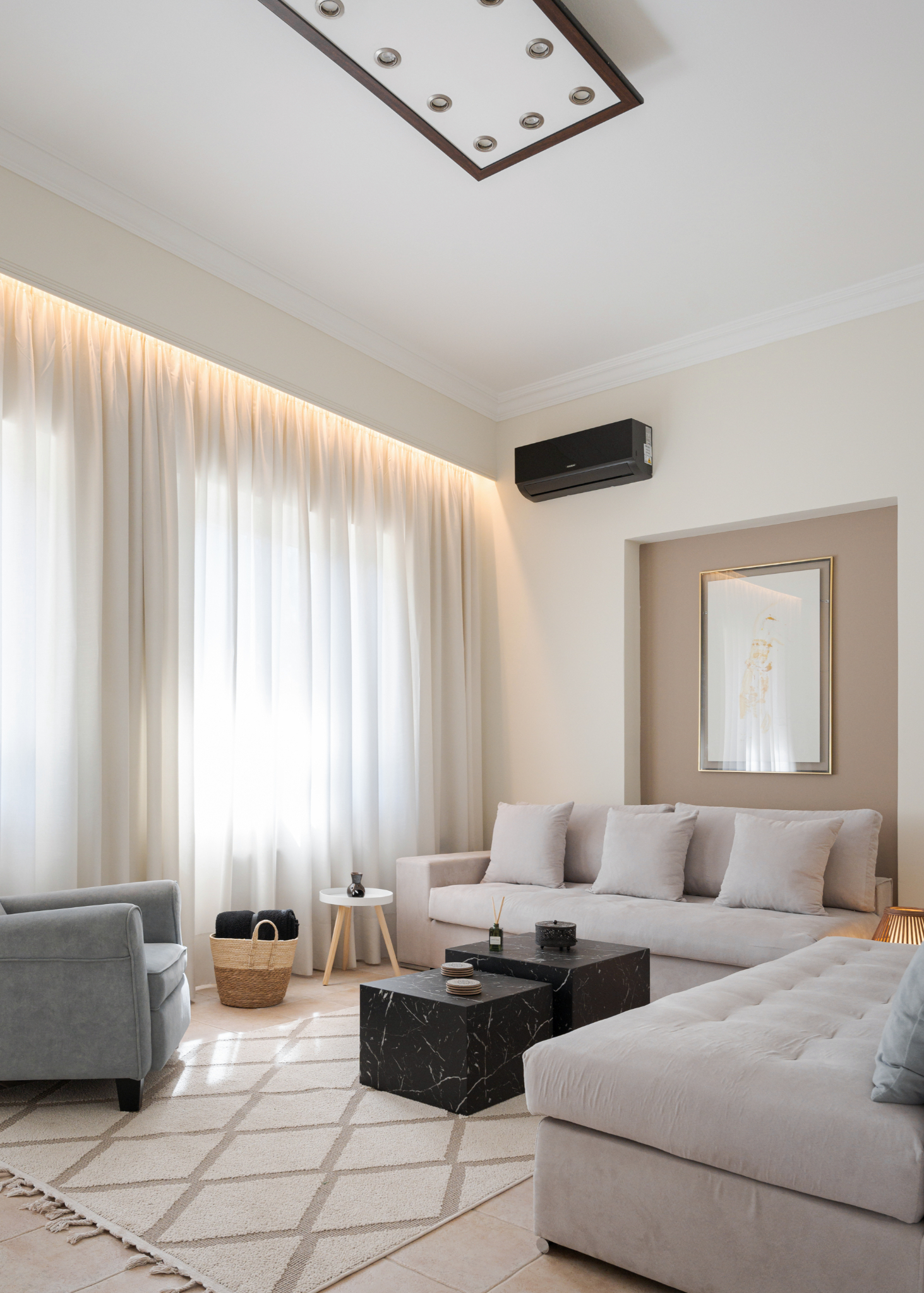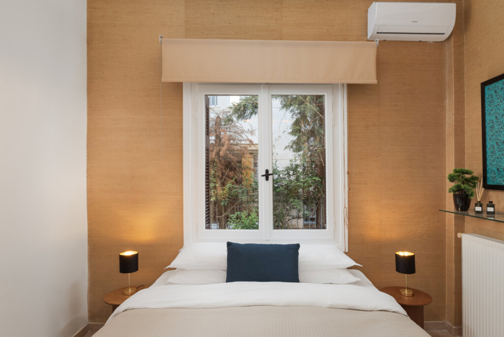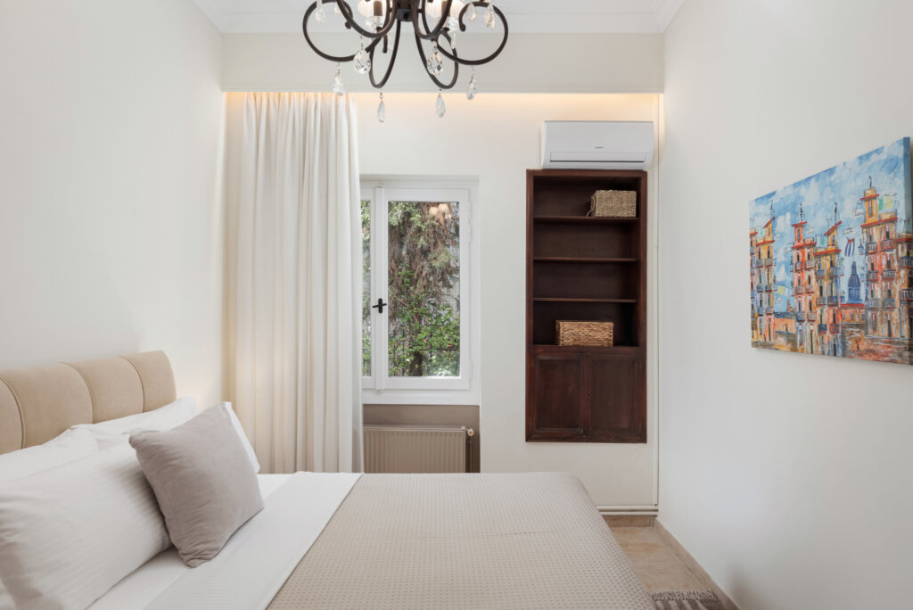 The spacious and cozy living room is perfect for relaxing after a day of exploring Athens, equipped with all modern amenities to make you feel right at home. The fully equipped kitchen includes everything you need to prepare your favorite meals, from modern appliances to dining essentials.