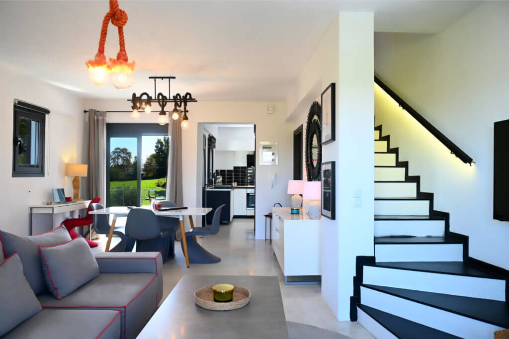 The house features three comfortable bedrooms, one full bathroom, and an additional WC, thoughtfully arranged across two levels to provide privacy and convenience. Two bedrooms are equipped with queen-size beds, while the third bedroom features a double bed, ensuring a restful night’s sleep for all guests. In addition, the living room includes a double sofa bed, which can comfortably accommodate one additional guest, offering extra flexibility for families or small groups.