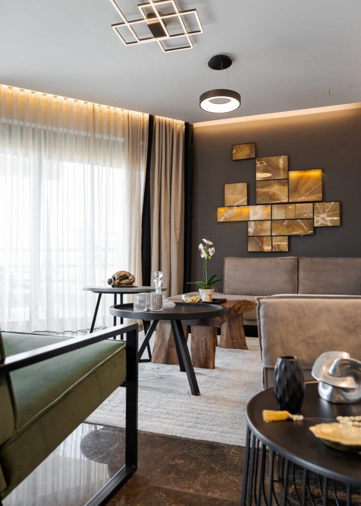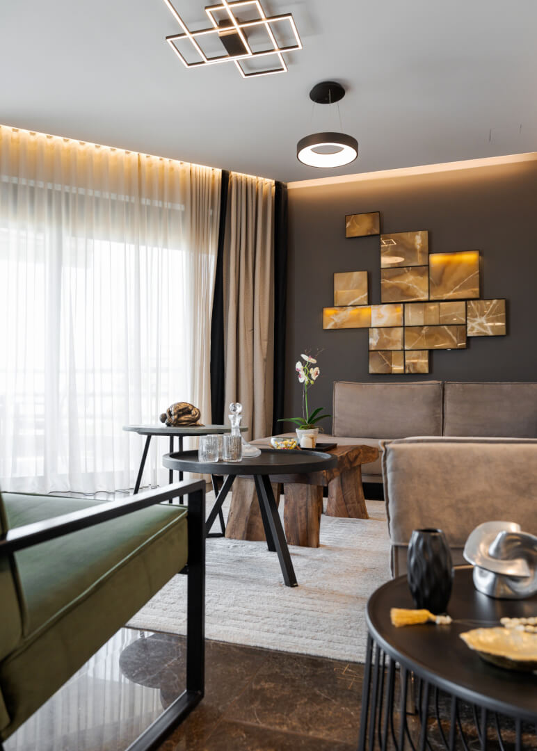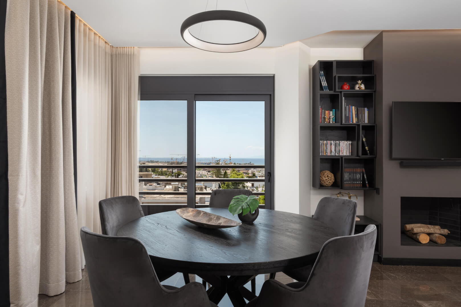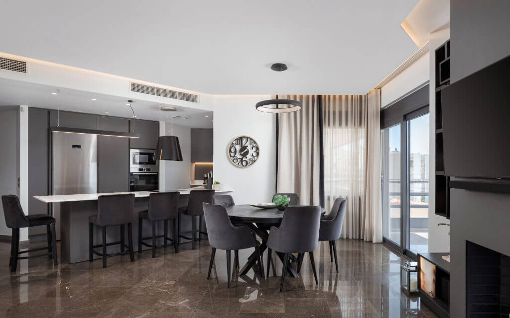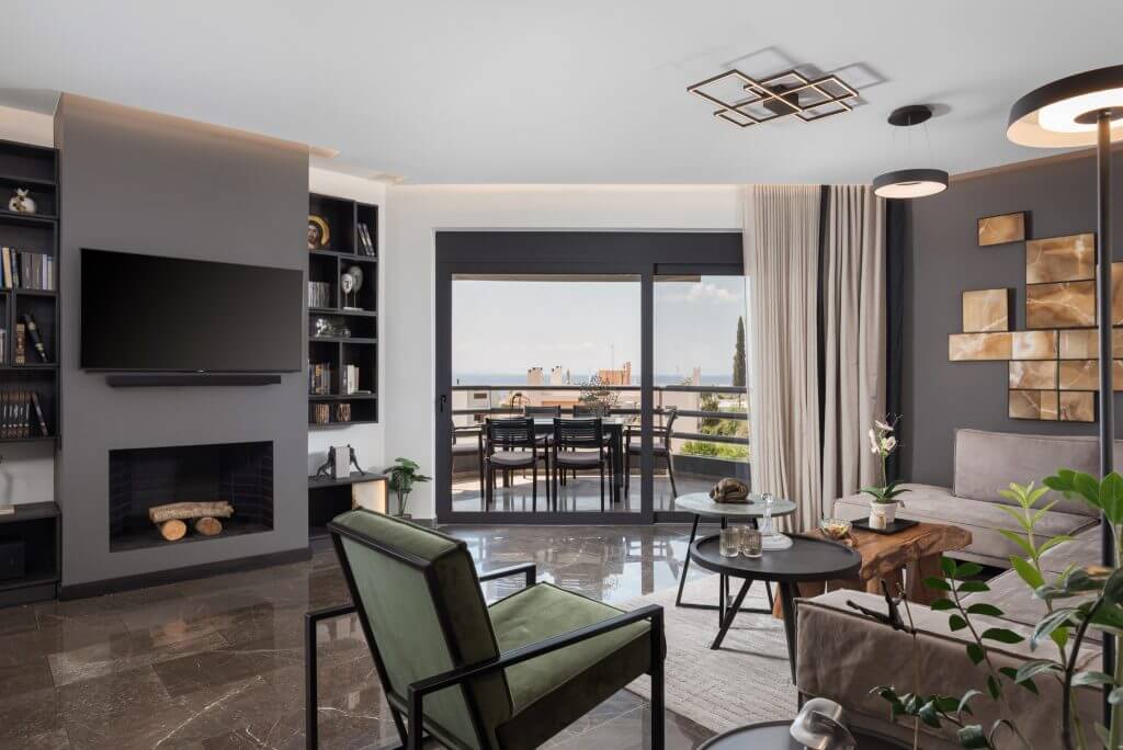 Experience modern luxury of Athenian Riviera Luxurious Residence with stunning sea views in this brand-new 120 sq.m. apartment located on the third floor in Alimos, South Athens. Elegantly designed with contemporary furnishings and stylish décor, this apartment offers an open-plan living area that seamlessly combines comfort with sophistication. Relax on the plush corner sofa beside the sleek modern fireplace or enjoy meals at the chic round dining table. The fully equipped kitchen features ample storage and a pristine white breakfast counter.