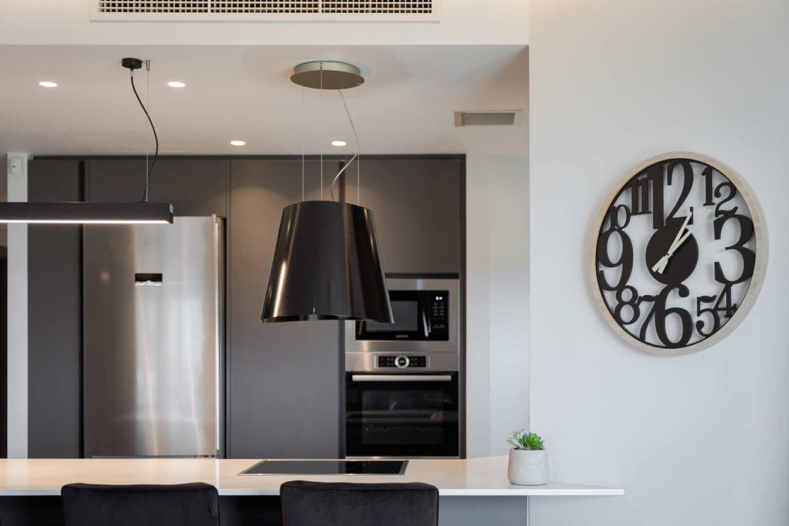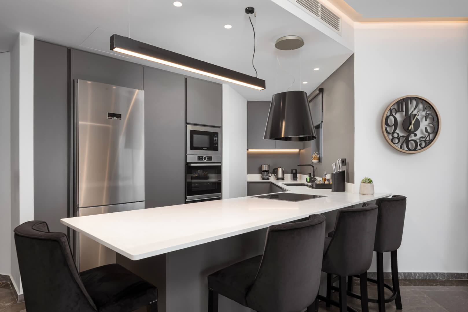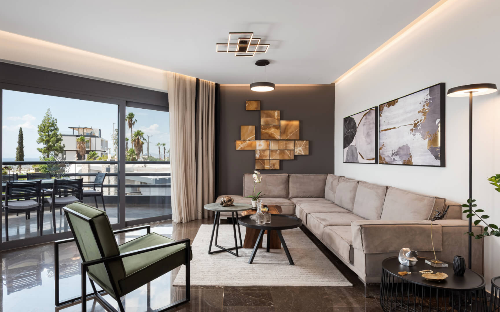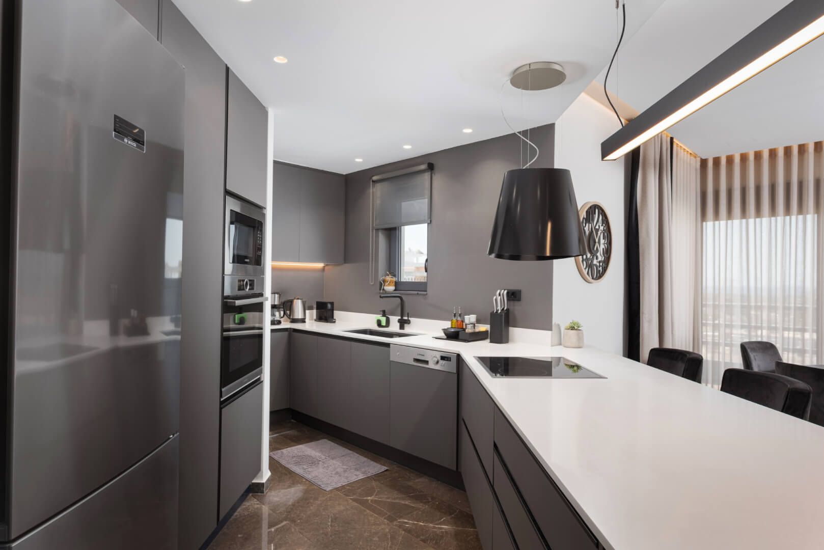 Experience modern luxury of Athenian Riviera Luxurious Residence with stunning sea views in this brand-new 120 sq.m. apartment located on the third floor in Alimos, South Athens. Elegantly designed with contemporary furnishings and stylish décor, this apartment offers an open-plan living area that seamlessly combines comfort with sophistication. Relax on the plush corner sofa beside the sleek modern fireplace or enjoy meals at the chic round dining table. The fully equipped kitchen features ample storage and a pristine white breakfast counter.