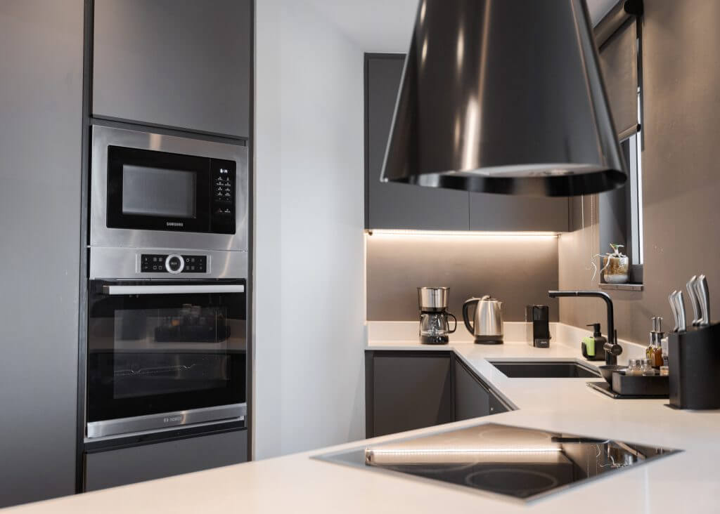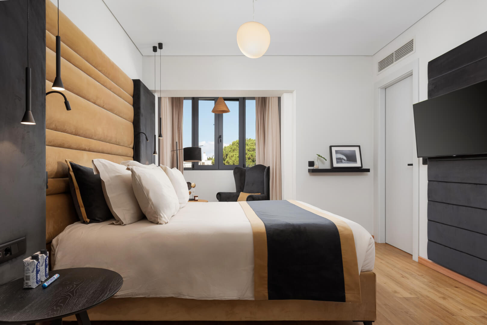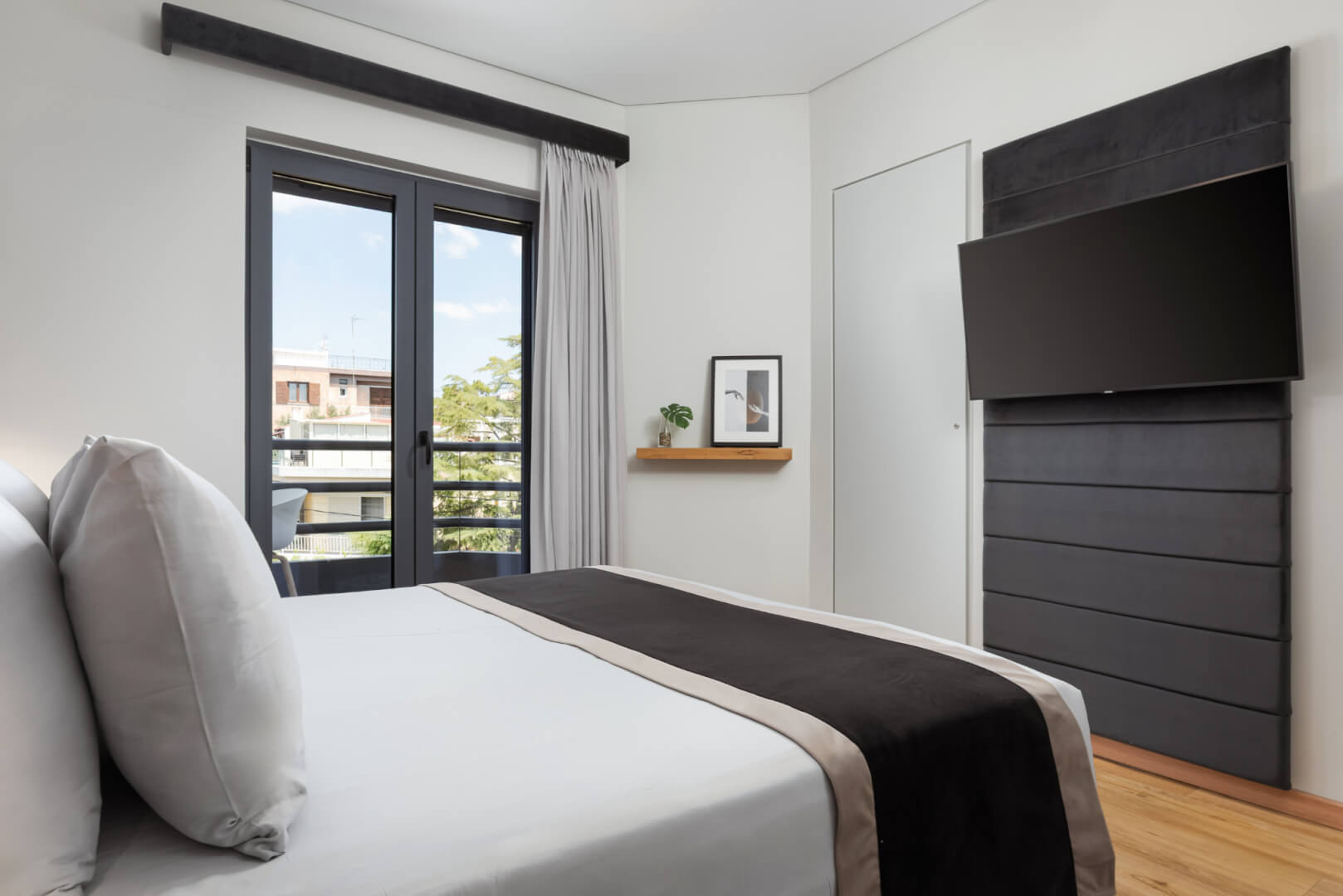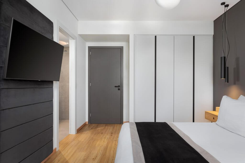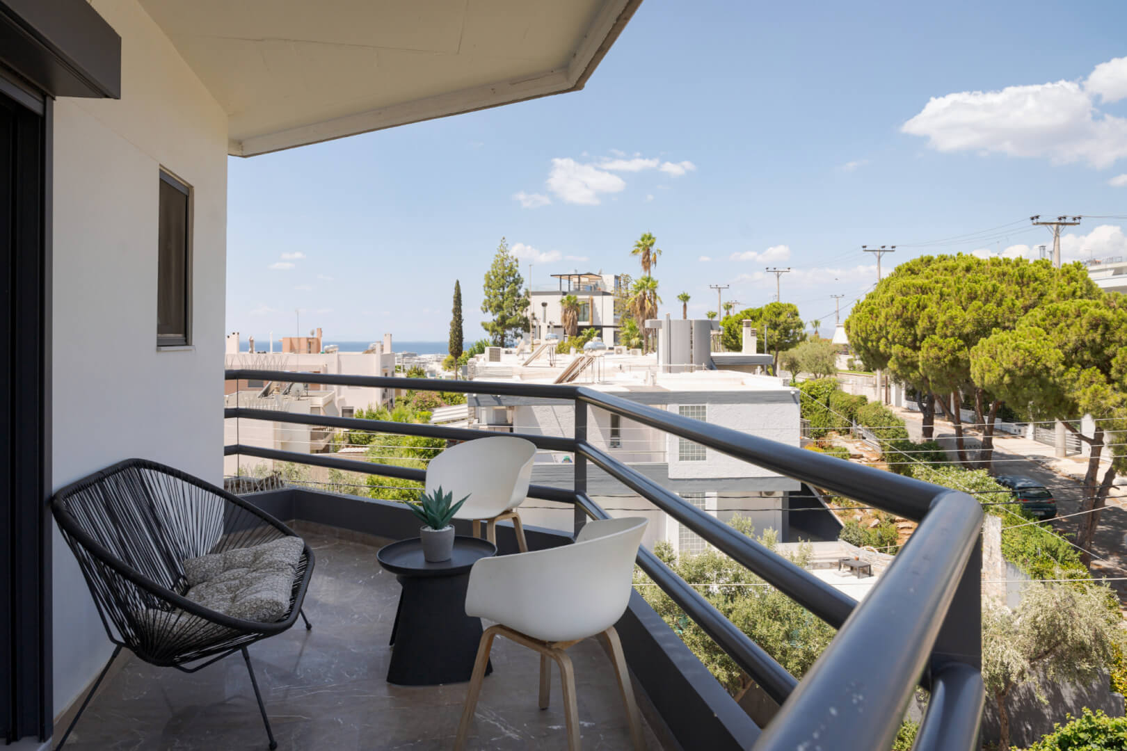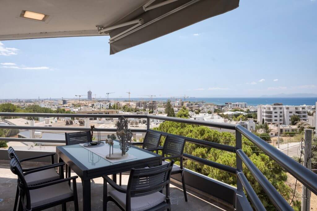 The apartment boasts two luxurious master bedrooms, each with wooden floors, a queen-sized bed, premium mattresses, and elegant linens. Both bedrooms have en-suite bathrooms, and an additional separate WC provides extra convenience. Step out onto the spacious balcony to enjoy breathtaking panoramic views, ideal for morning coffee or evening drinks.