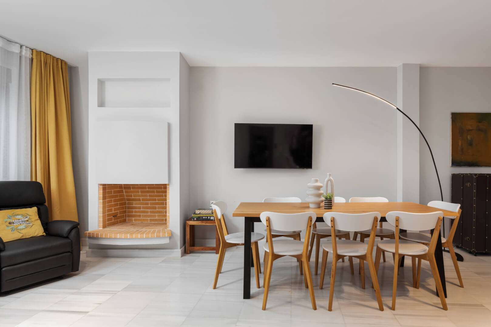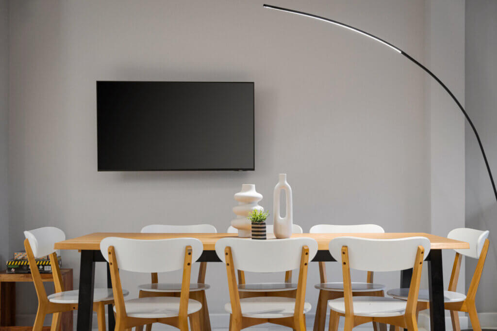 Step into the bright and inviting open-plan living room, designed with contemporary furnishings, a large smart TV, and relaxing seating for gathering after a day at the beach. The adjoining open-concept dining area provides the ideal setting for shared meals and celebrations.
