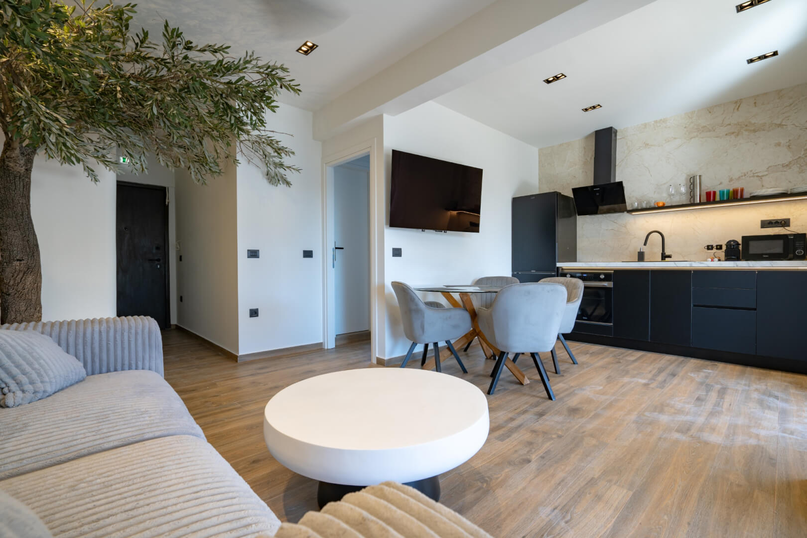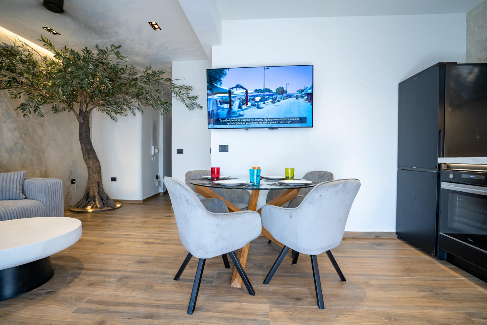 The fully equipped kitchen allows guests to prepare meals with ease. The bright living room provides a relaxing space to unwind after a day by the sea. A signature olive tree feature adds warmth and a distinctive character to the interior.