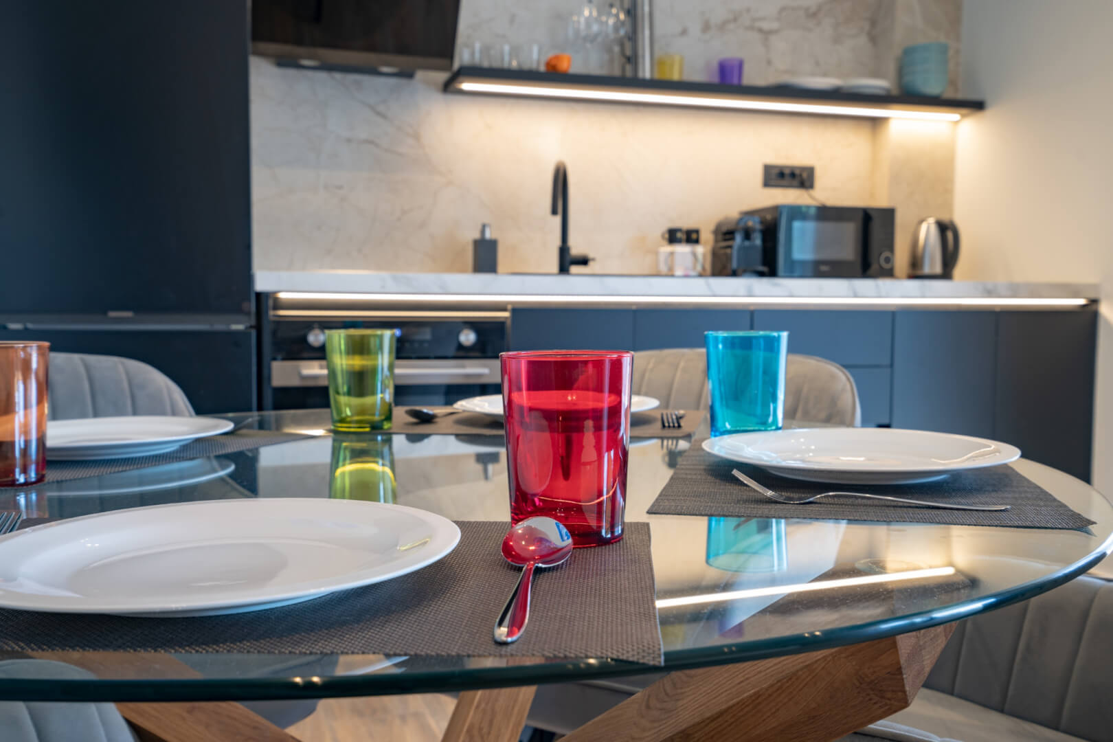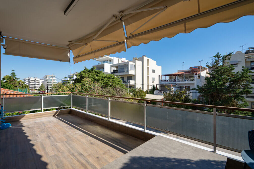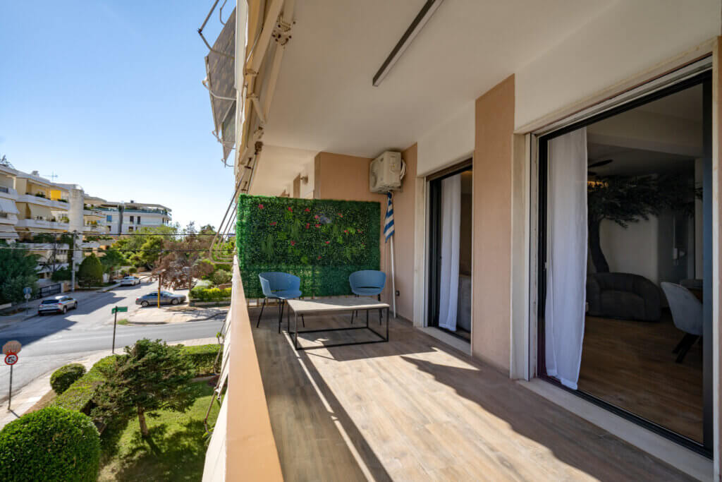 Guests can step out onto the private balcony and enjoy breakfast or dinner at the outdoor dining table. The setting invites you to slow down and embrace the Mediterranean atmosphere of Glyfada. Natural light fills the suite throughout the day and enhances its calm and welcoming feel.