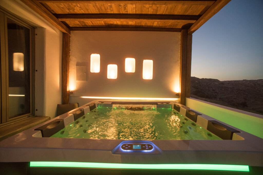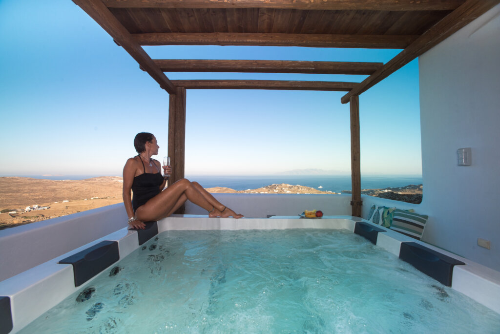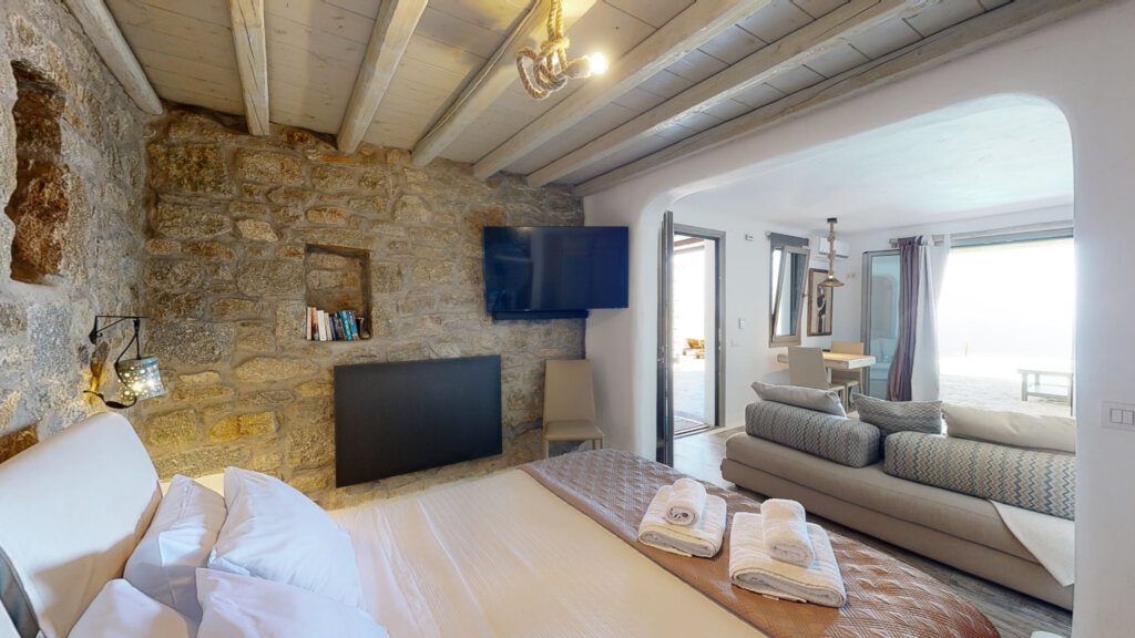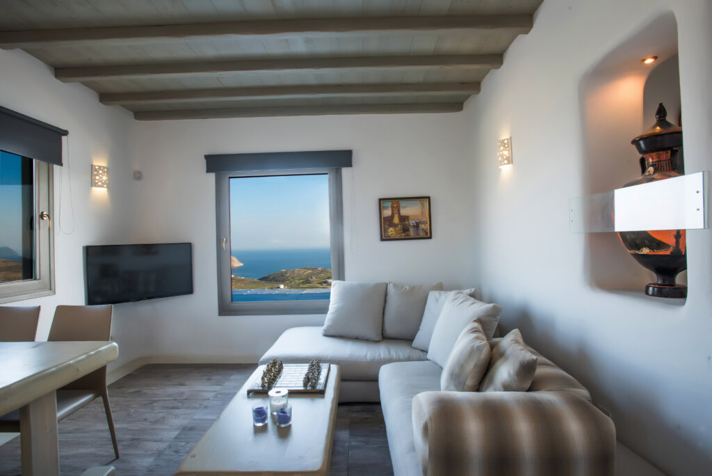 On the first floor, the Aris Sky Suite offers elevated views and a private jacuzzi. The suite accommodates up to six guests. It features a queen-size bedroom and a living area with a double sofa bed. Moreover, the private outdoor space allows you to relax while overlooking the endless blue of the sea. Therefore, it is an excellent choice for guests seeking an added touch of exclusivity.