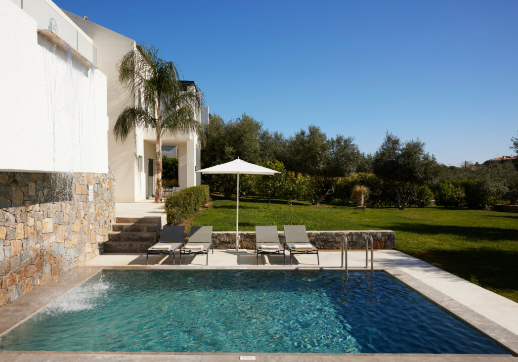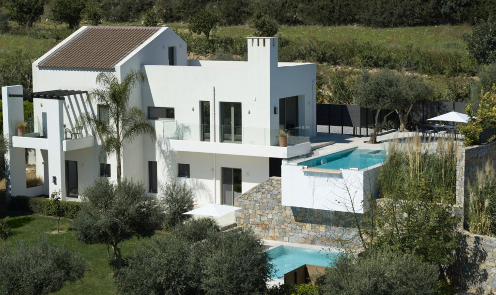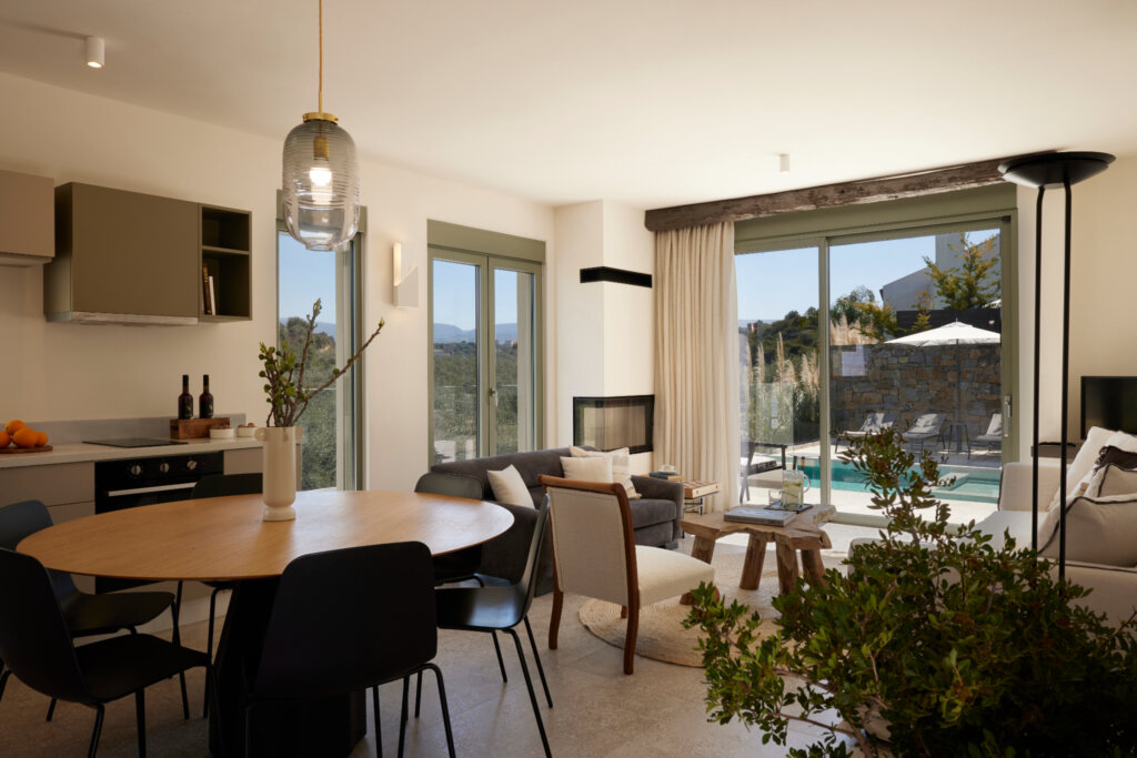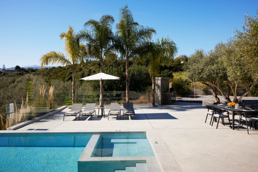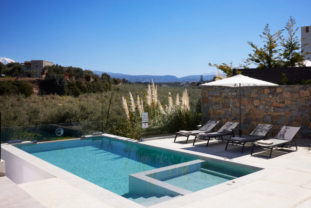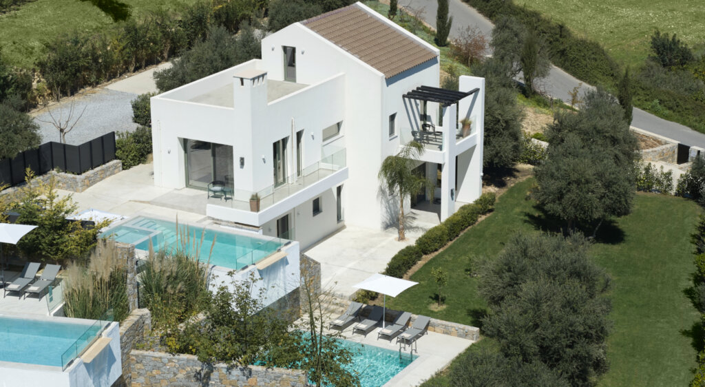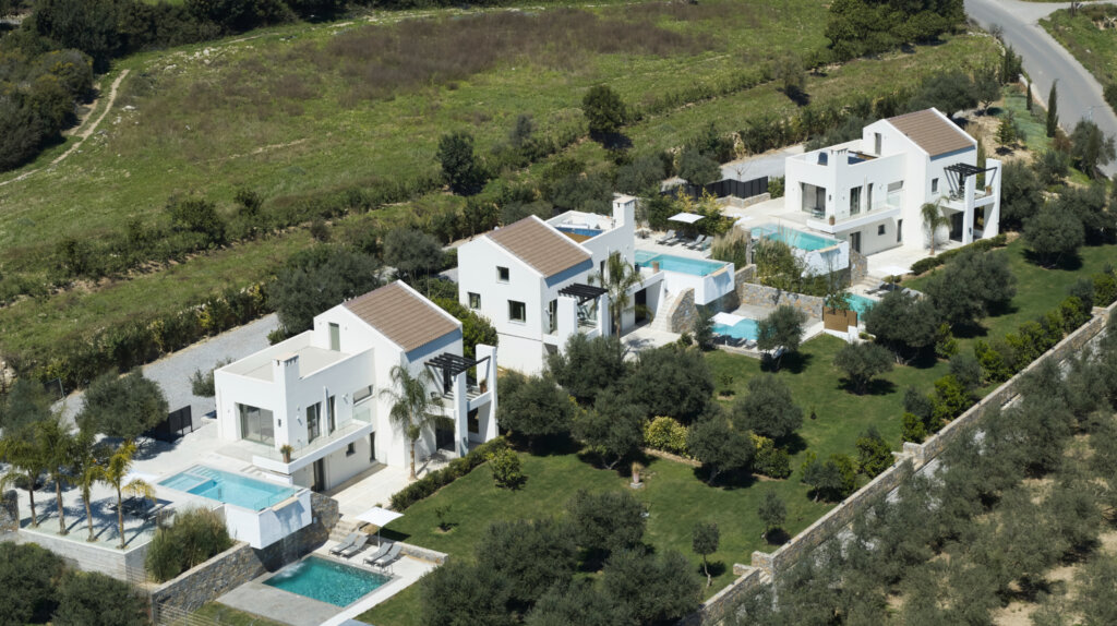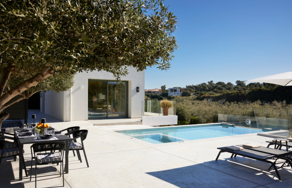 Arbora Olea Luxury Villas features three identical, elegantly designed villas in the peaceful area of Skaleta, near Rethymno in Crete. Moreover, the complex places the villas in a row within a private property. This layout ensures both independence and a shared sense of connection. Therefore, it suits large groups, families, or multiple parties who want privacy while staying close.