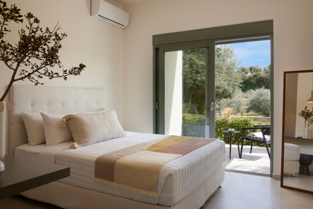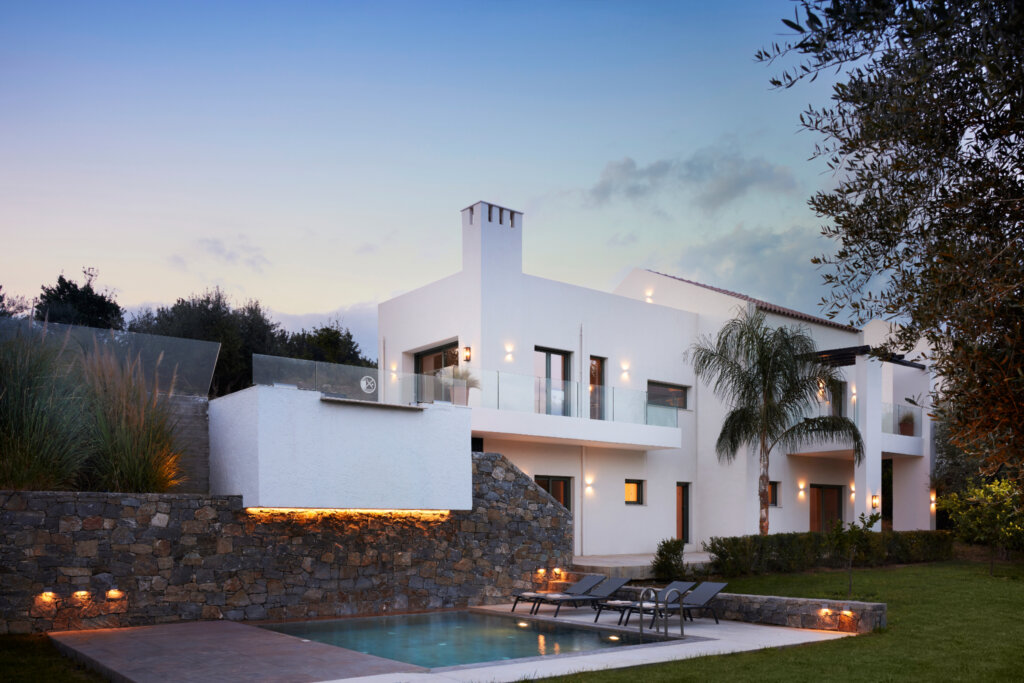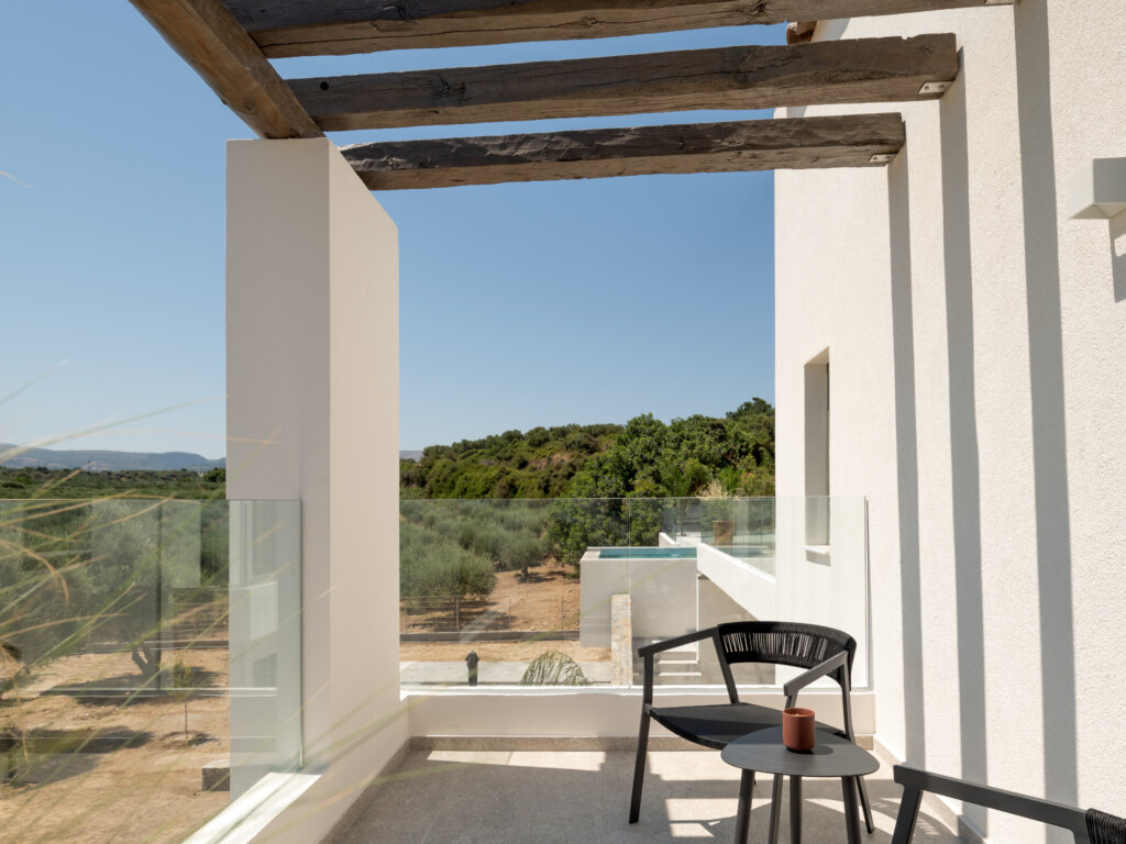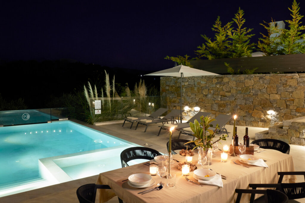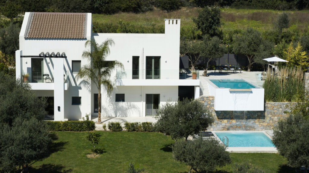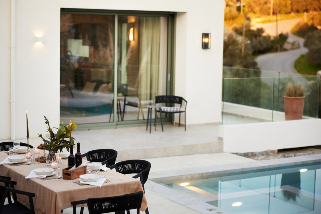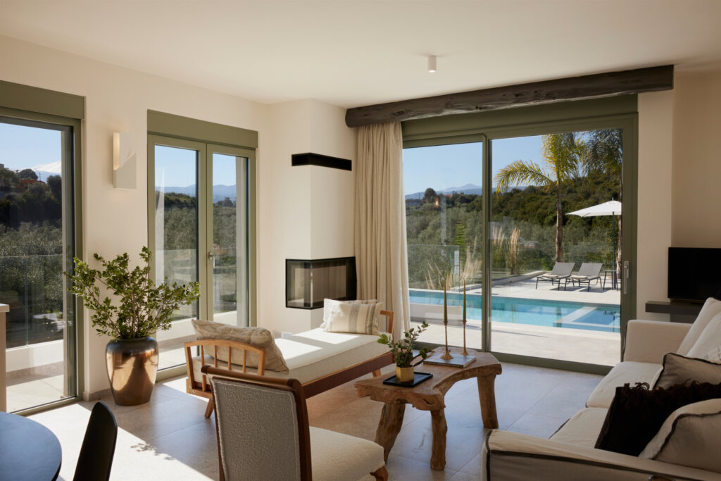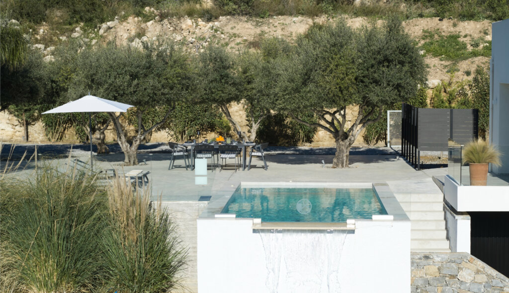 Arbora Olea Luxury Villas features three identical, elegantly designed villas in the peaceful area of Skaleta, near Rethymno in Crete. Moreover, the complex places the villas in a row within a private property. This layout ensures both independence and a shared sense of connection. Therefore, it suits large groups, families, or multiple parties who want privacy while staying close.