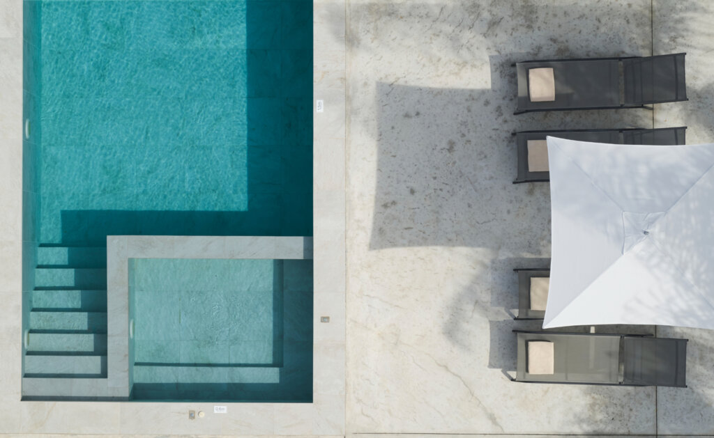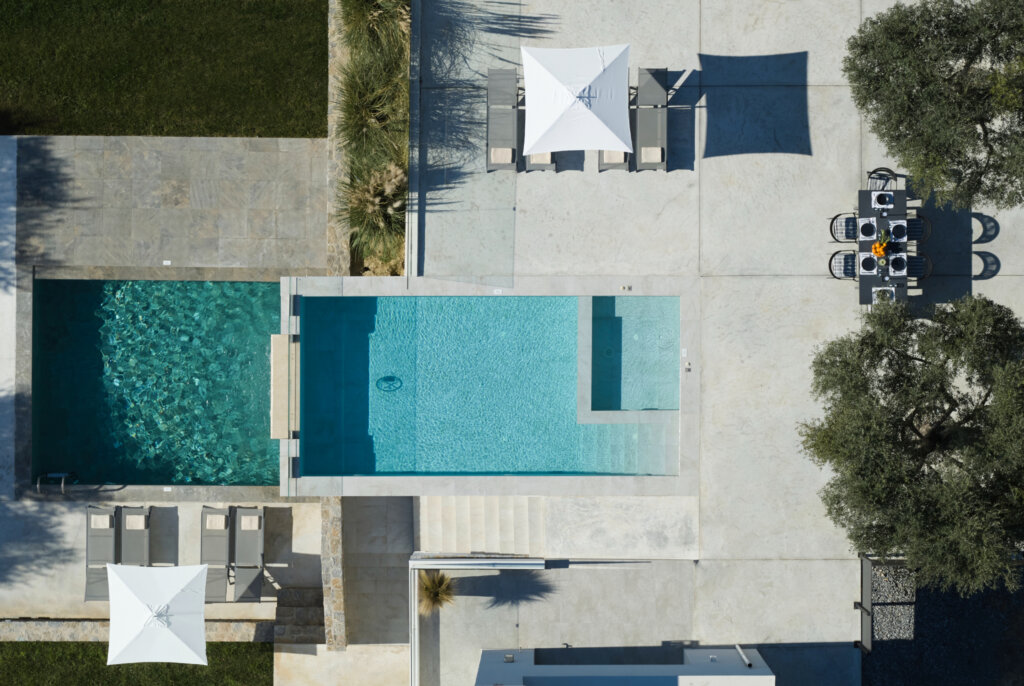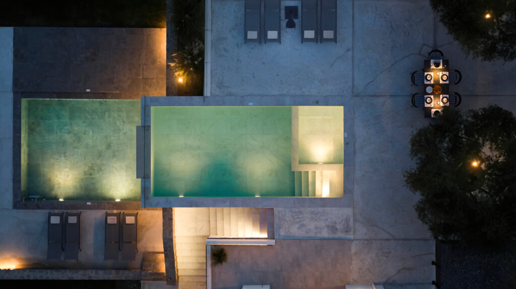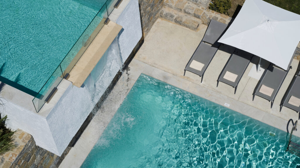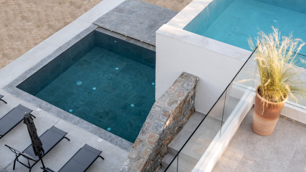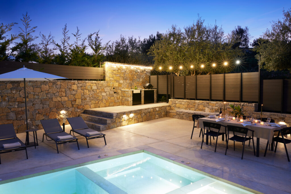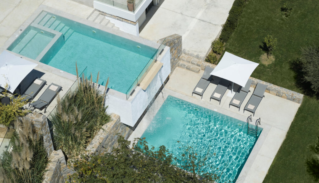 Outdoors, each villa showcases a distinctive multi-level pool design. On the ground floor, guests enjoy a heated swimming pool up to 27°C, available at an extra cost. This pool includes a built-in plunge section ideal for children. Furthermore, water gently overflows from the upper pool and cascades into a larger pool below. Consequently, it creates a striking visual effect and a refreshing atmosphere. Each villa also features a dedicated barbecue area for outdoor dining.