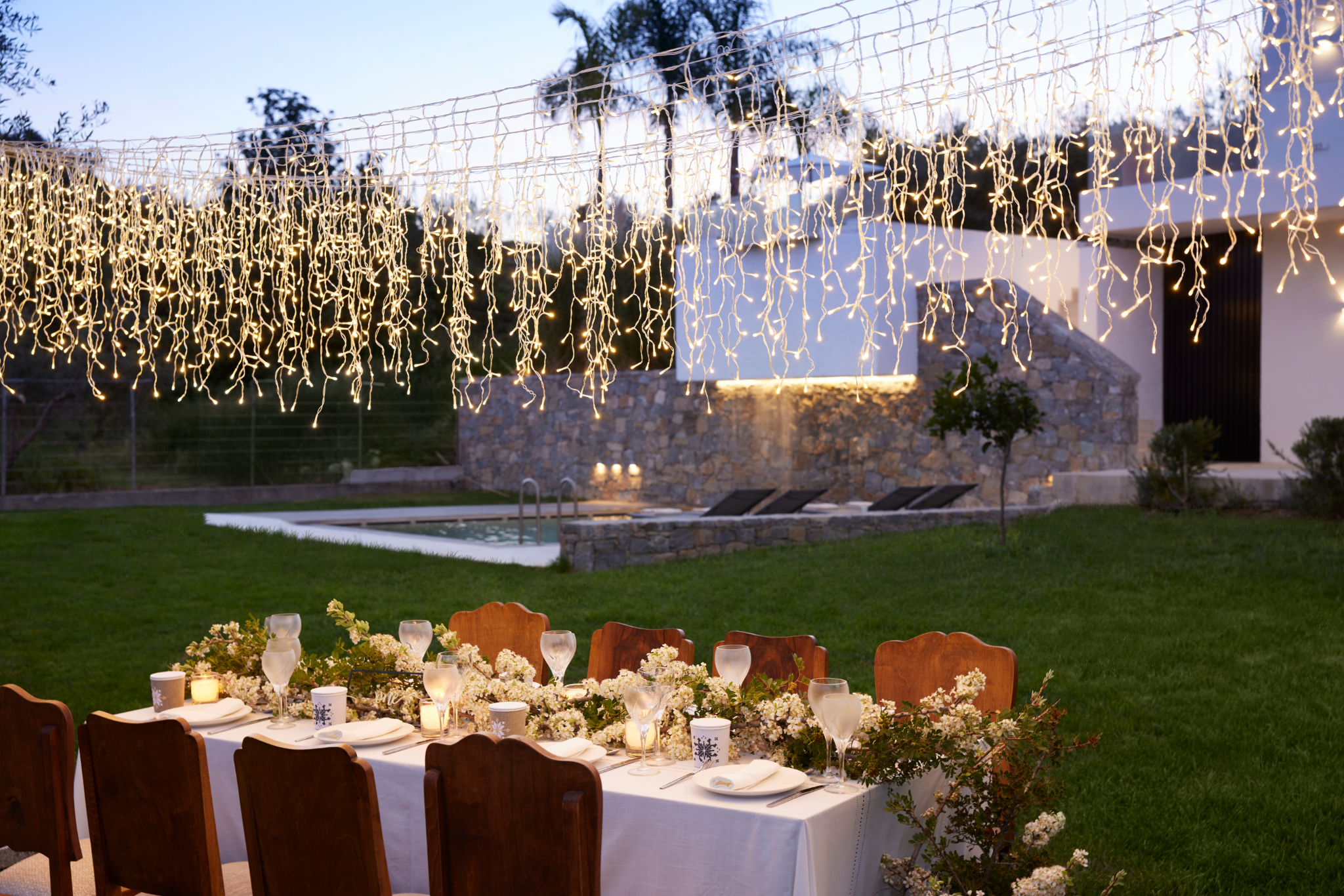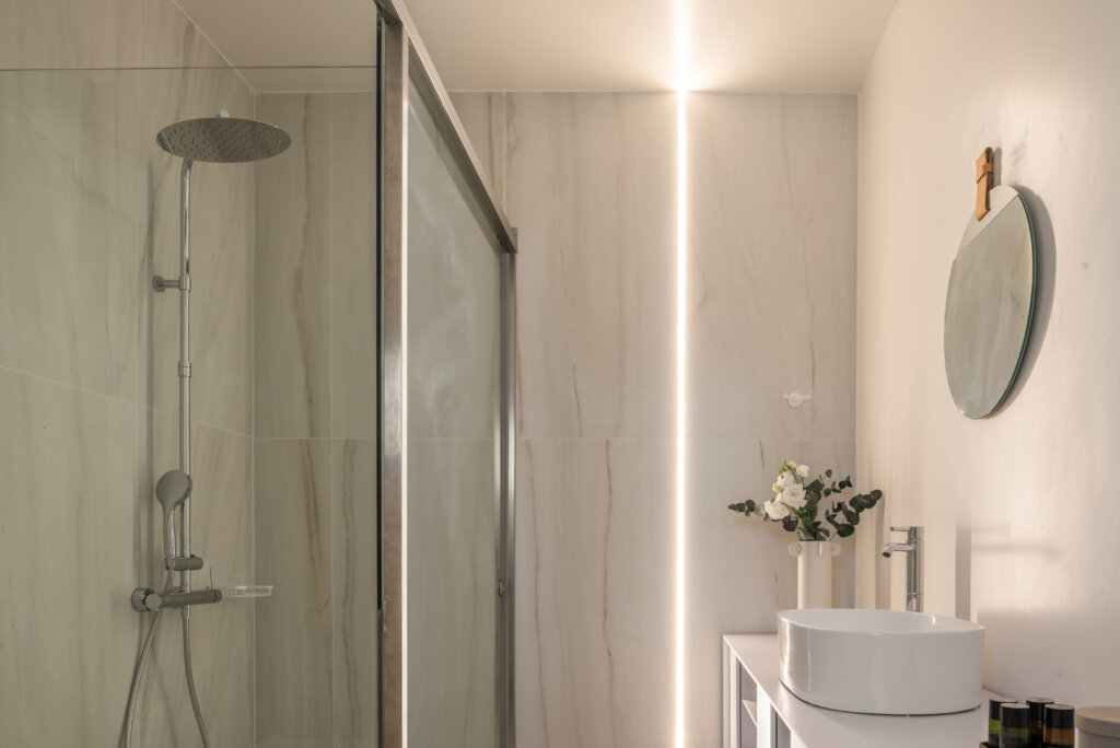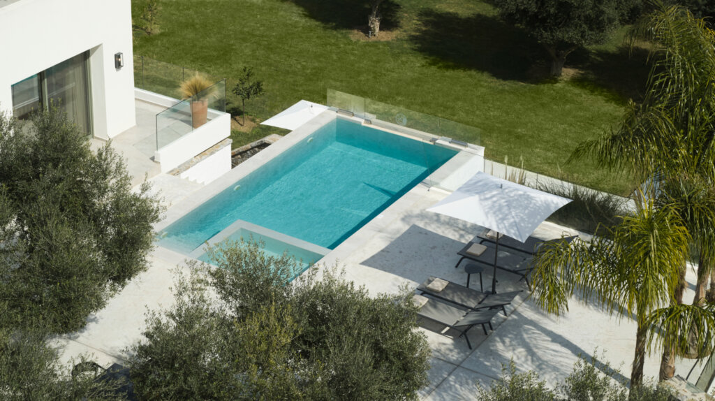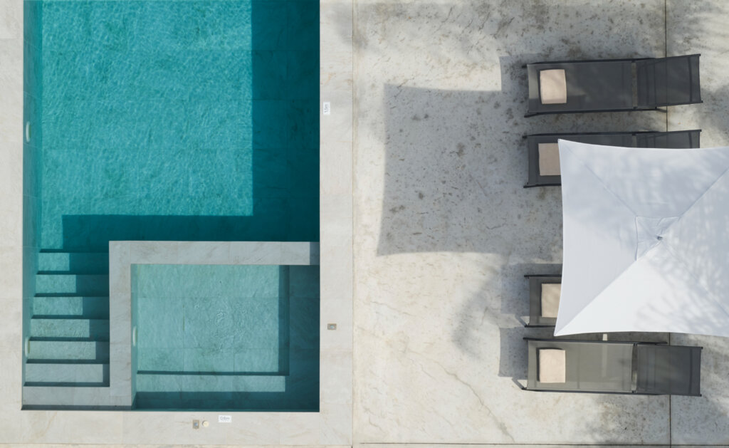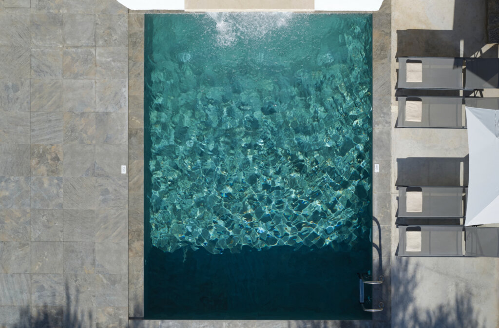 Outdoors, each villa showcases a distinctive multi-level pool design. On the ground floor, guests enjoy a heated swimming pool up to 27°C, available at an extra cost. This pool includes a built-in plunge section ideal for children. Furthermore, water gently overflows from the upper pool and cascades into a larger pool below. Consequently, it creates a striking visual effect and a refreshing atmosphere. Each villa also features a dedicated barbecue area for outdoor dining.