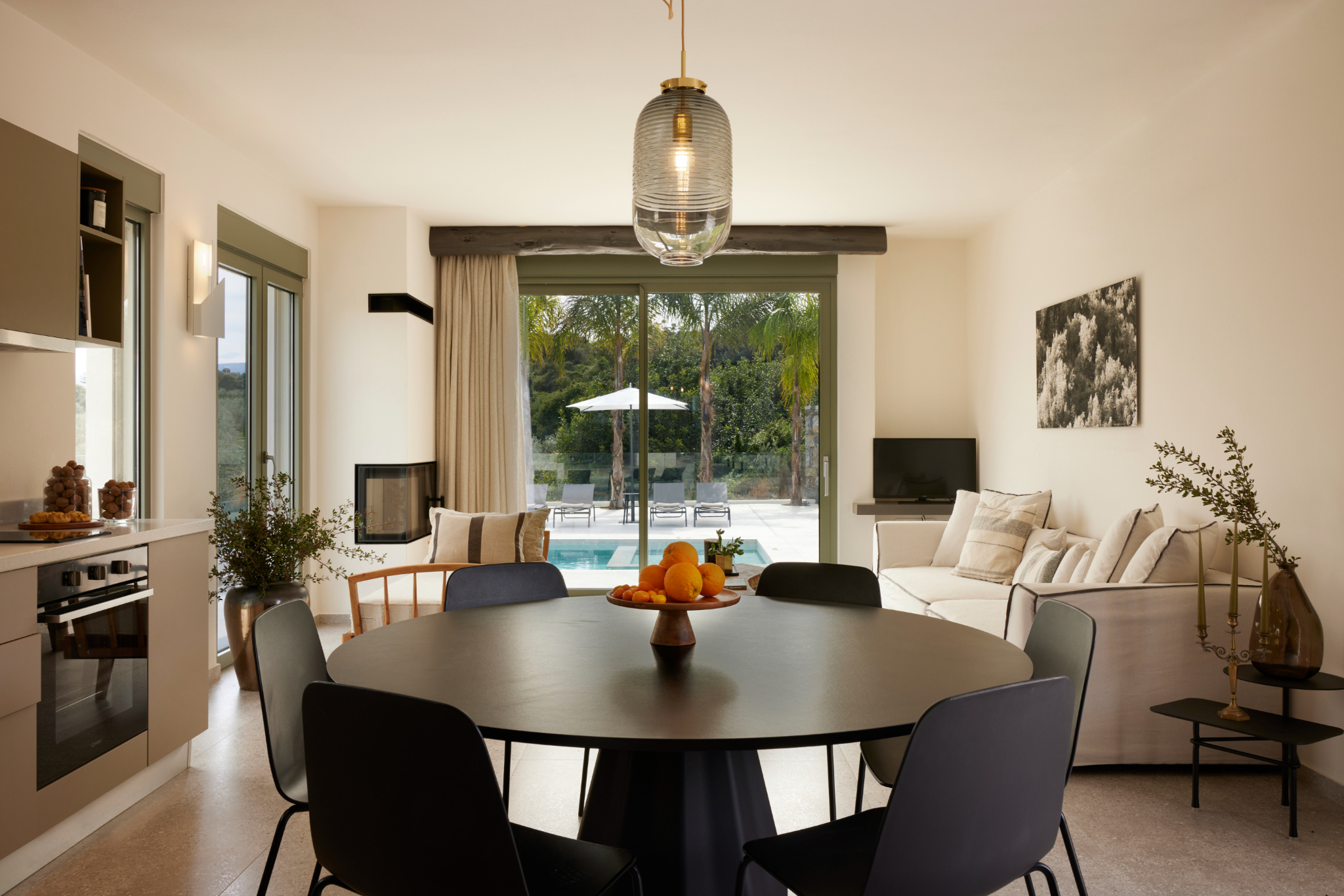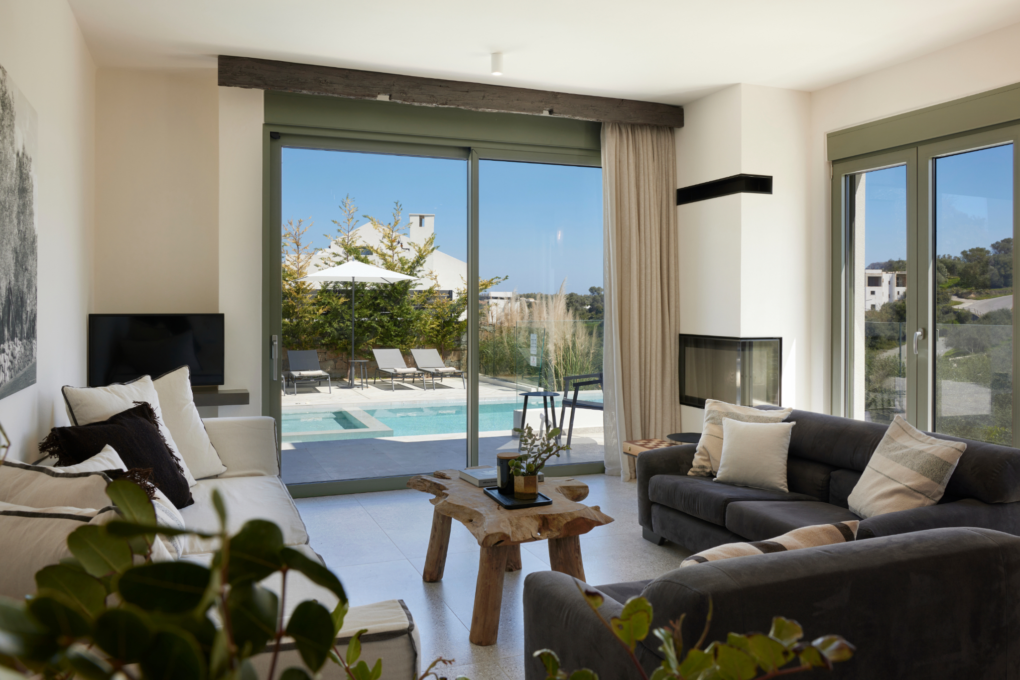 Inside, the villas include four spacious bedrooms with queen-size beds and en-suite bathrooms. Thus, every guest enjoys privacy and comfort. One bedroom also includes a double sofa bed for two extra adults. In addition, a guest WC sits conveniently at the entrance. The bright living room accommodates one extra bed, while the fully equipped kitchen supports easy meal preparation. For cooler evenings, guests can use the indoor fireplace, available at an extra cost.