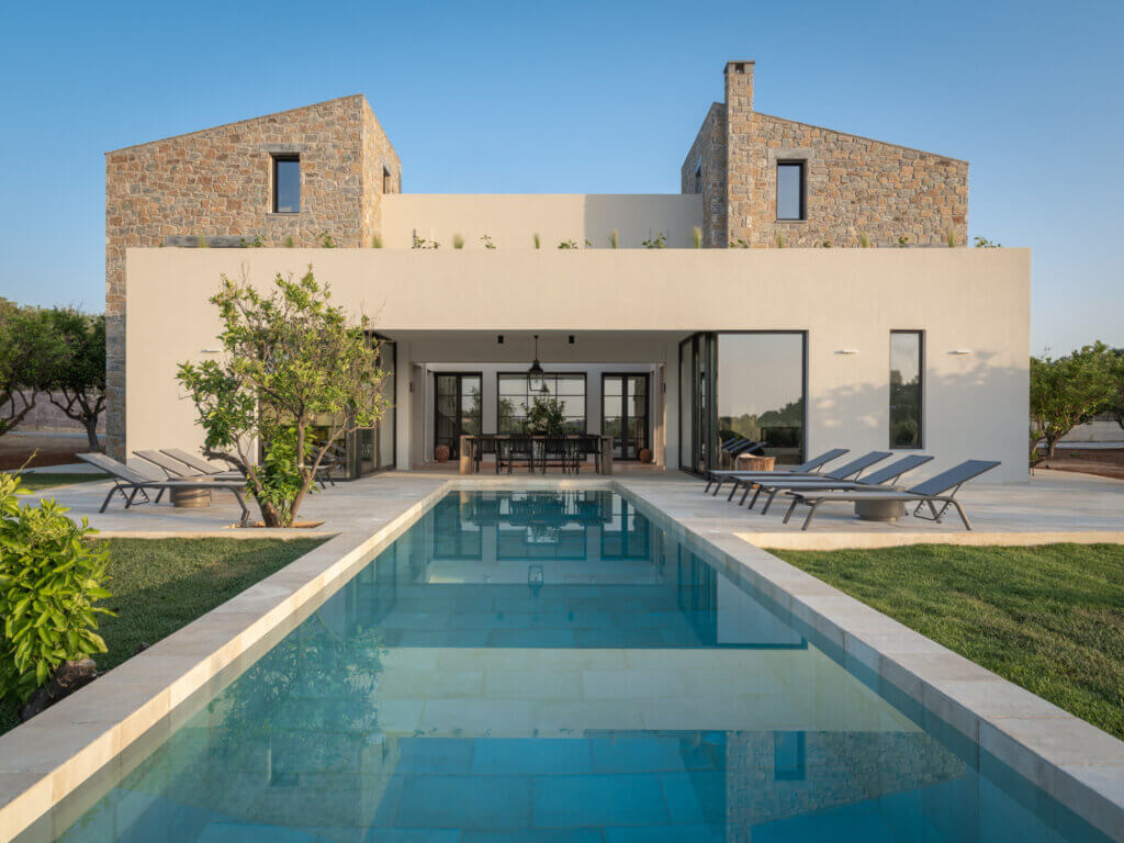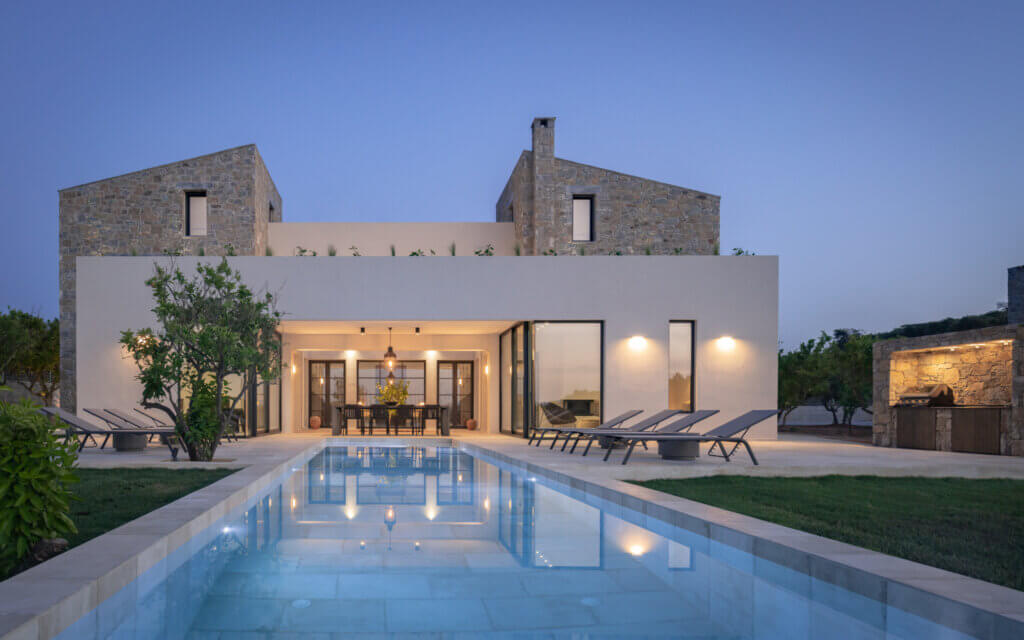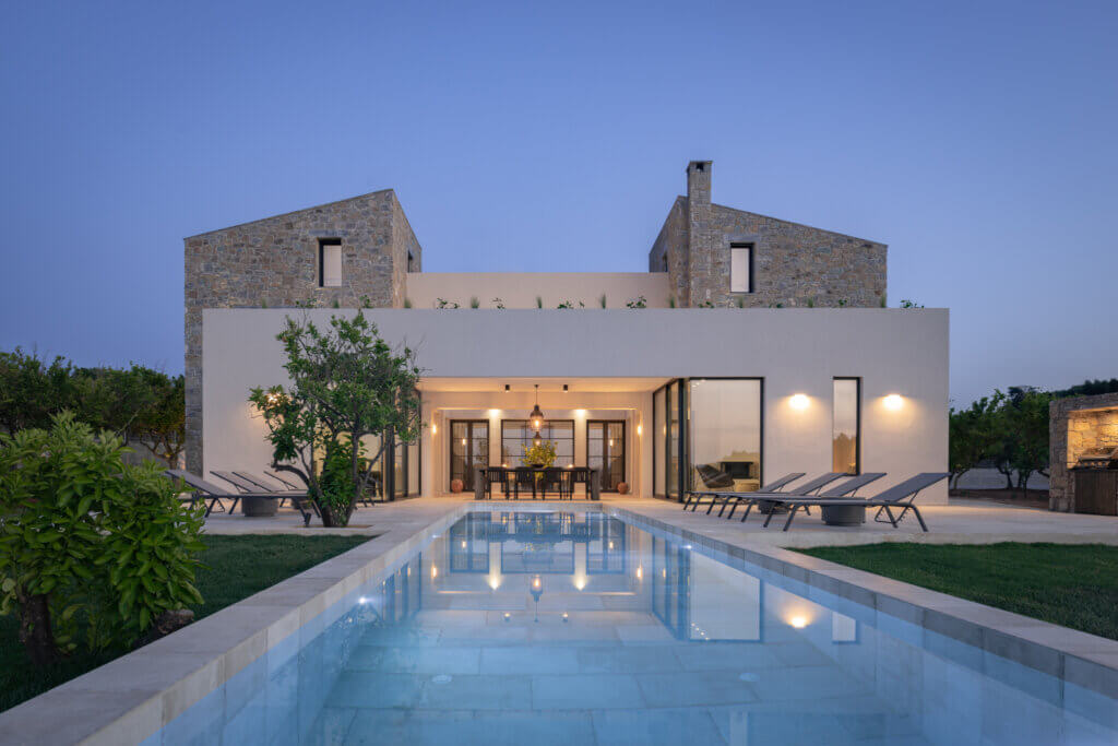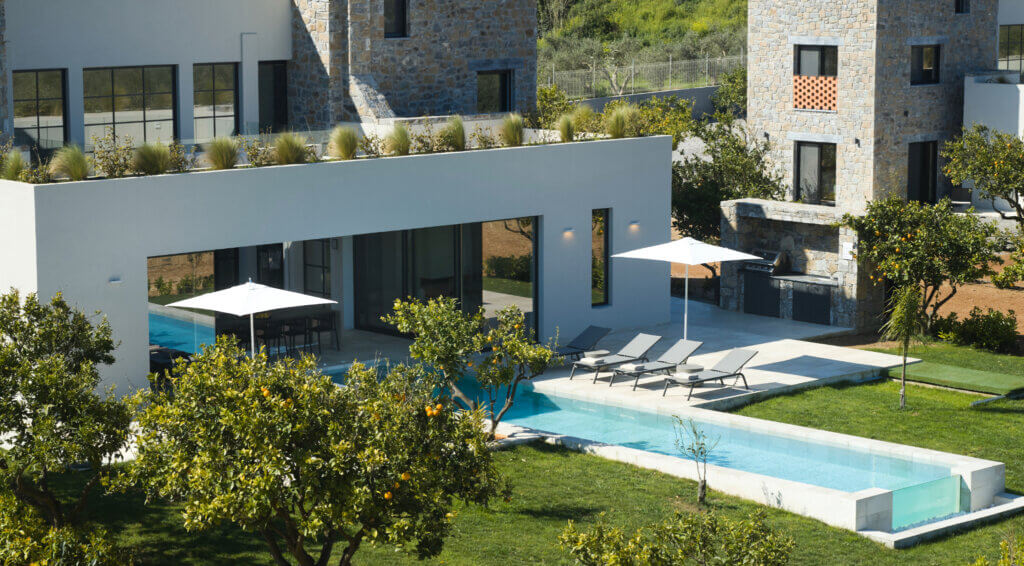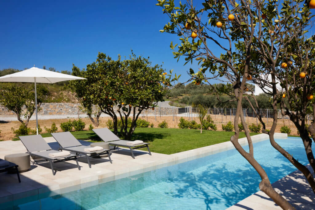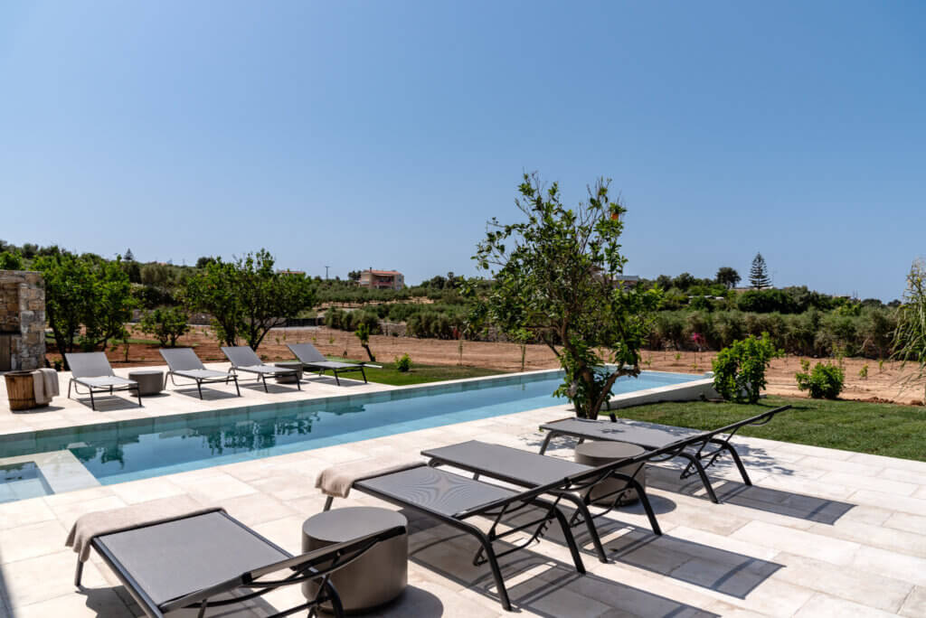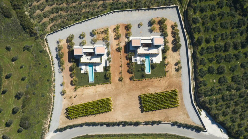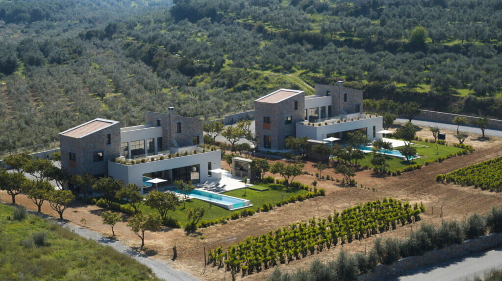 Citrus Grove Luxury Villas is a private complex of two identical, elegantly designed villas, located in Prinos near Rethymno, Crete. The villas sit within a gated estate, offering both privacy and a sense of connection. Therefore, the property suits families and groups who want to stay close while enjoying their own space.