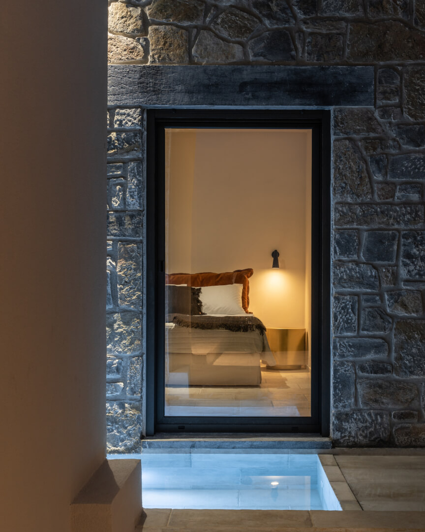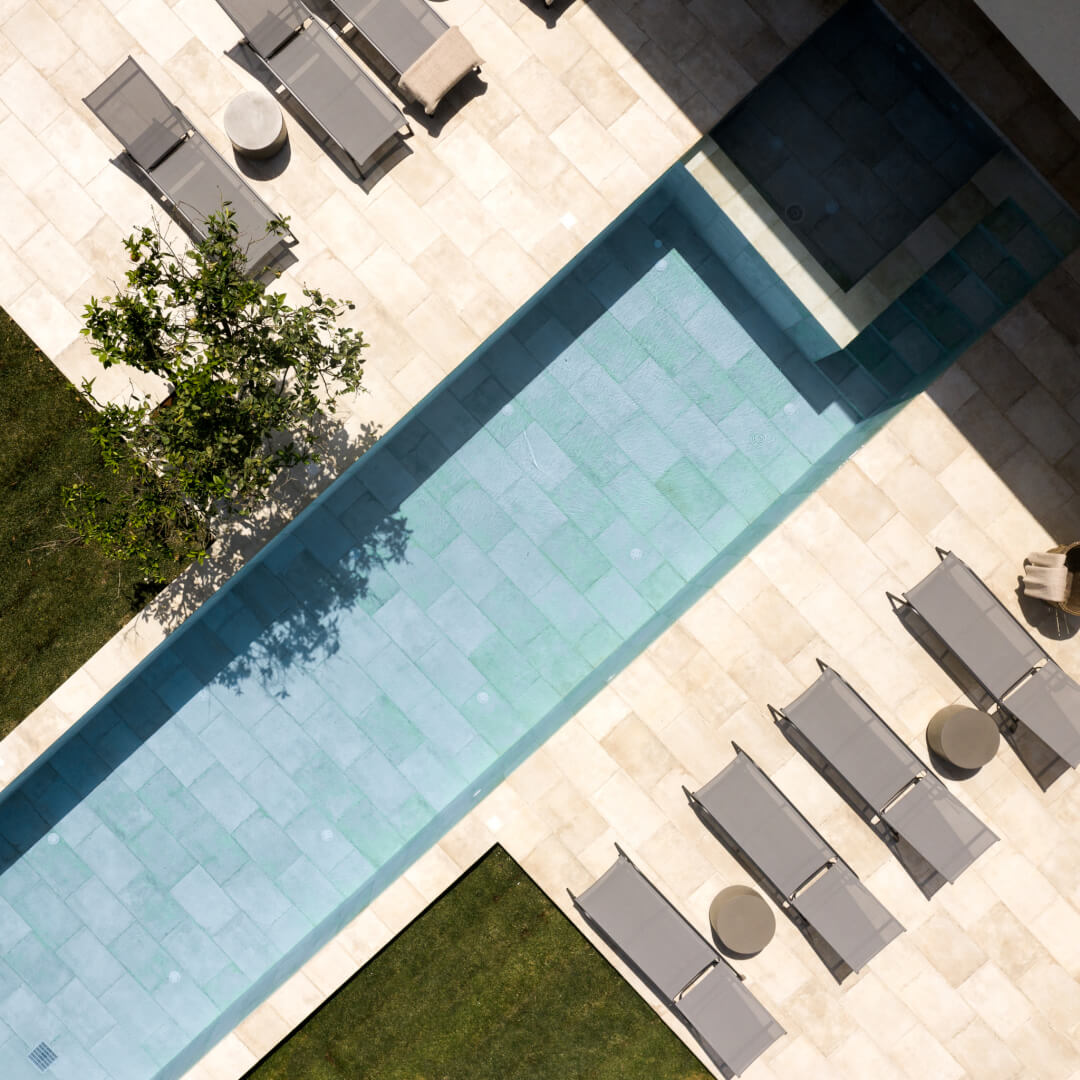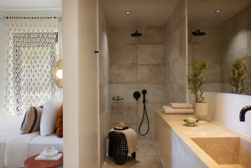 Outside, each villa features a private swimming pool with an integrated plunge section. The pool can also be heated (up to 27°C) at an additional cost of 80€. Guests can swim, relax, or spend time together with ease. Around the pool, sun loungers and umbrellas create a comfortable setting. Moreover, each villa offers a barbecue area and an outdoor dining space. This setup makes outdoor meals simple and enjoyable.