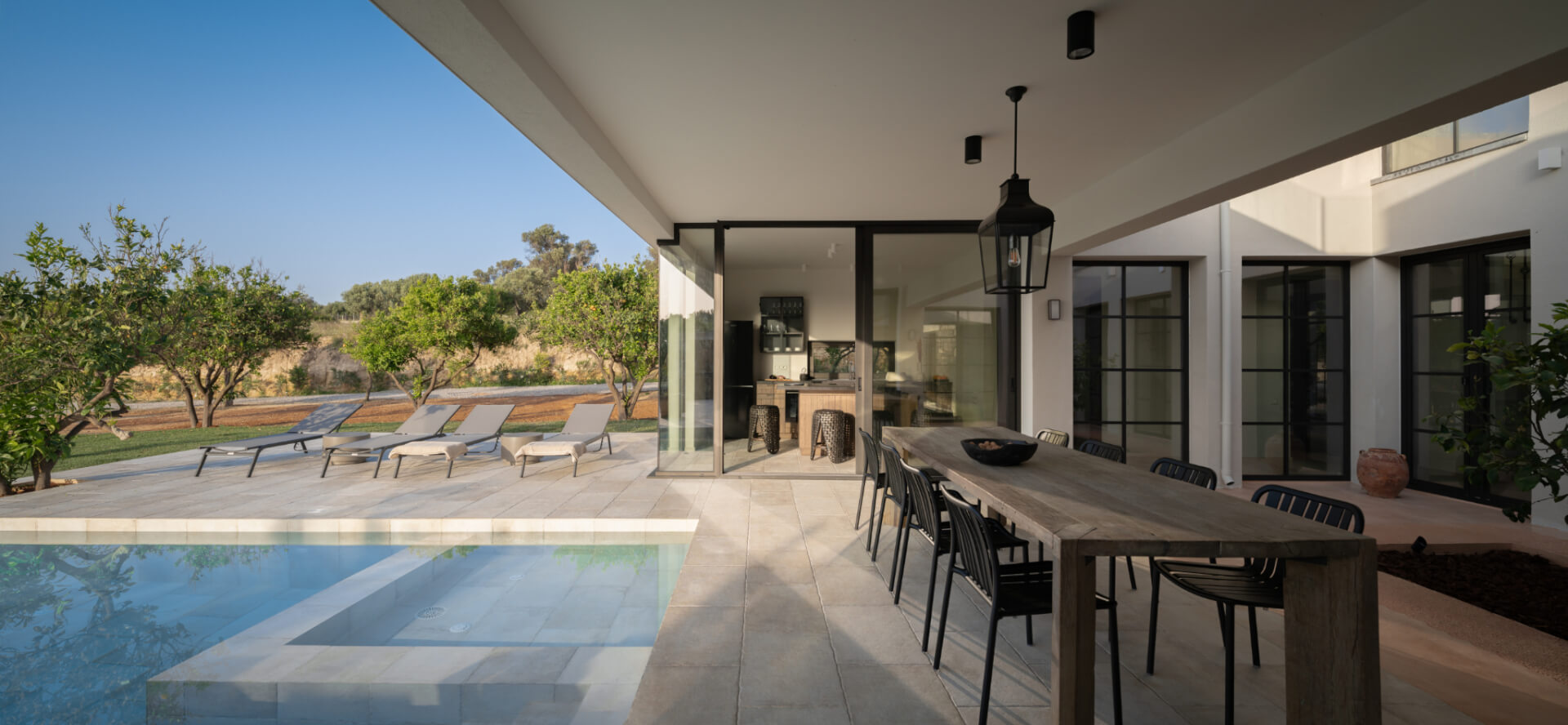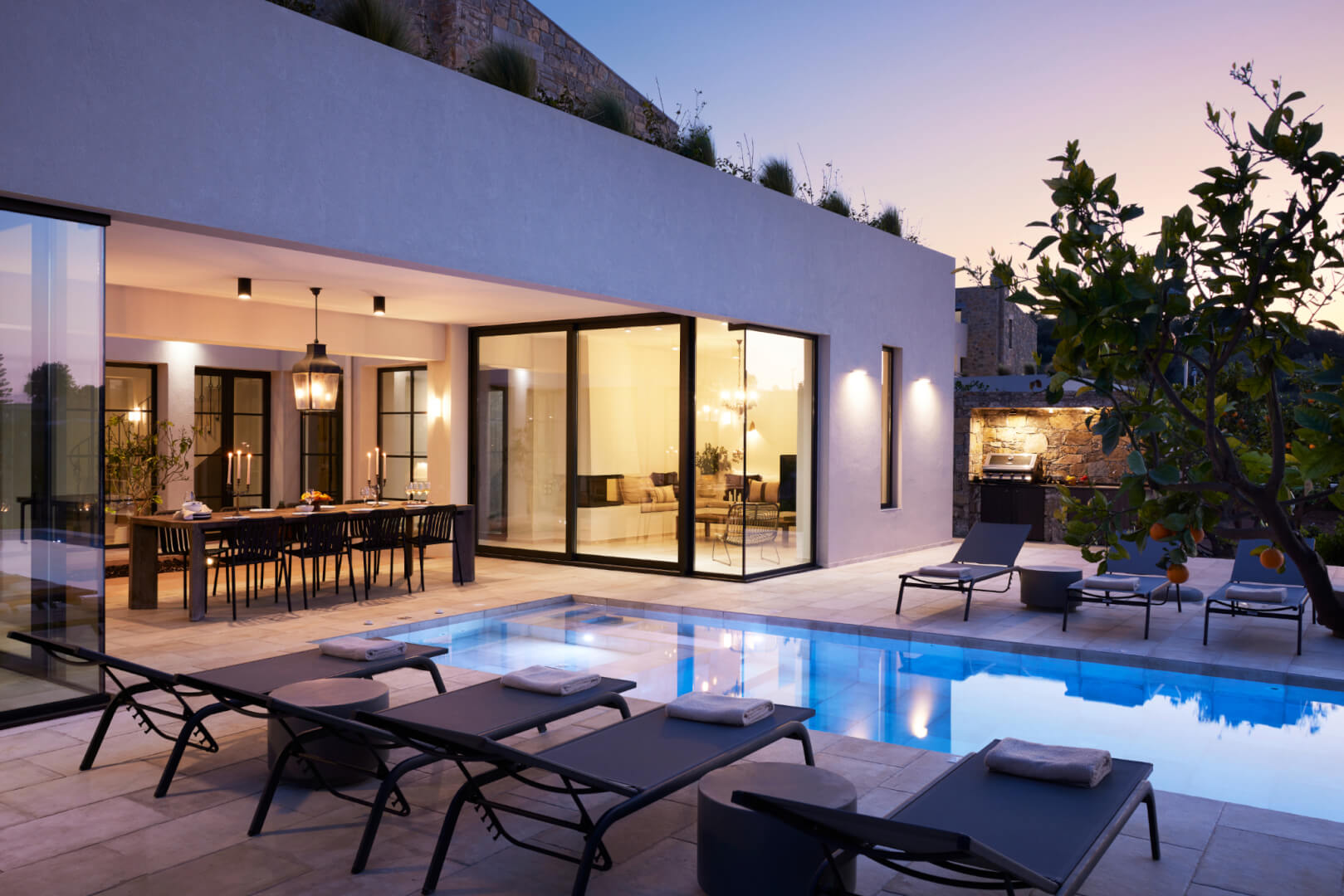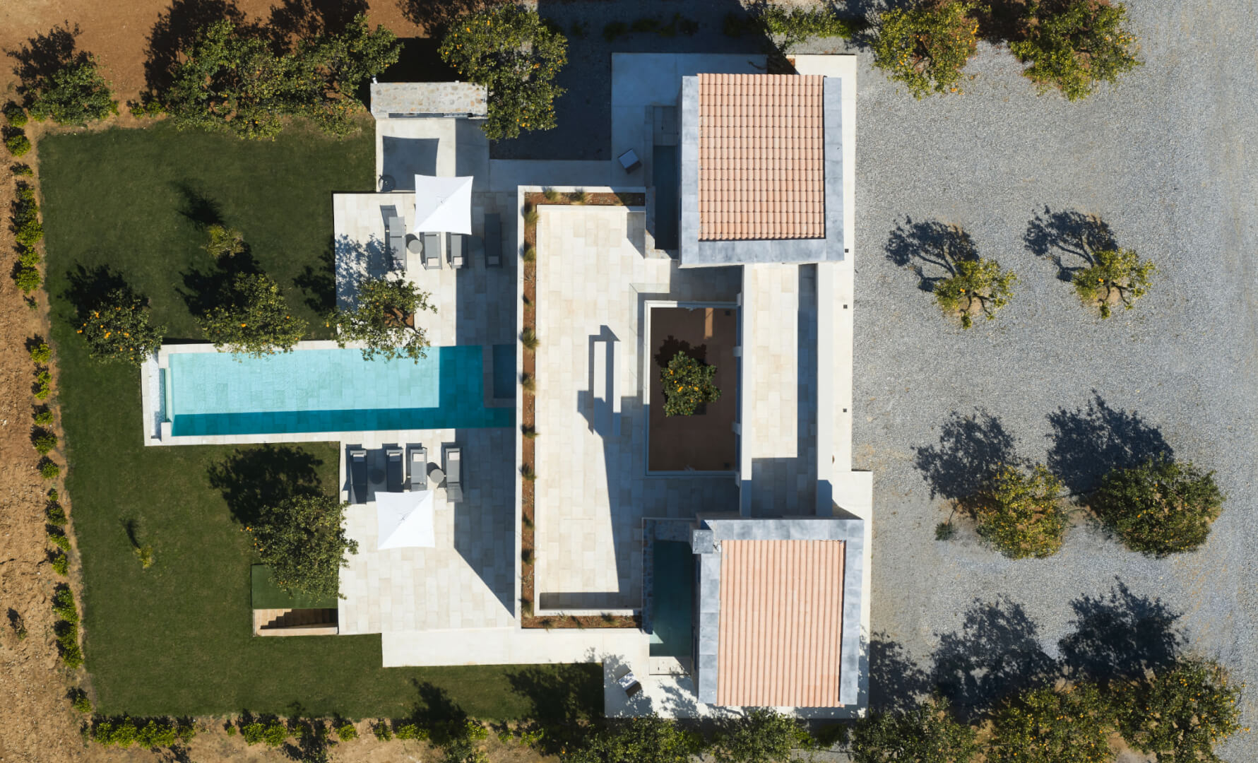 At the entrance, guests arrive at Lemon Tree Villa and Orange Tree Villa, placed for easy access and comfort. Each villa covers 210 sqm and combines modern style with practical design. As a result, guests enjoy a relaxed and welcoming atmosphere throughout their stay.