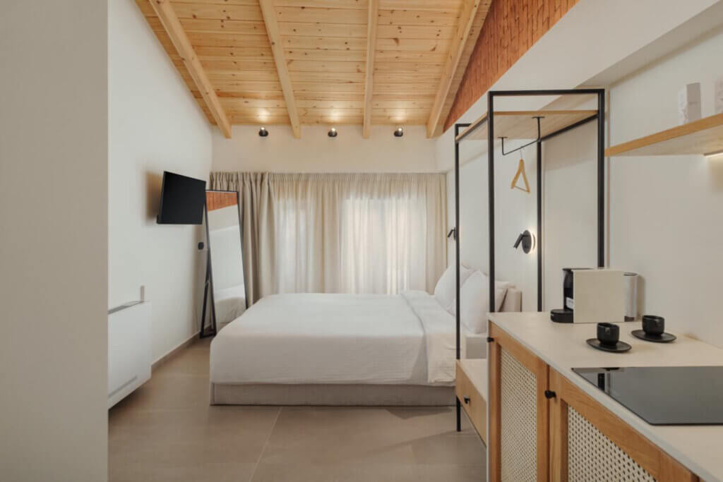 Inside, the villa welcomes guests with a bright and airy living room, ideal for gathering with family or friends. The fully equipped kitchen provides everything needed for home-cooked meals and effortless entertaining. Artisan Villa Aegina offers three comfortable bedrooms, each designed for rest and privacy. Two of the three full bathrooms are ensuite, while an additional WC adds extra convenience for guests.