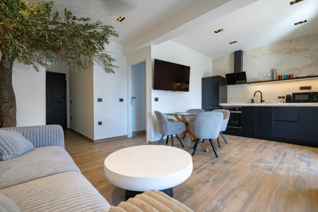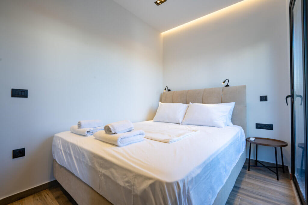 Inside, you’ll find two bright and airy living rooms, ideal for relaxing, entertaining, or simply enjoying the serene views. The villa also includes fully equipped kitchens, perfect for preparing meals using fresh local ingredients or hosting elegant dinners. Every space has been thoughtfully designed with a focus on comfort, style, and functionality.