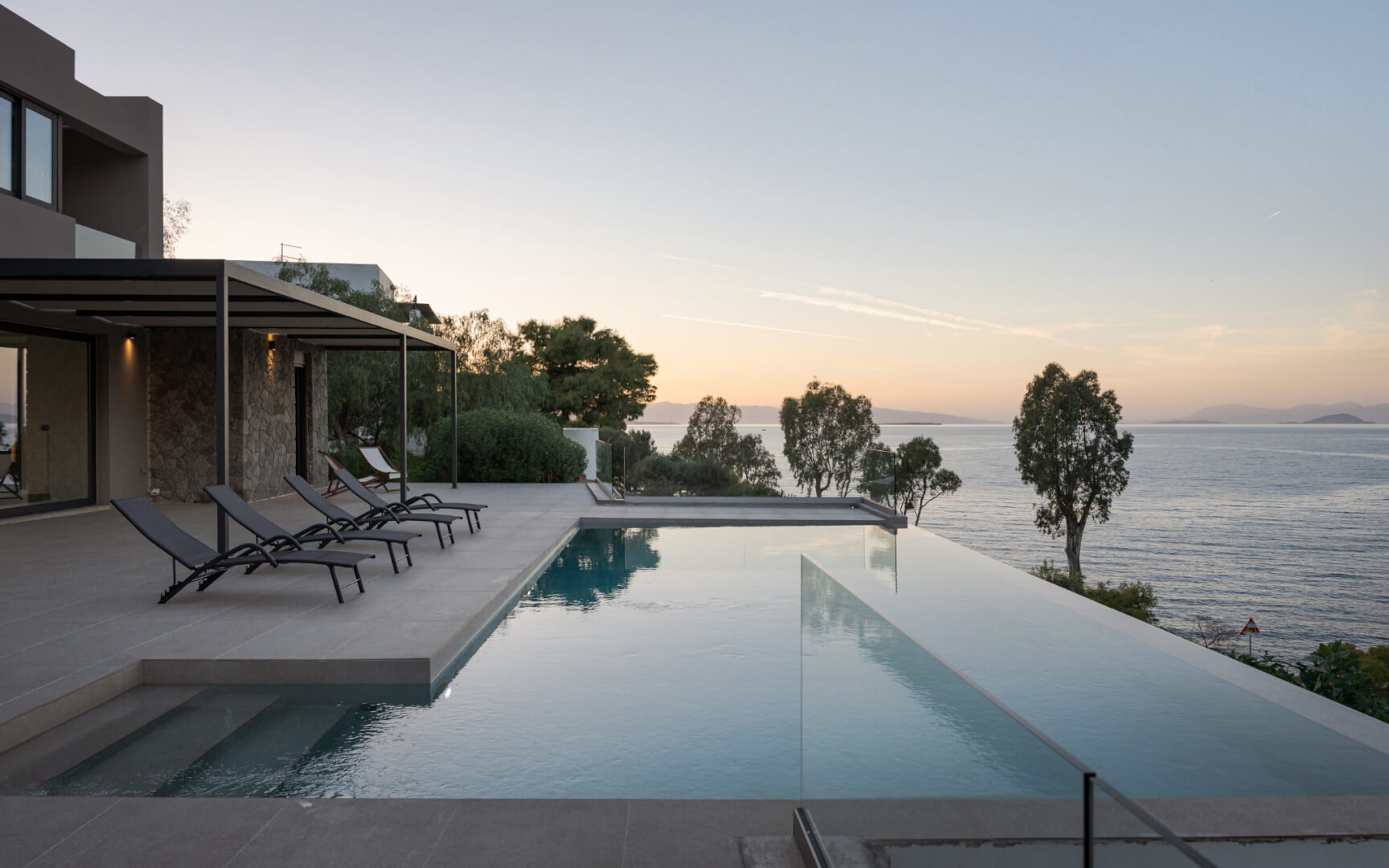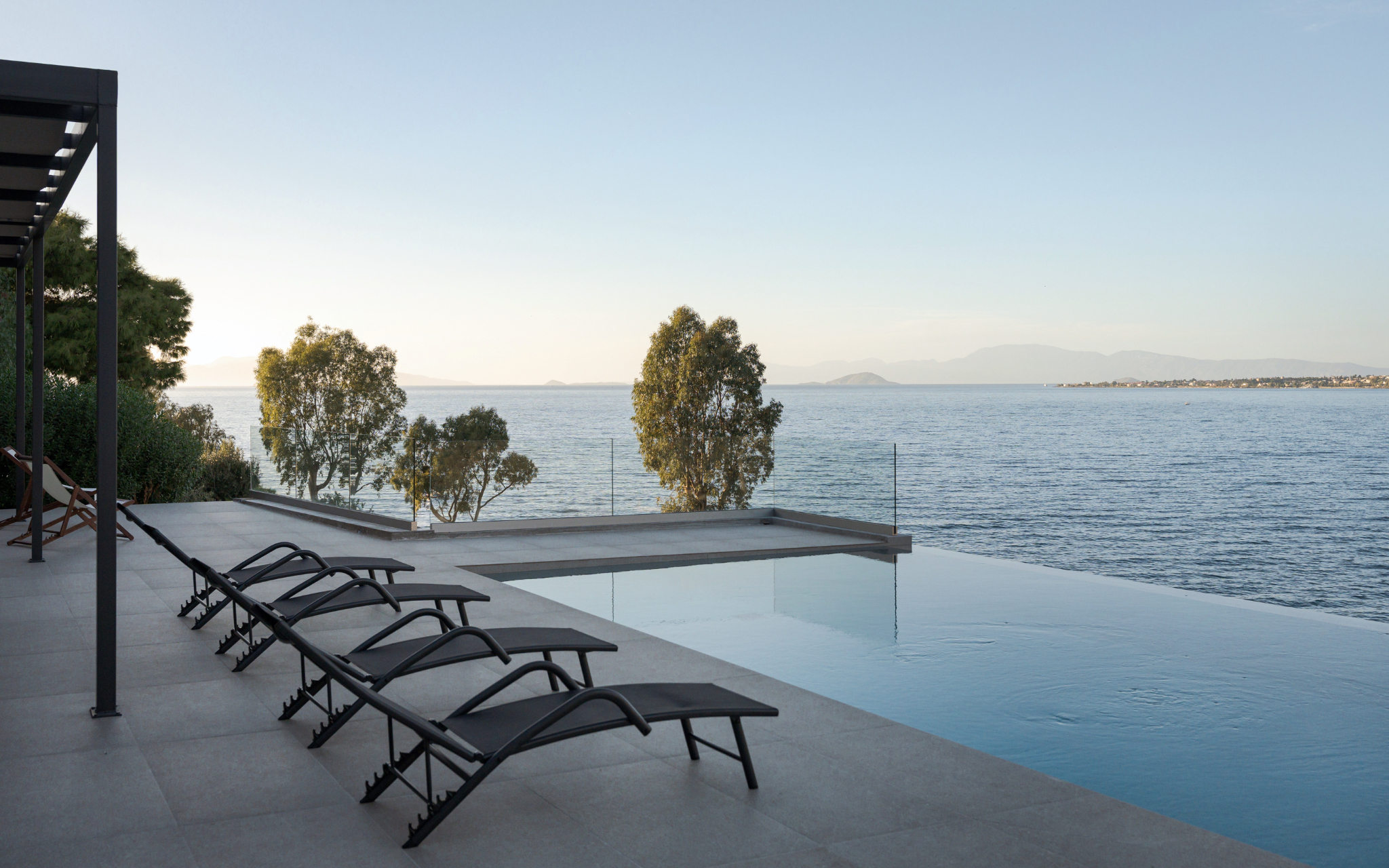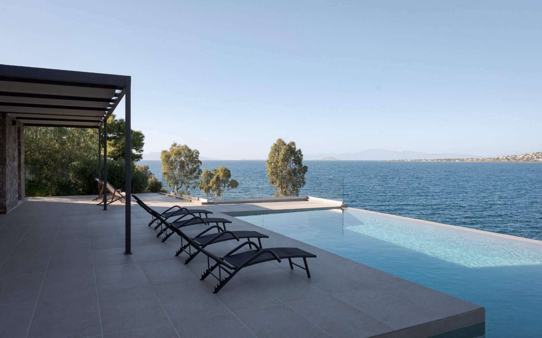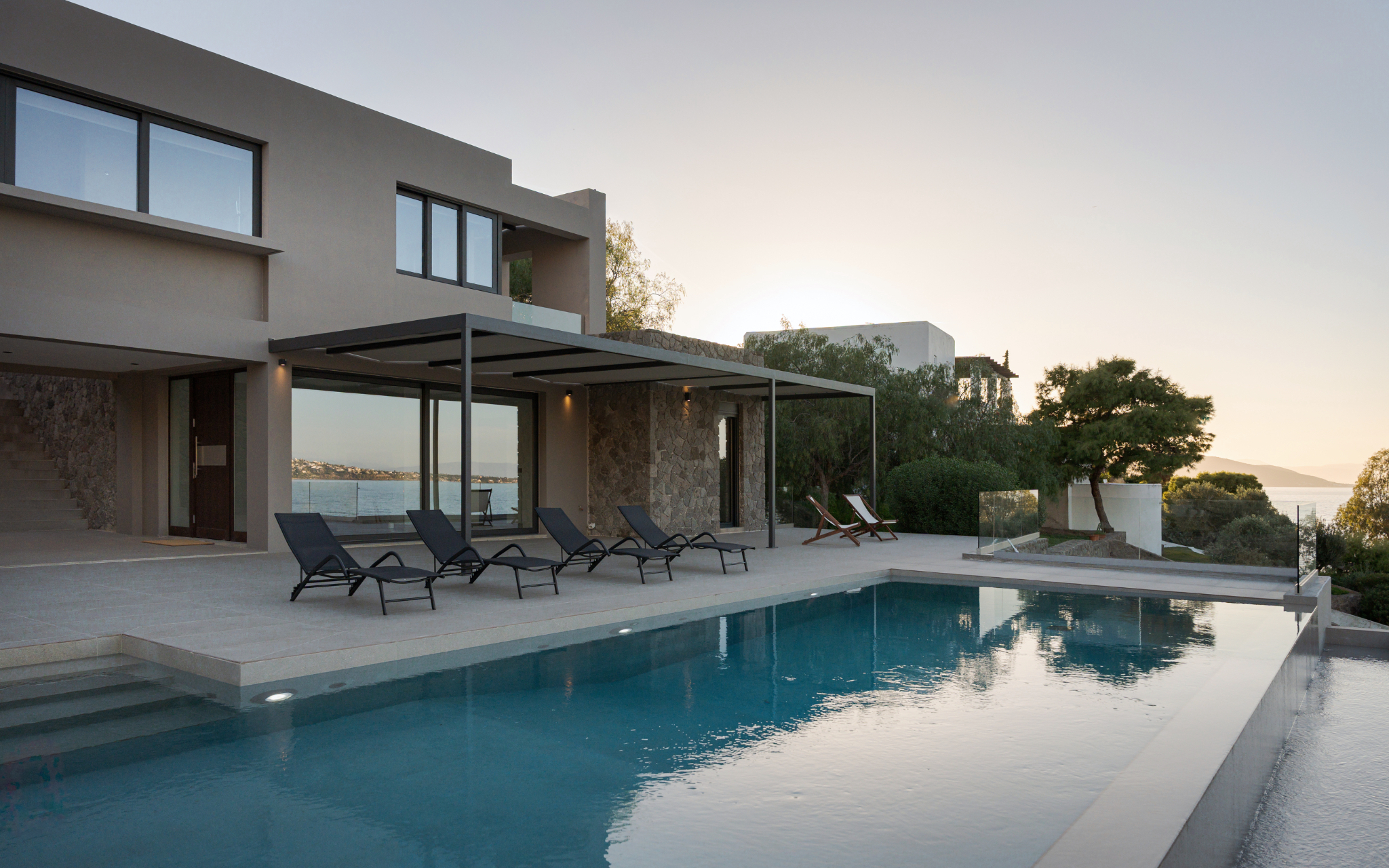 Step outside to the villa’s highlight: a breathtaking outdoor area that feels like your own private resort. The expansive terrace leads to a large infinity-style swimming pool that visually merges with the sea, creating an unforgettable backdrop. Around the pool, you’ll find sun loungers for endless relaxation, as well as shaded sitting areas perfect for reading, socializing, or simply taking in the scenery.