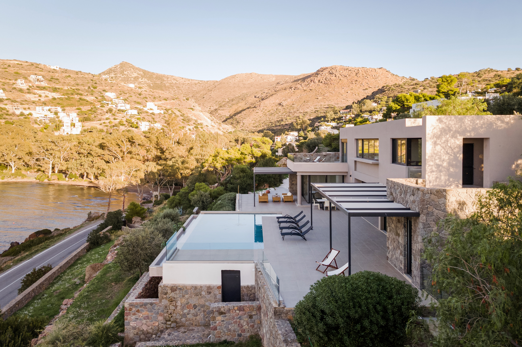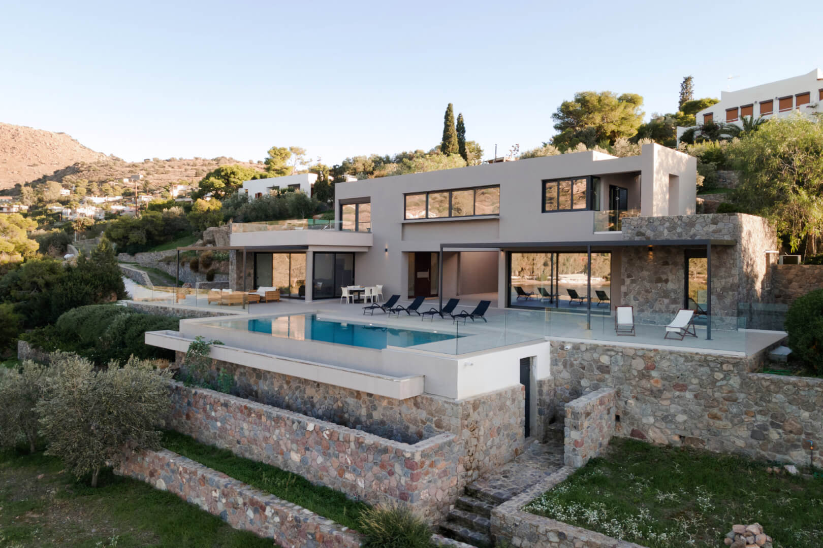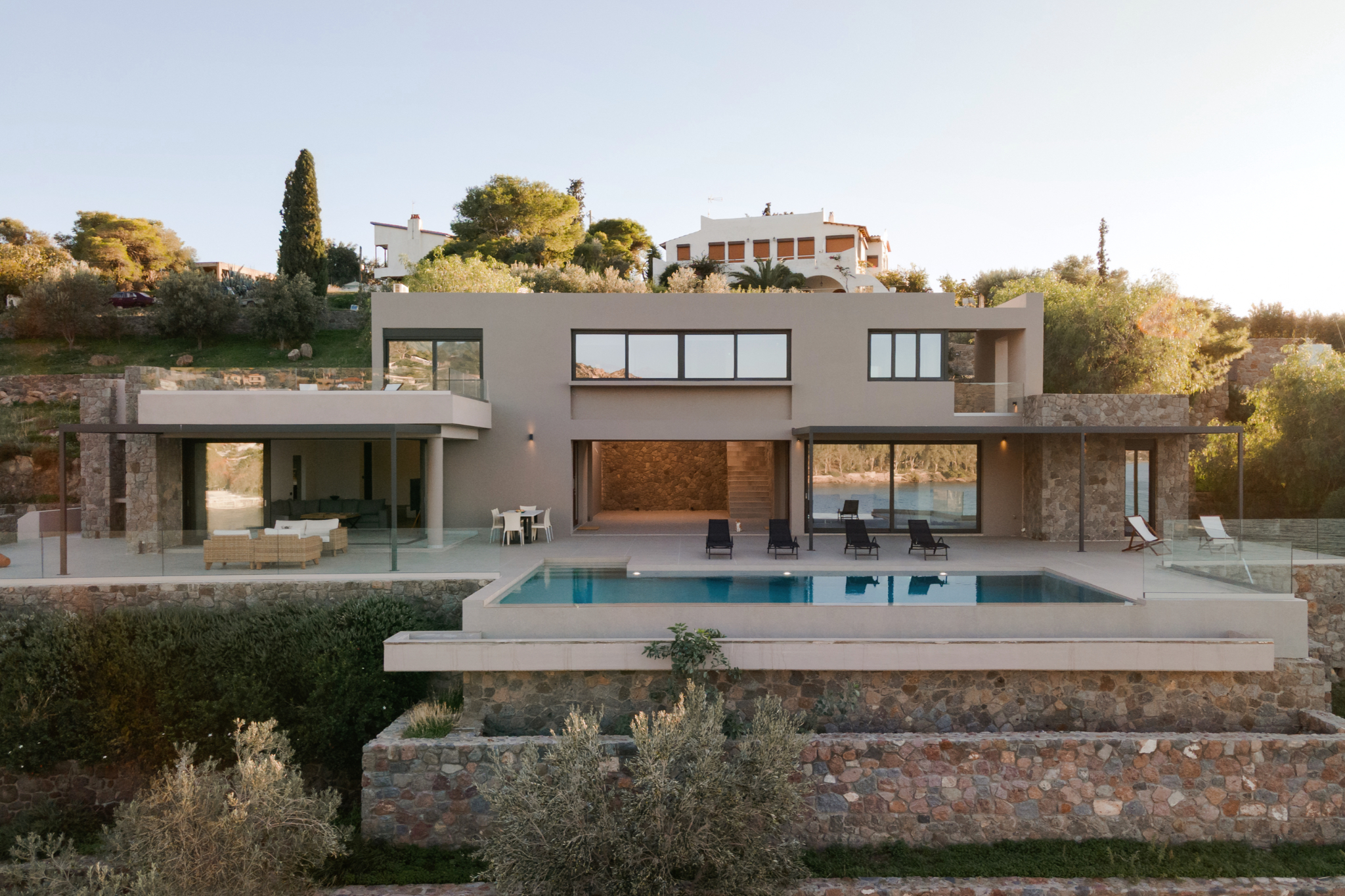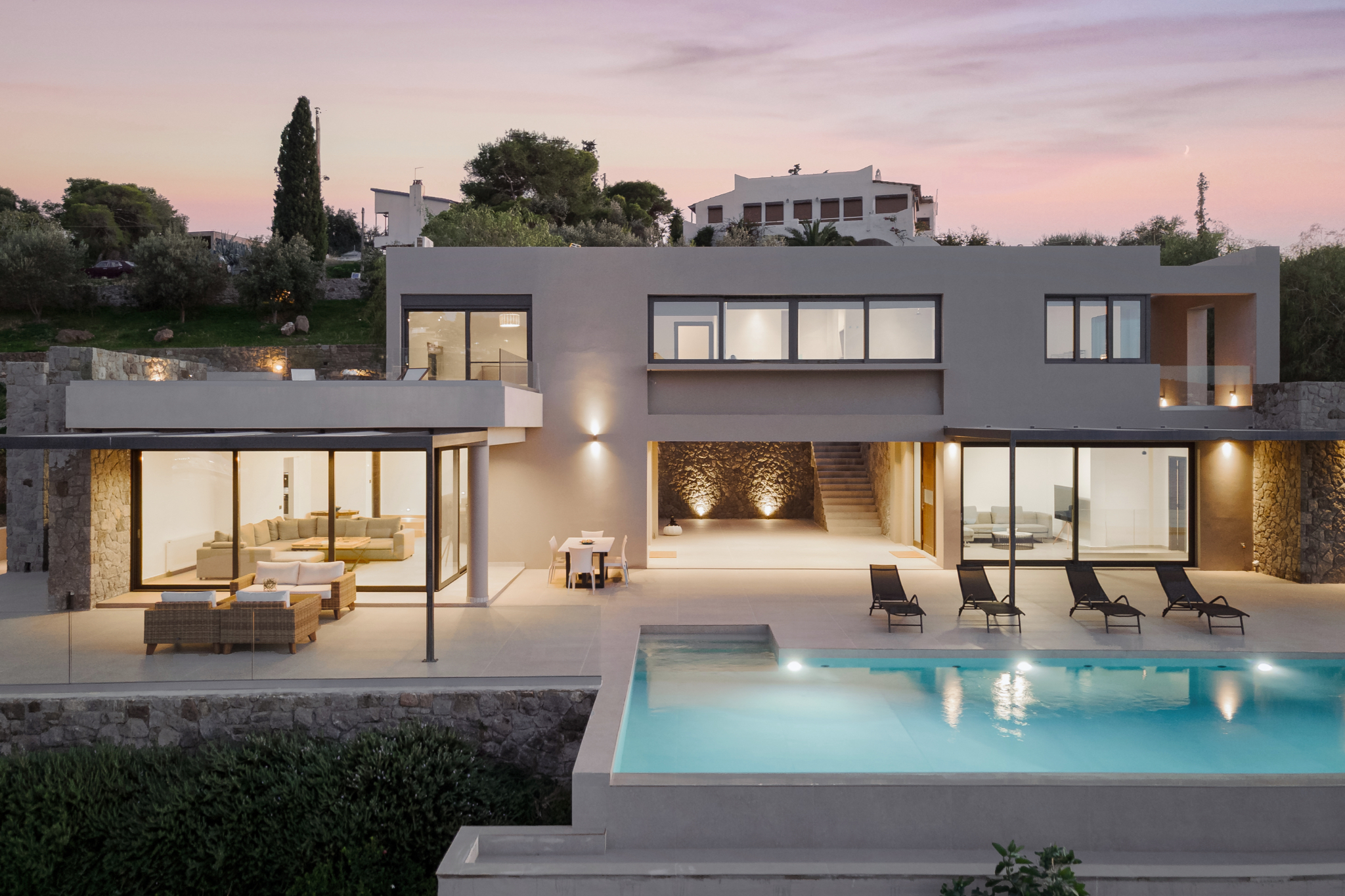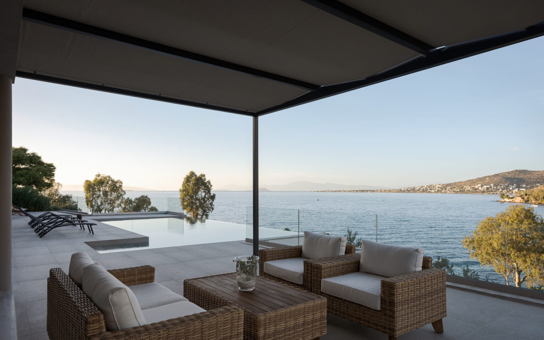 Step outside to the villa’s highlight: a breathtaking outdoor area that feels like your own private resort. The expansive terrace leads to a large infinity-style swimming pool that visually merges with the sea, creating an unforgettable backdrop. Around the pool, you’ll find sun loungers for endless relaxation, as well as shaded sitting areas perfect for reading, socializing, or simply taking in the scenery.