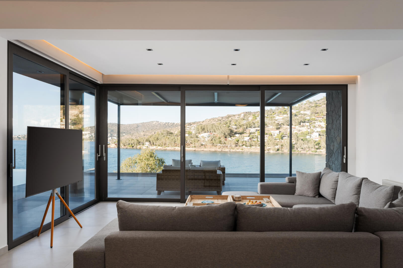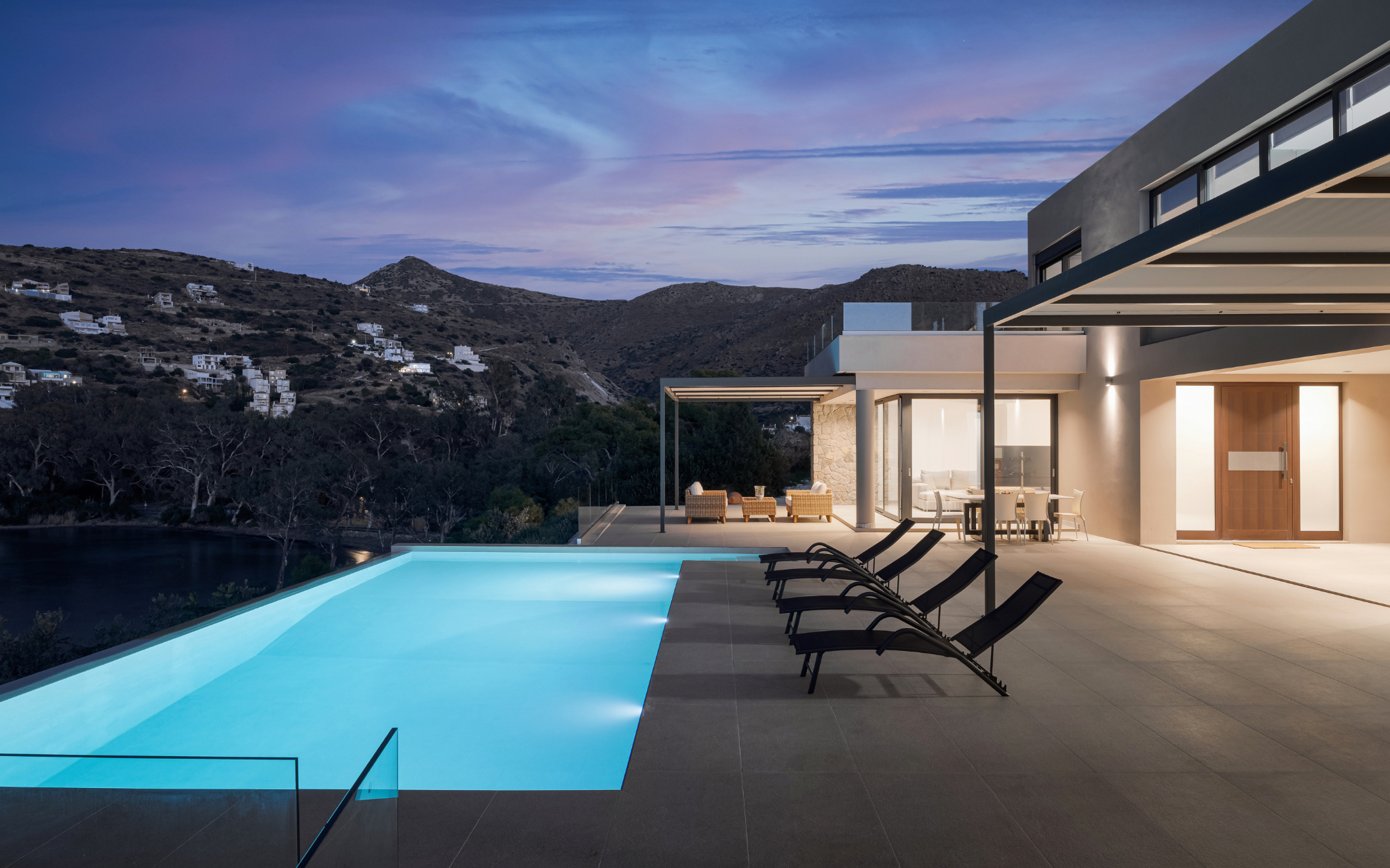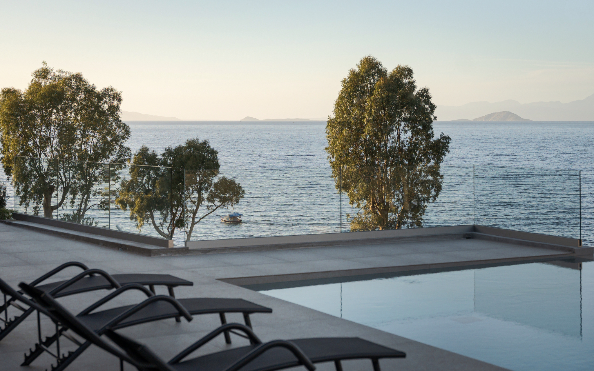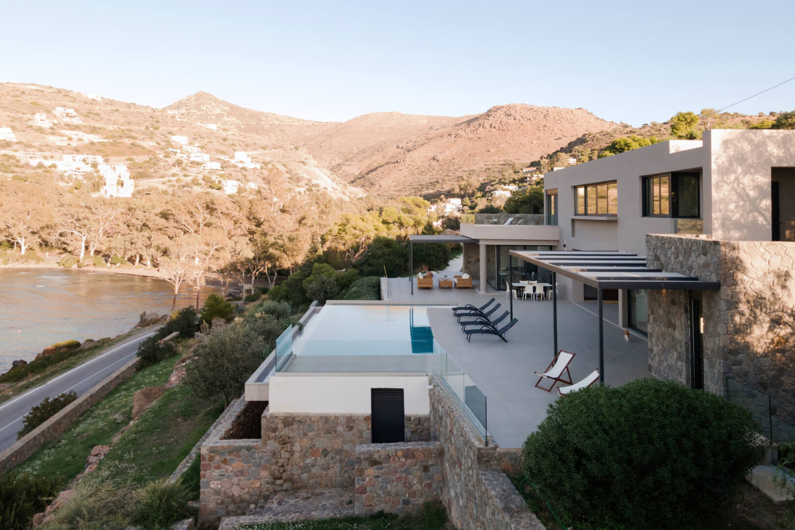 Step outside to the villa’s highlight: a breathtaking outdoor area that feels like your own private resort. The expansive terrace leads to a large infinity-style swimming pool that visually merges with the sea, creating an unforgettable backdrop. Around the pool, you’ll find sun loungers for endless relaxation, as well as shaded sitting areas perfect for reading, socializing, or simply taking in the scenery.