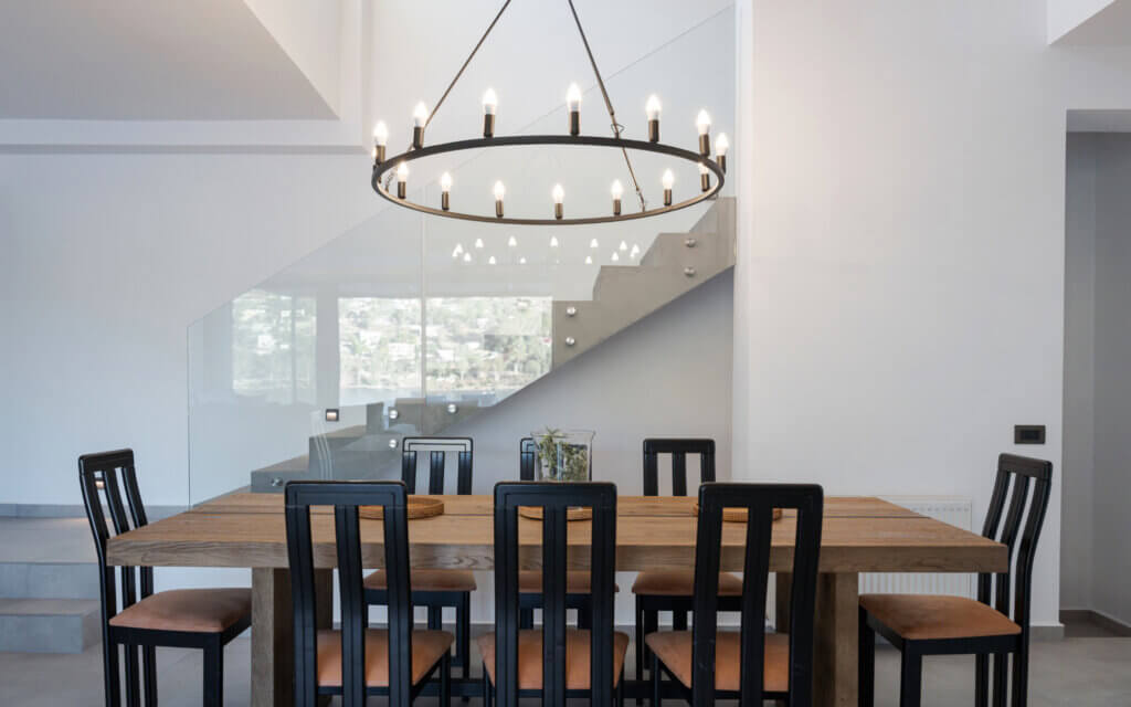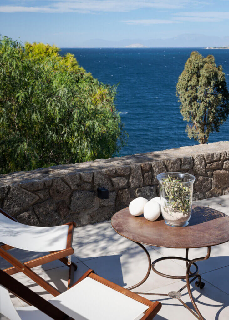 For outdoor dining, the villa offers ample space including a BBQ area, ideal for long, laid-back summer meals with friends and family, all while overlooking the shimmering blue waters of Aegina.