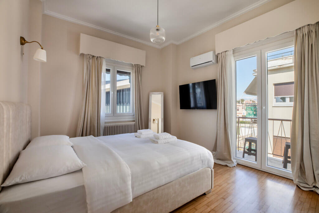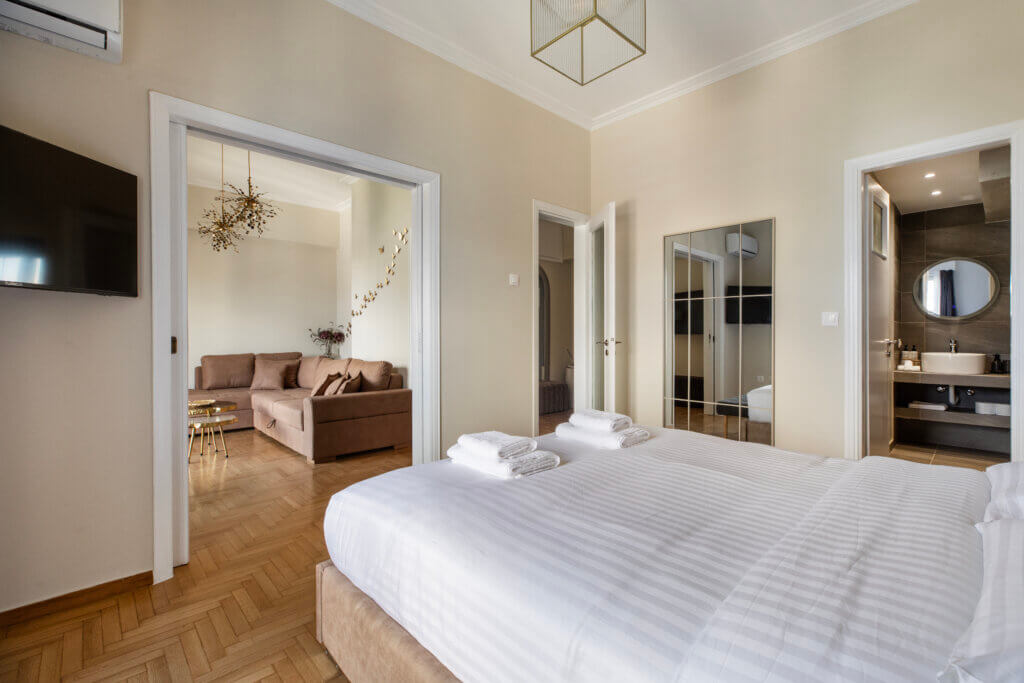 Grand Apollon Villa can accommodate up to 12 guests across its six beautifully appointed bedrooms. Five of these bedrooms feature queen-size beds, while the sixth bedroom offers a single bed and there is also the option of using an extra single sofa bed for additional sleeping arrangements. Each bedroom has its own ensuite bathroom, complete with either a full shower or a bathtub, ensuring privacy and convenience for all guests.