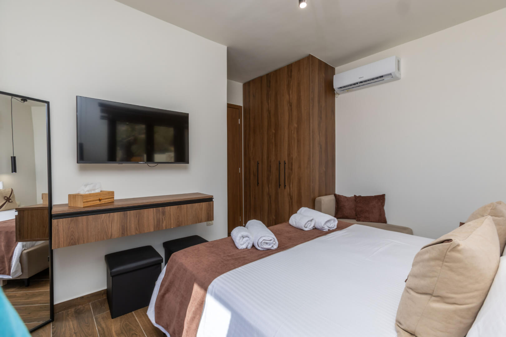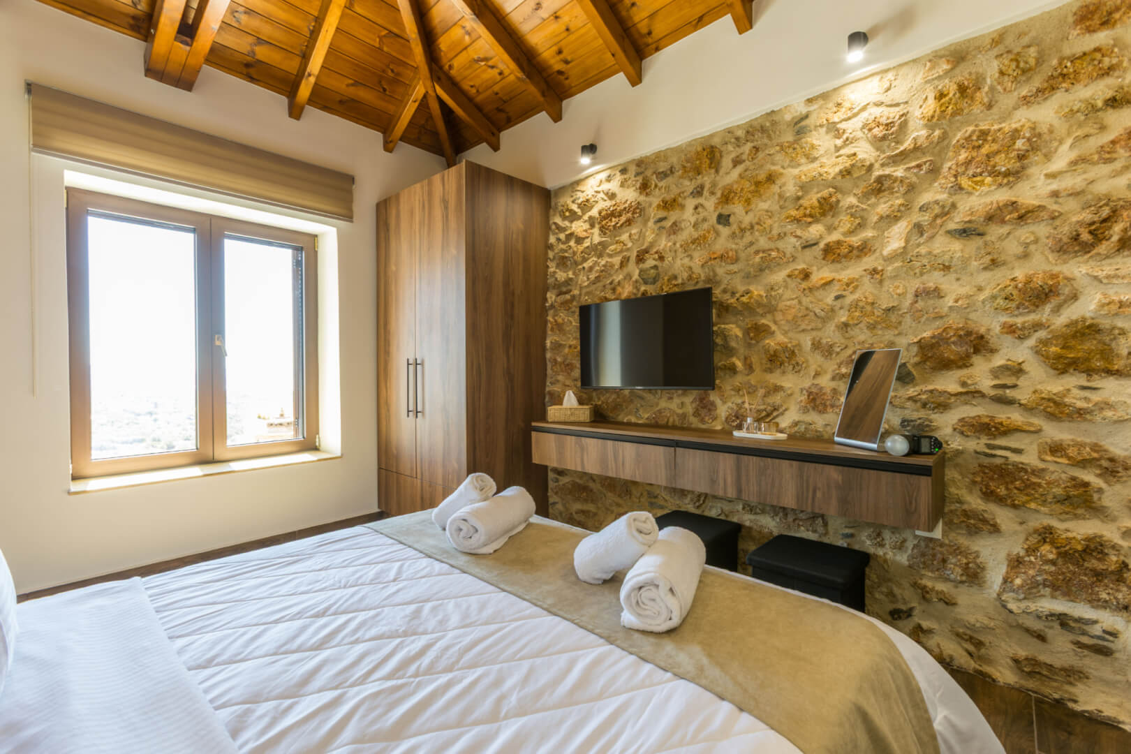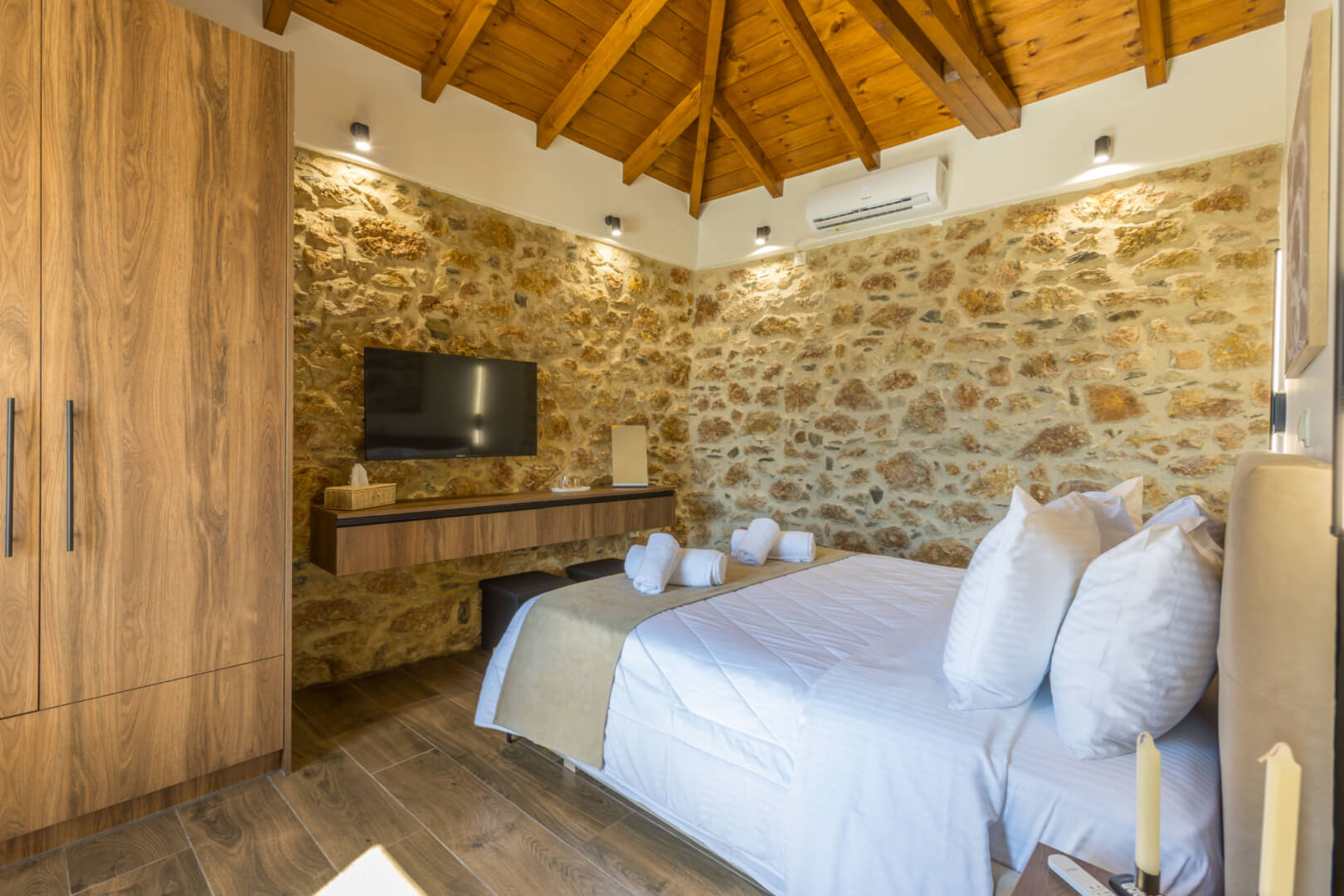 As you move through the villa, you will find two comfortable bedrooms, each furnished with a queen-size bed, comfortably accommodating up to four adults. The villa also features one modern full bathroom, designed with practicality and comfort in mind. Overall, the interior blends modern design with warm details, creating a welcoming and functional living space.