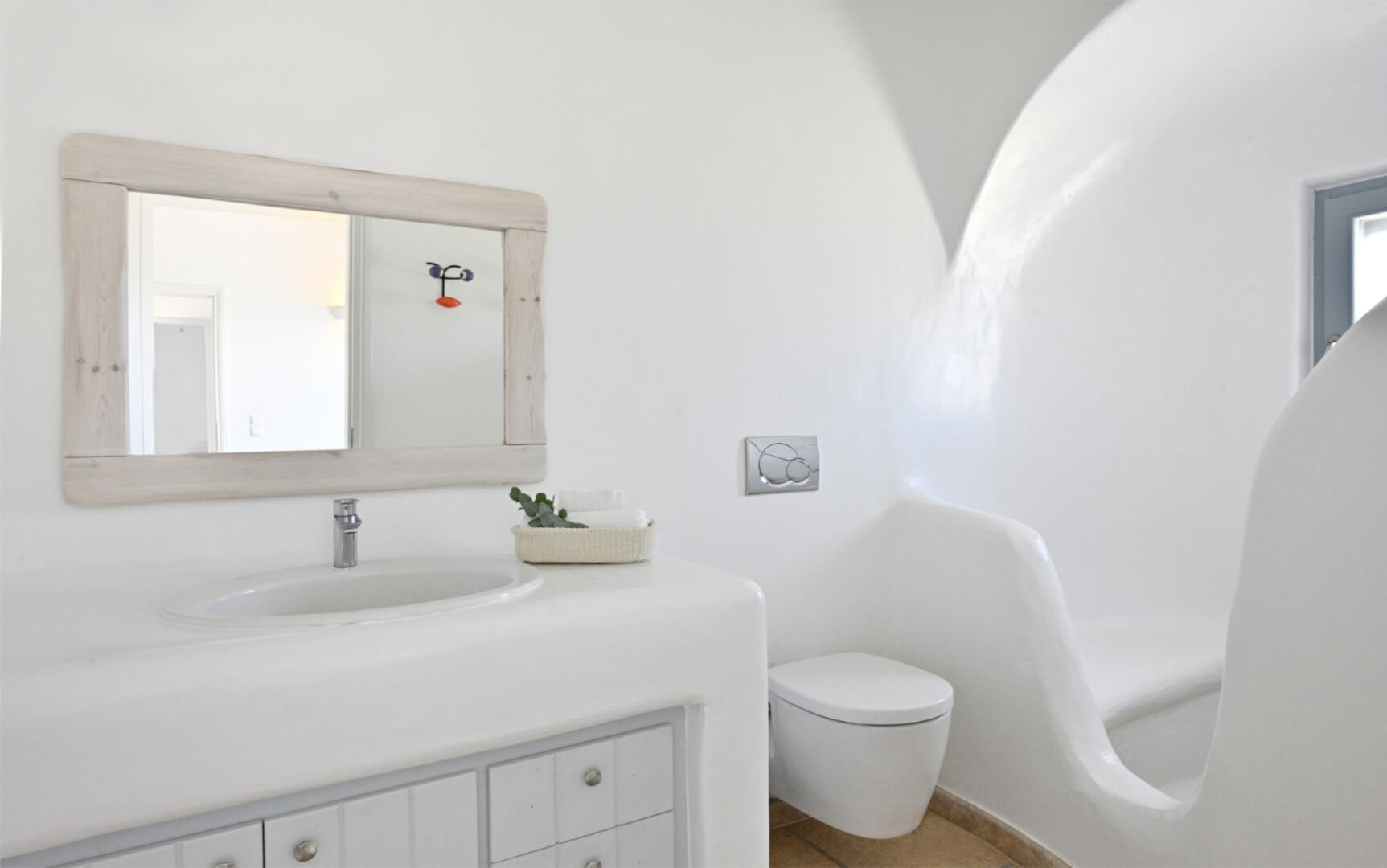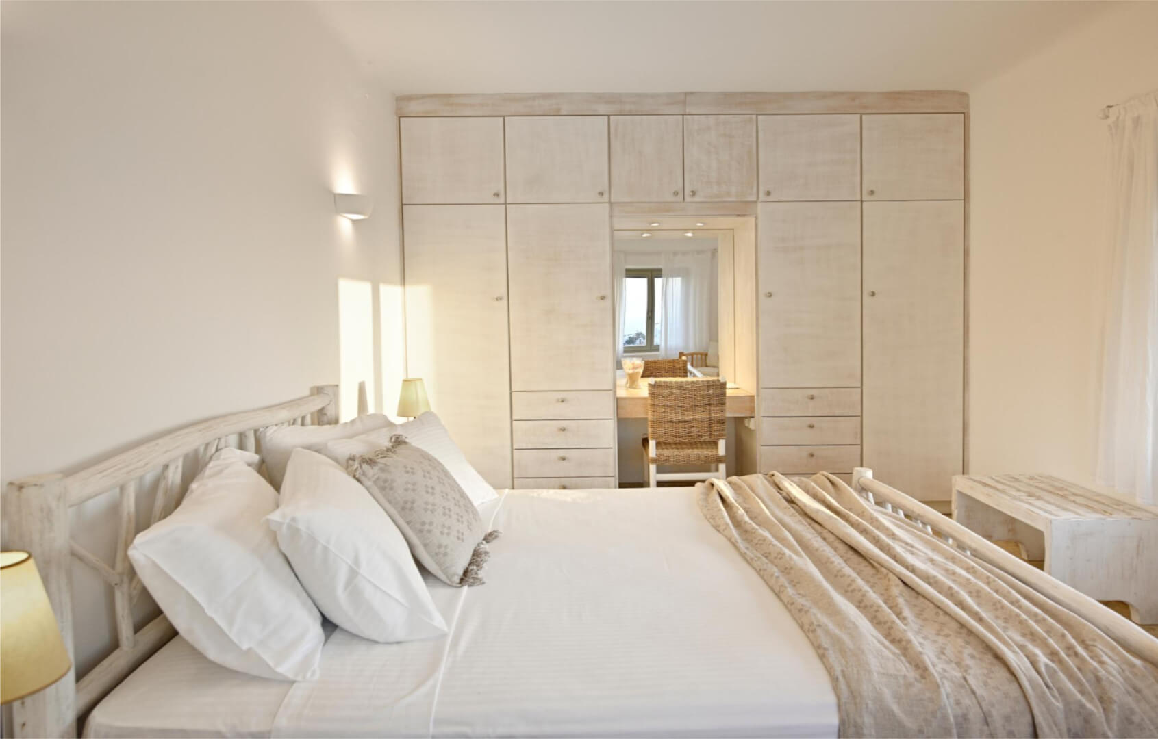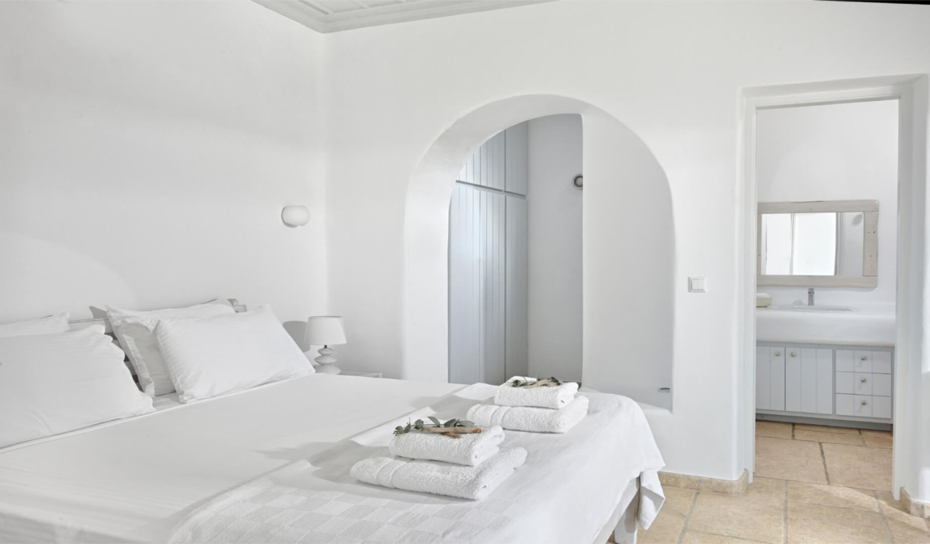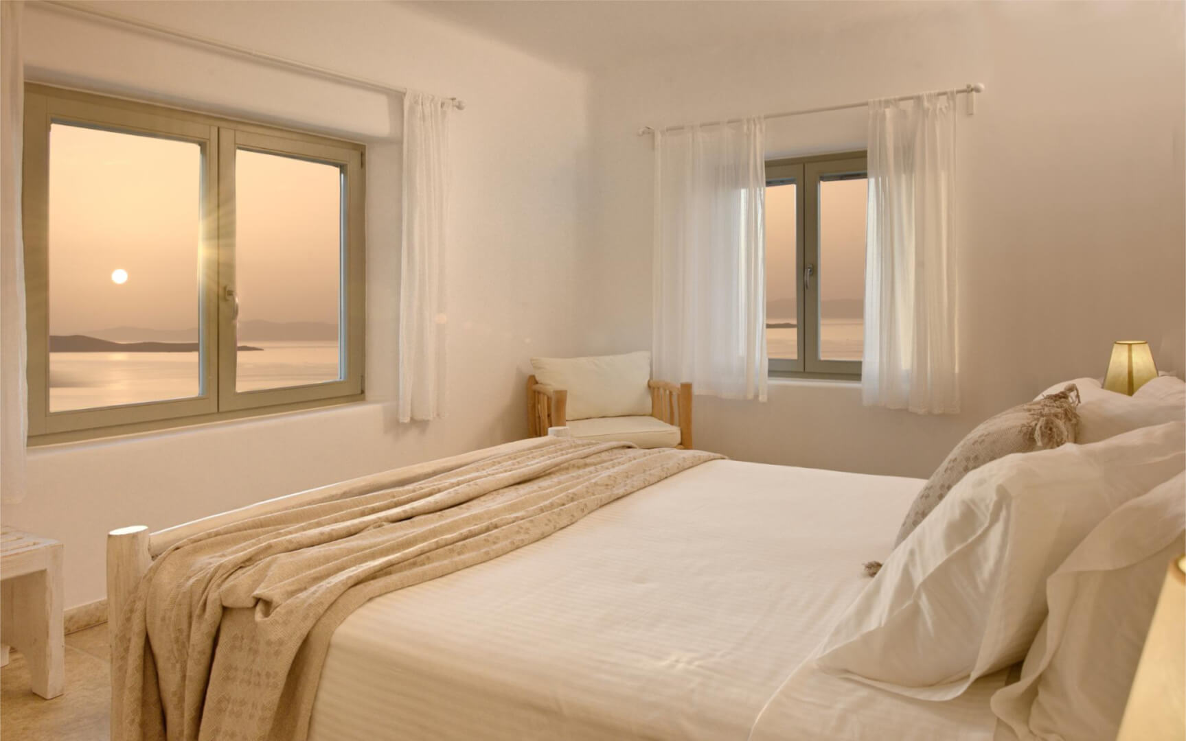 The main villa showcases five en-suite bedrooms across three thoughtfully designed levels, blending traditional Cycladic charm with modern luxury and privacy. The top floor is dedicated to a grand master suite. Complete with a spacious en-suite shower room, a private dressing area, a desk, and two verandas that frame breathtaking panoramic views. The entrance level features an open-plan kitchen, a spacious living and dining area with a fireplace. On the ground floor, four additional en-suite bedrooms, each with private verandas and stunning sea views, offer a haven of tranquility.