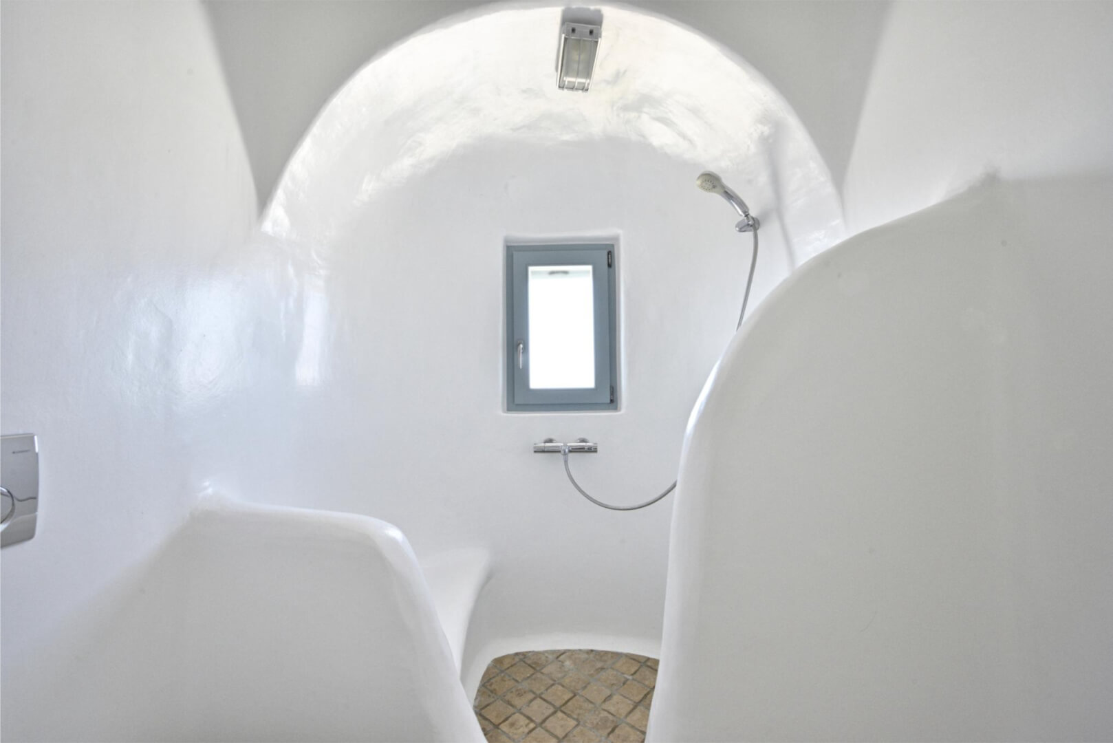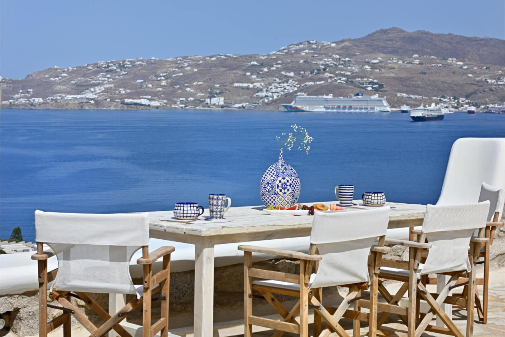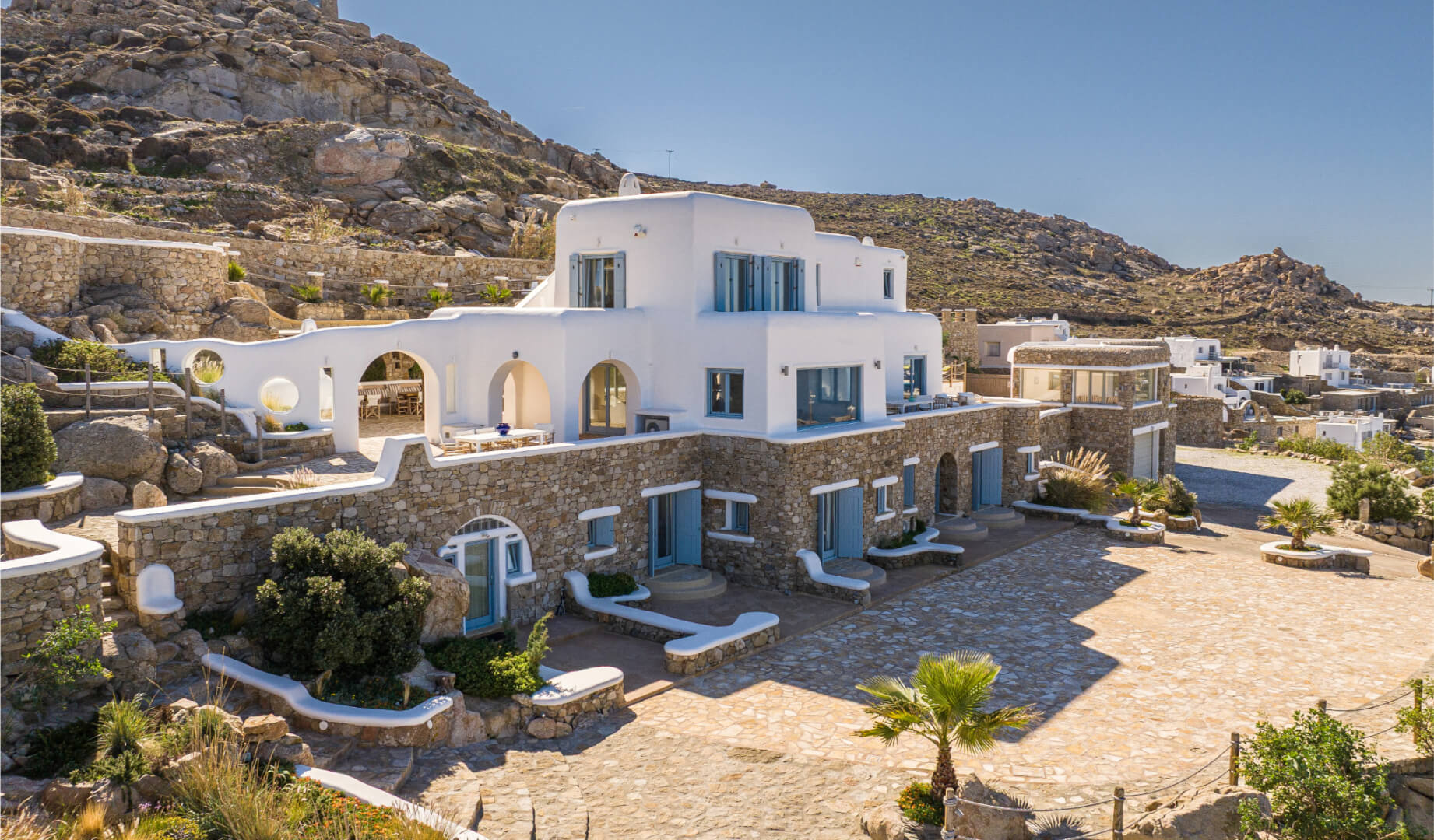 The main villa showcases five en-suite bedrooms across three thoughtfully designed levels, blending traditional Cycladic charm with modern luxury and privacy. The top floor is dedicated to a grand master suite. Complete with a spacious en-suite shower room, a private dressing area, a desk, and two verandas that frame breathtaking panoramic views. The entrance level features an open-plan kitchen, a spacious living and dining area with a fireplace. On the ground floor, four additional en-suite bedrooms, each with private verandas and stunning sea views, offer a haven of tranquility.