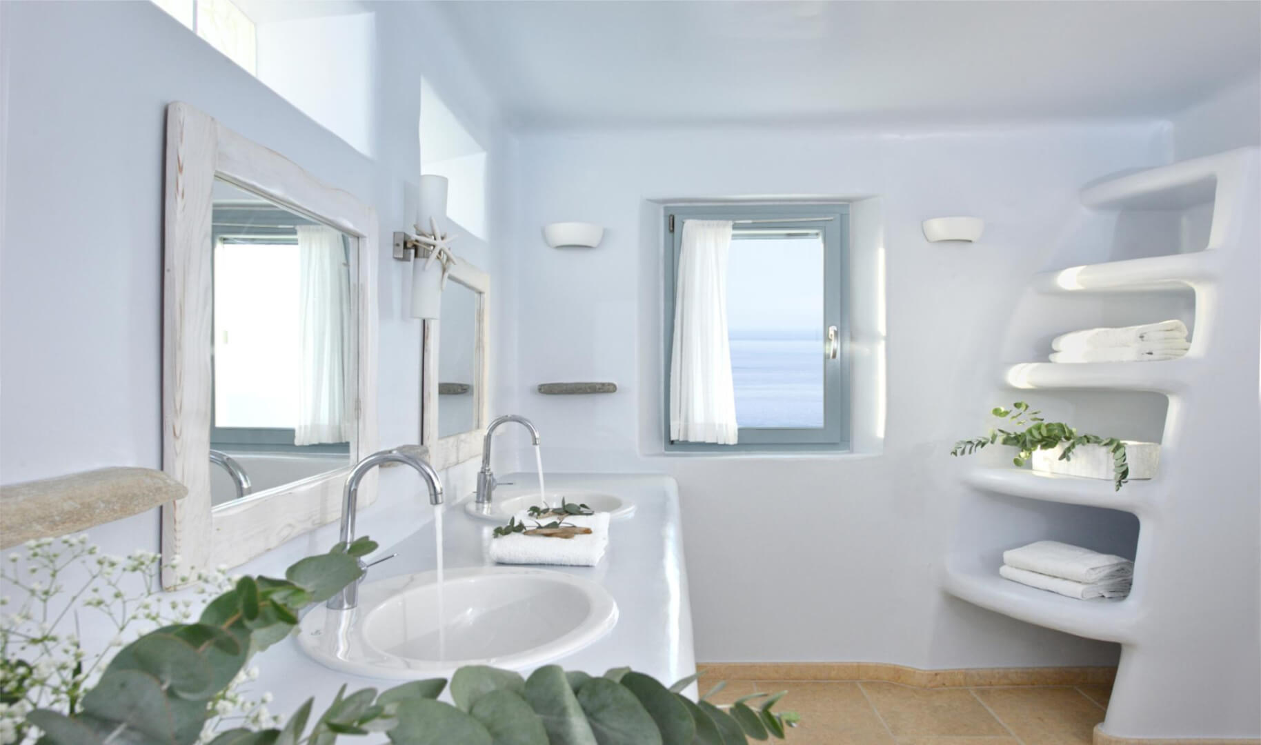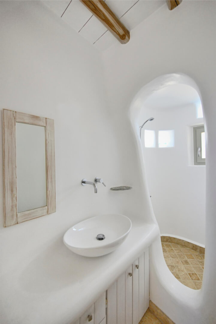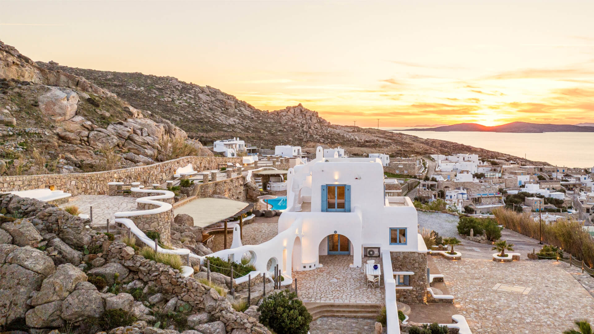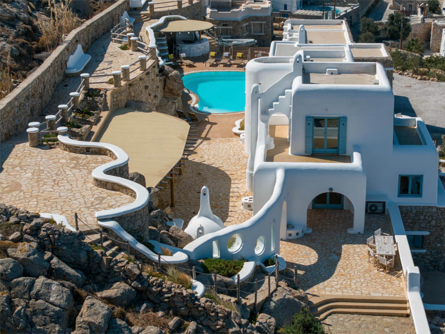 The main villa showcases five en-suite bedrooms across three thoughtfully designed levels, blending traditional Cycladic charm with modern luxury and privacy. The top floor is dedicated to a grand master suite. Complete with a spacious en-suite shower room, a private dressing area, a desk, and two verandas that frame breathtaking panoramic views. The entrance level features an open-plan kitchen, a spacious living and dining area with a fireplace. On the ground floor, four additional en-suite bedrooms, each with private verandas and stunning sea views, offer a haven of tranquility.