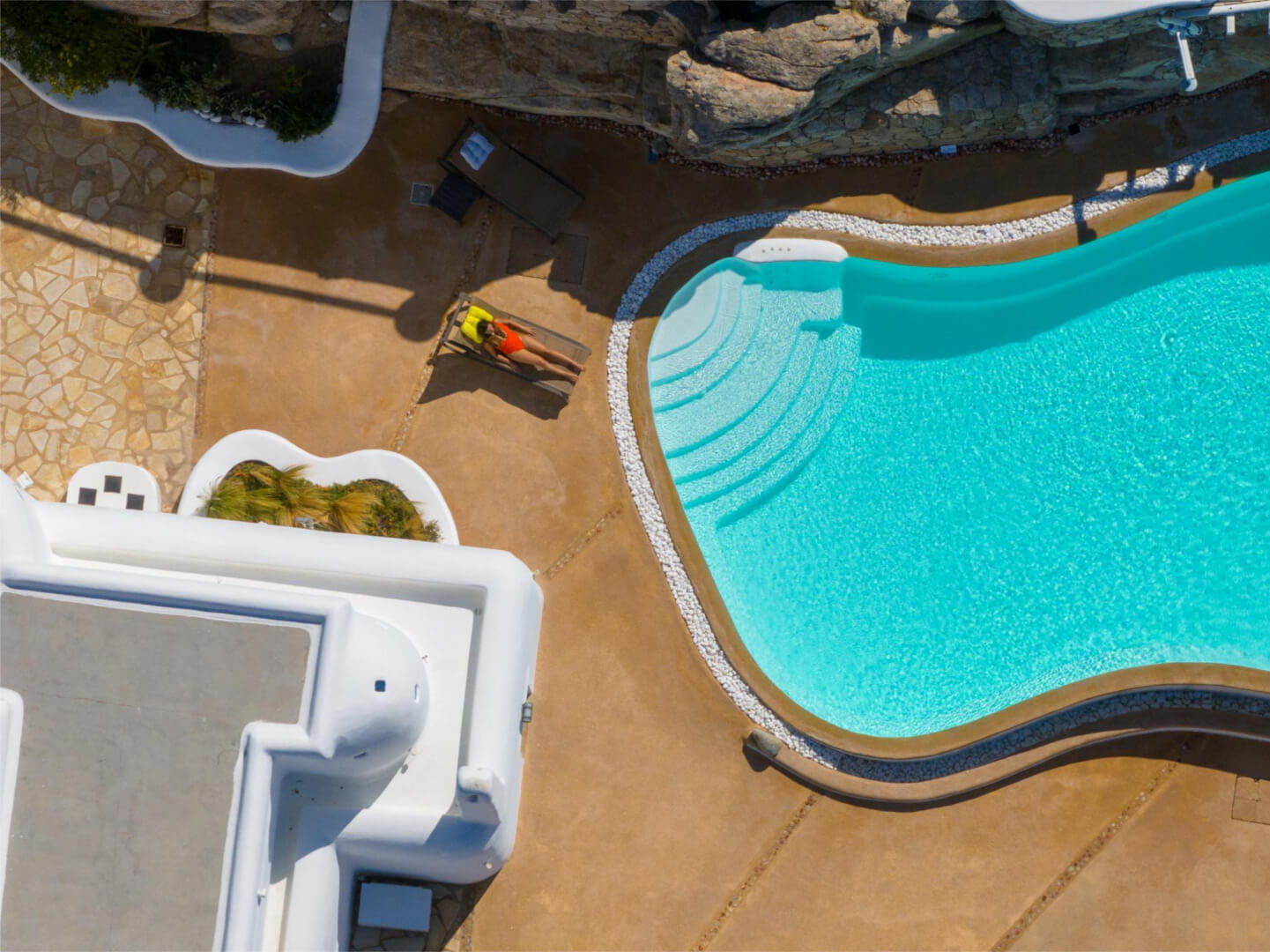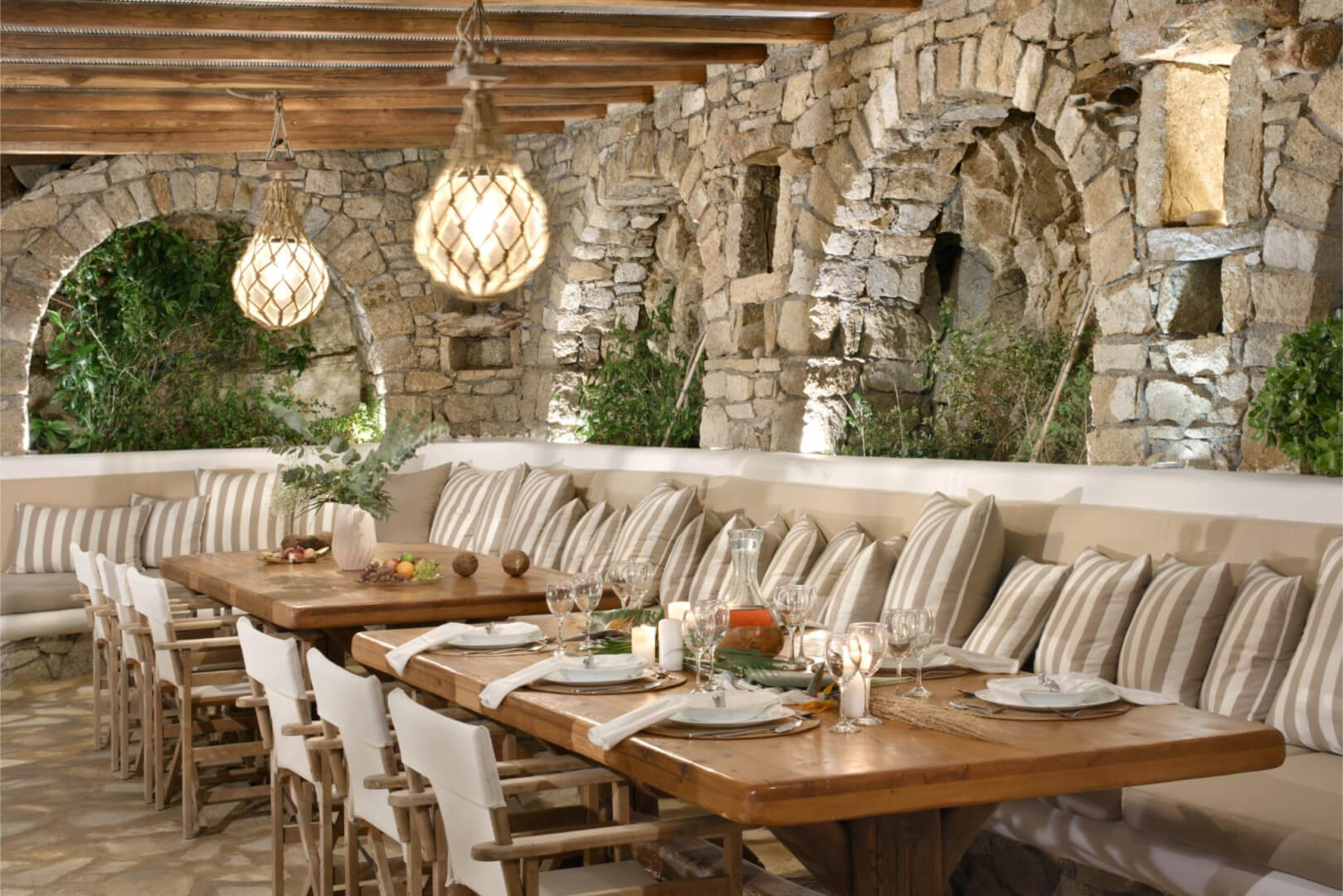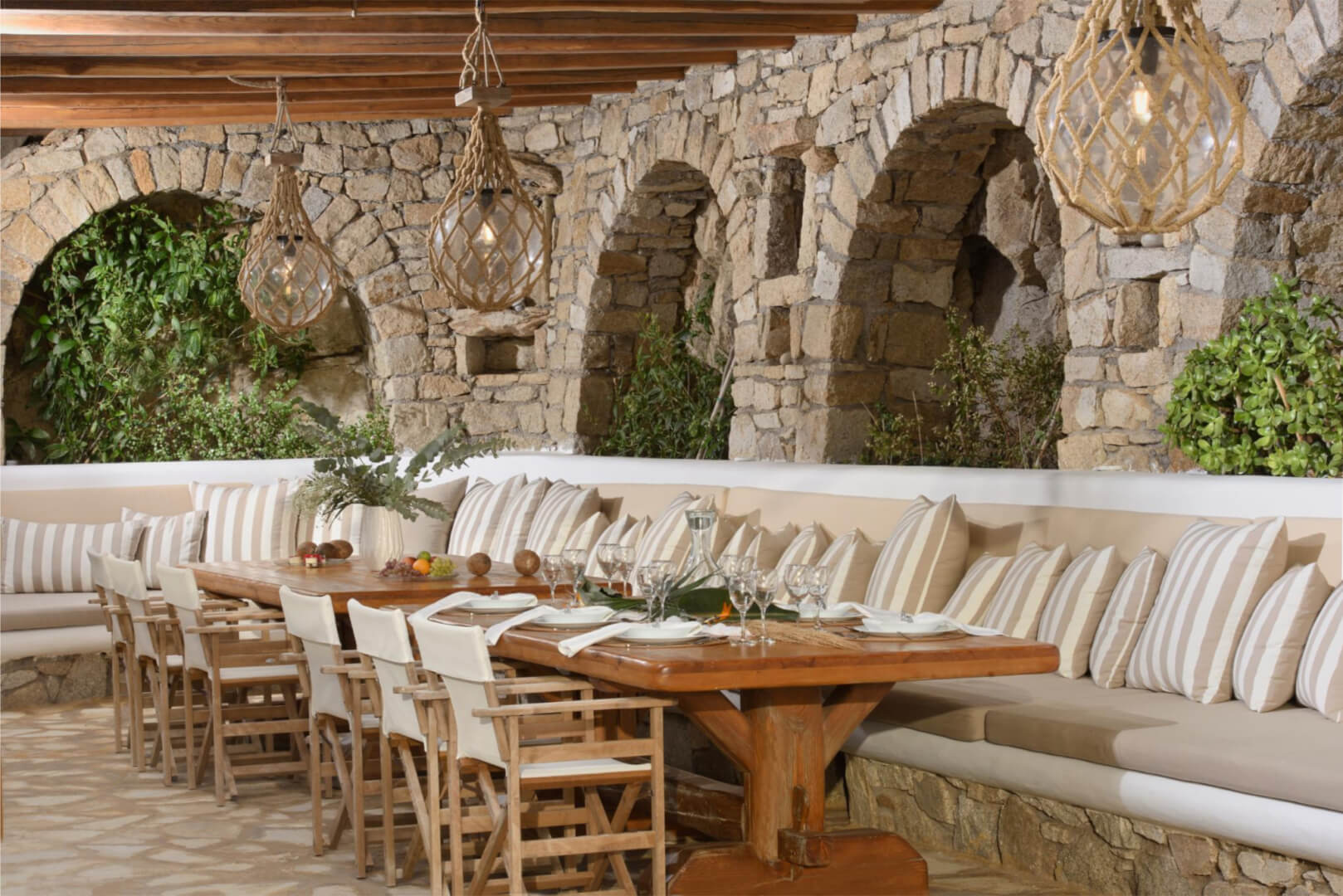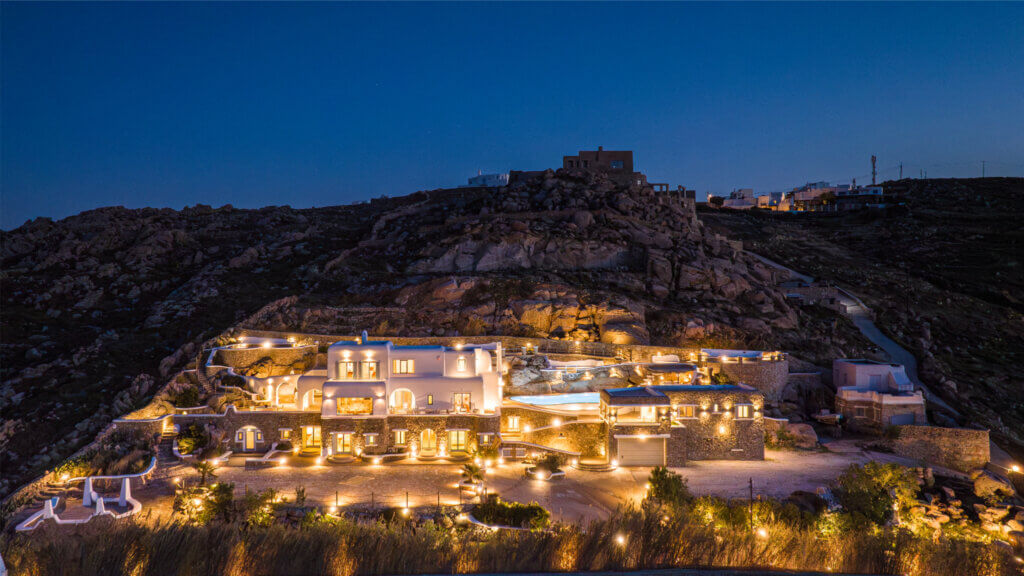 Designed for exceptional outdoor living, the villa’s exterior spaces are a true masterpiece. At the heart is a stunning infinity pool, framed by natural granite rocks for a serene ambiance. Adjacent to the pool, a BBQ area and wood-fired pizza oven set the stage for unforgettable dining experiences. Over 550 sqm of shaded terraces and lounges, equipped with wind shields, provide ample room for relaxation and entertainment, accommodating up to 25 guests. A 500 sqm paved terrace creates the perfect setting for events or receptions, while offering stunning views of the Aegean Sea. As day turns to night, the villa becomes the ideal vintage point for the famed Mykonian sunset, creating unforgettable moments.