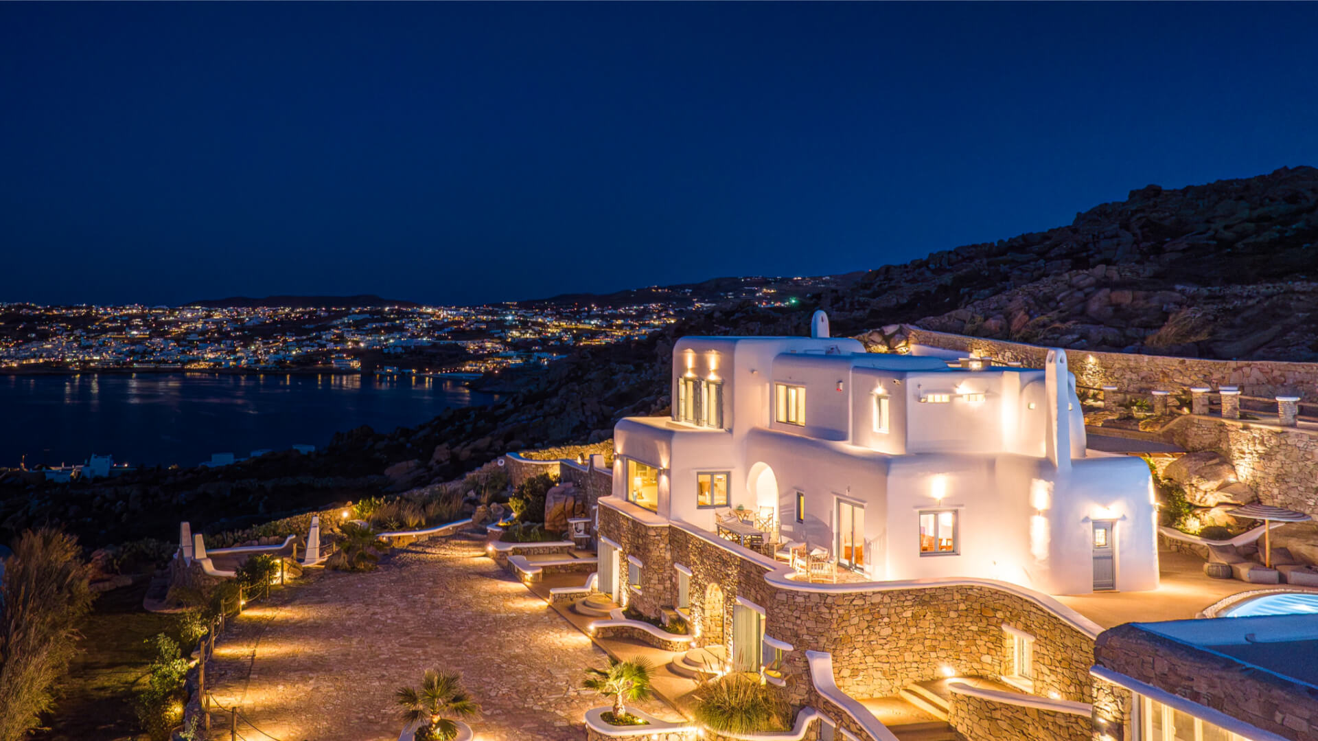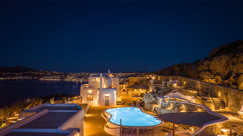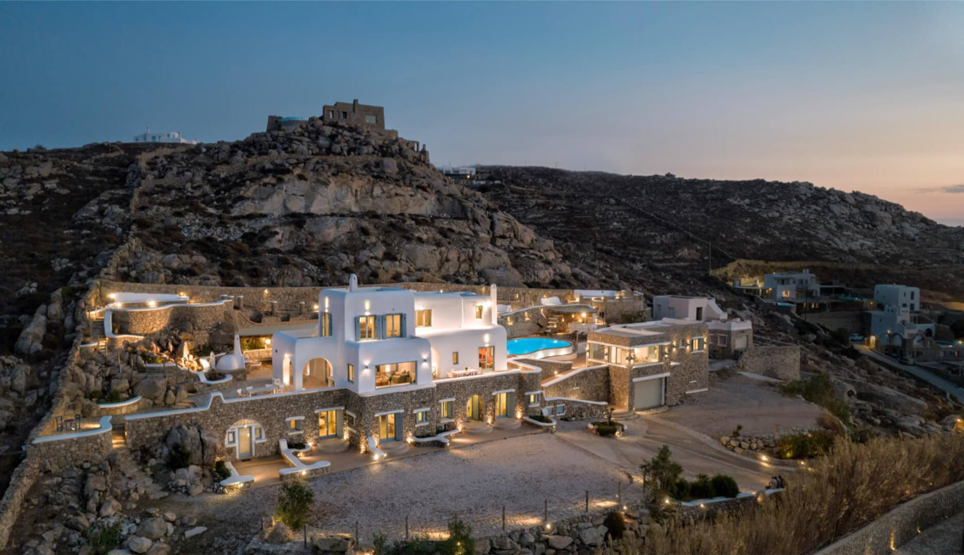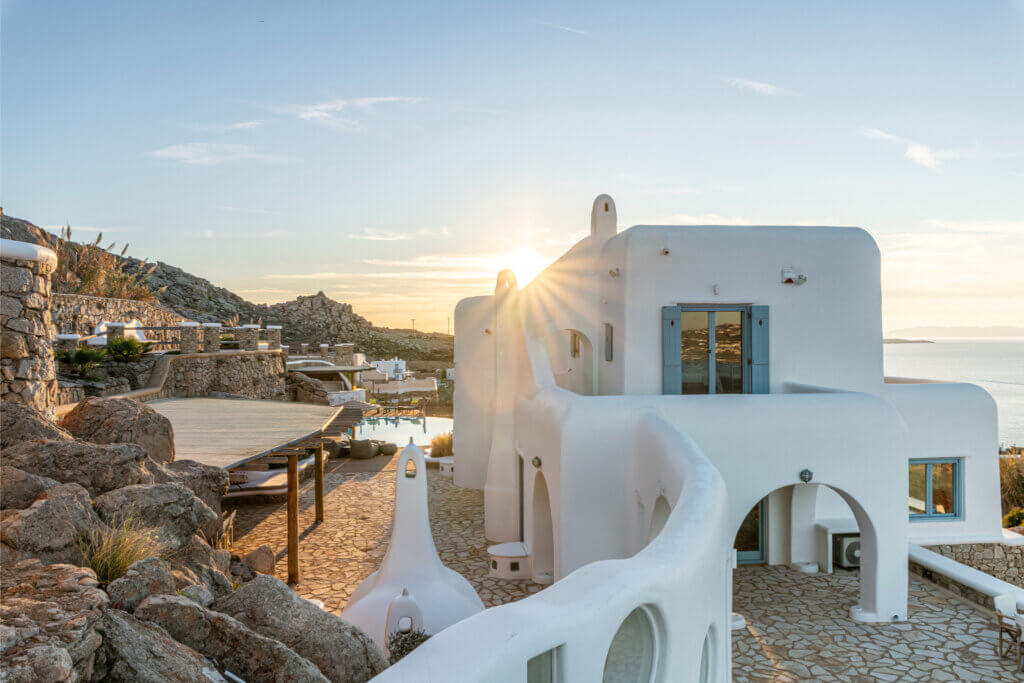 Designed for exceptional outdoor living, the villa’s exterior spaces are a true masterpiece. At the heart is a stunning infinity pool, framed by natural granite rocks for a serene ambiance. Adjacent to the pool, a BBQ area and wood-fired pizza oven set the stage for unforgettable dining experiences. Over 550 sqm of shaded terraces and lounges, equipped with wind shields, provide ample room for relaxation and entertainment, accommodating up to 25 guests. A 500 sqm paved terrace creates the perfect setting for events or receptions, while offering stunning views of the Aegean Sea. As day turns to night, the villa becomes the ideal vintage point for the famed Mykonian sunset, creating unforgettable moments.