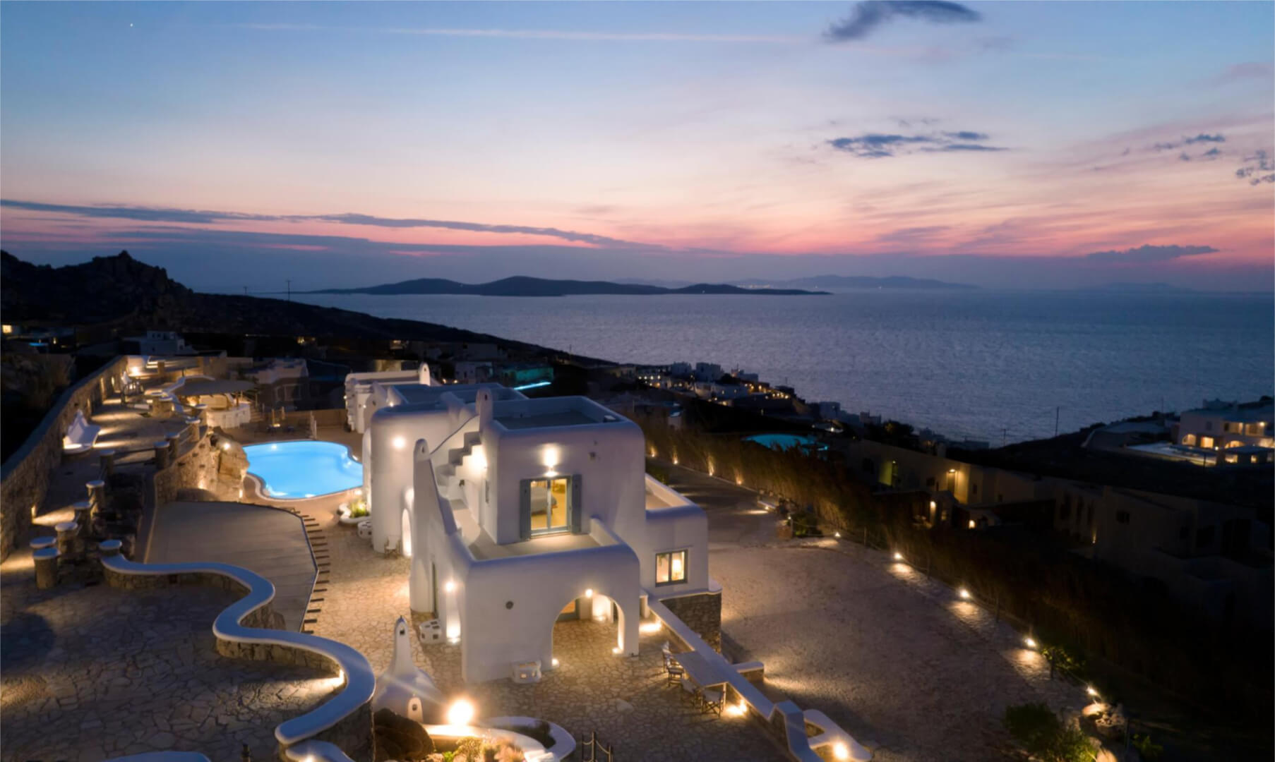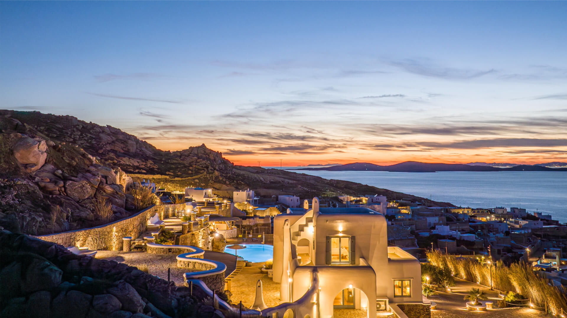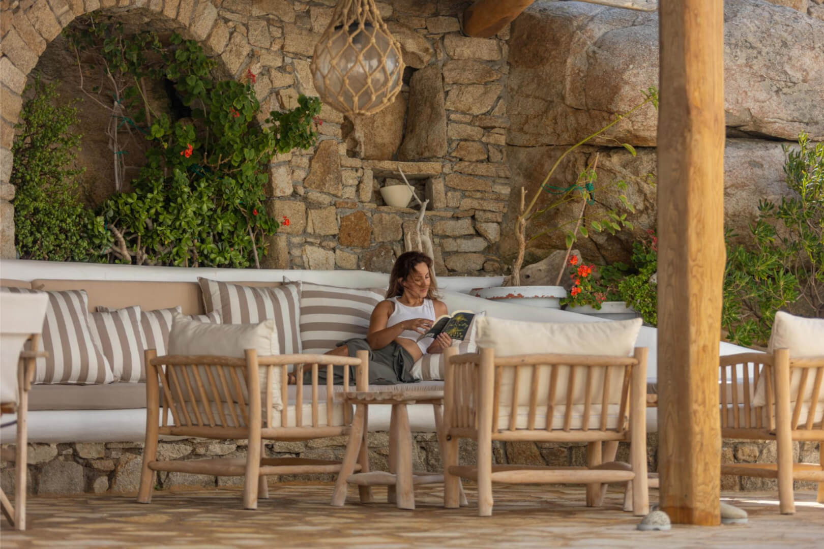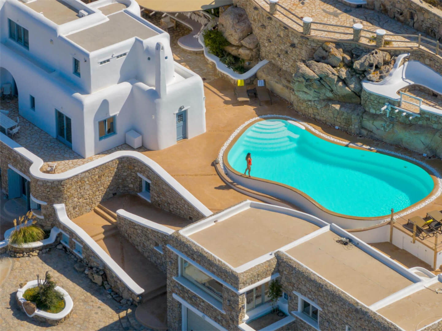 Designed for exceptional outdoor living, the villa’s exterior spaces are a true masterpiece. At the heart is a stunning infinity pool, framed by natural granite rocks for a serene ambiance. Adjacent to the pool, a BBQ area and wood-fired pizza oven set the stage for unforgettable dining experiences. Over 550 sqm of shaded terraces and lounges, equipped with wind shields, provide ample room for relaxation and entertainment, accommodating up to 25 guests. A 500 sqm paved terrace creates the perfect setting for events or receptions, while offering stunning views of the Aegean Sea. As day turns to night, the villa becomes the ideal vintage point for the famed Mykonian sunset, creating unforgettable moments.