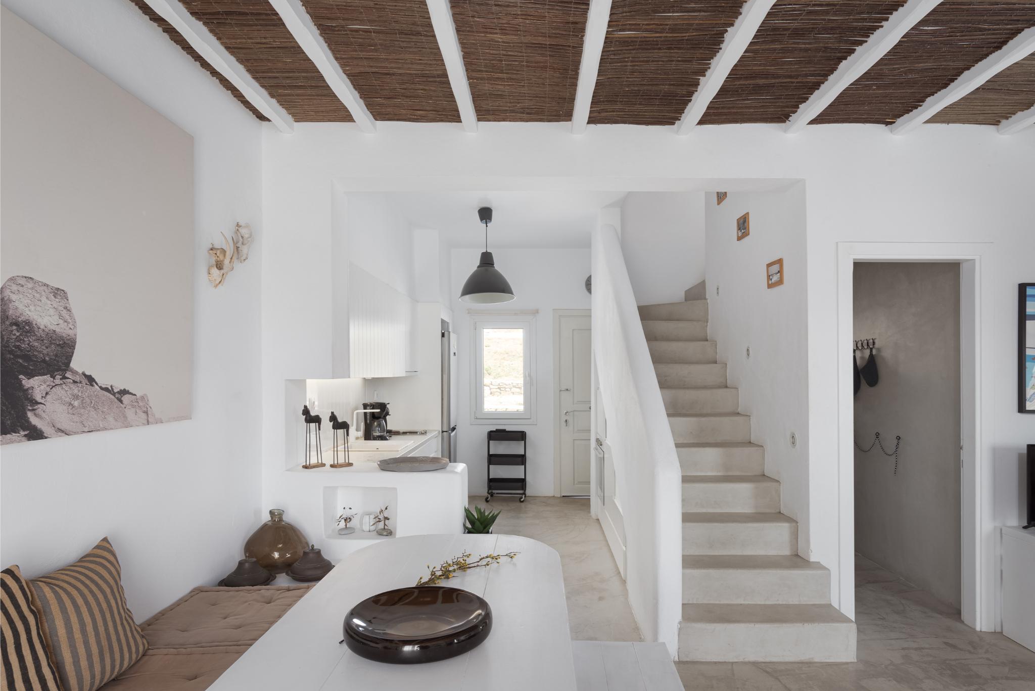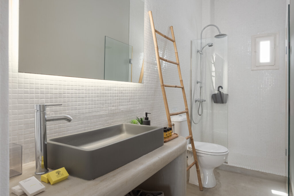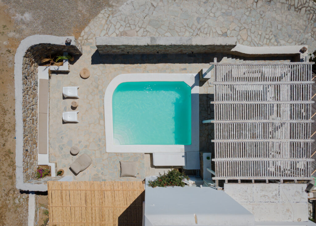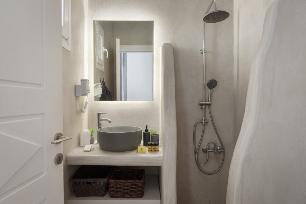 The interior of Lea Villa 1 Mykonos showcases Mediterranean architecture and generous spaces. The villa includes a spacious living room, ideal for relaxation and socializing, and a fully equipped kitchen perfect for preparing delicious meals. The 3 well-appointed bedrooms are designed for comfort, with 2 featuring queen-size beds and one equipped with two twin beds. Additionally, there is an option to accommodate an extra child in a cozy loft bed. The villa boasts 3 modern bathrooms, 2 of which are ensuite and all featuring full showers.